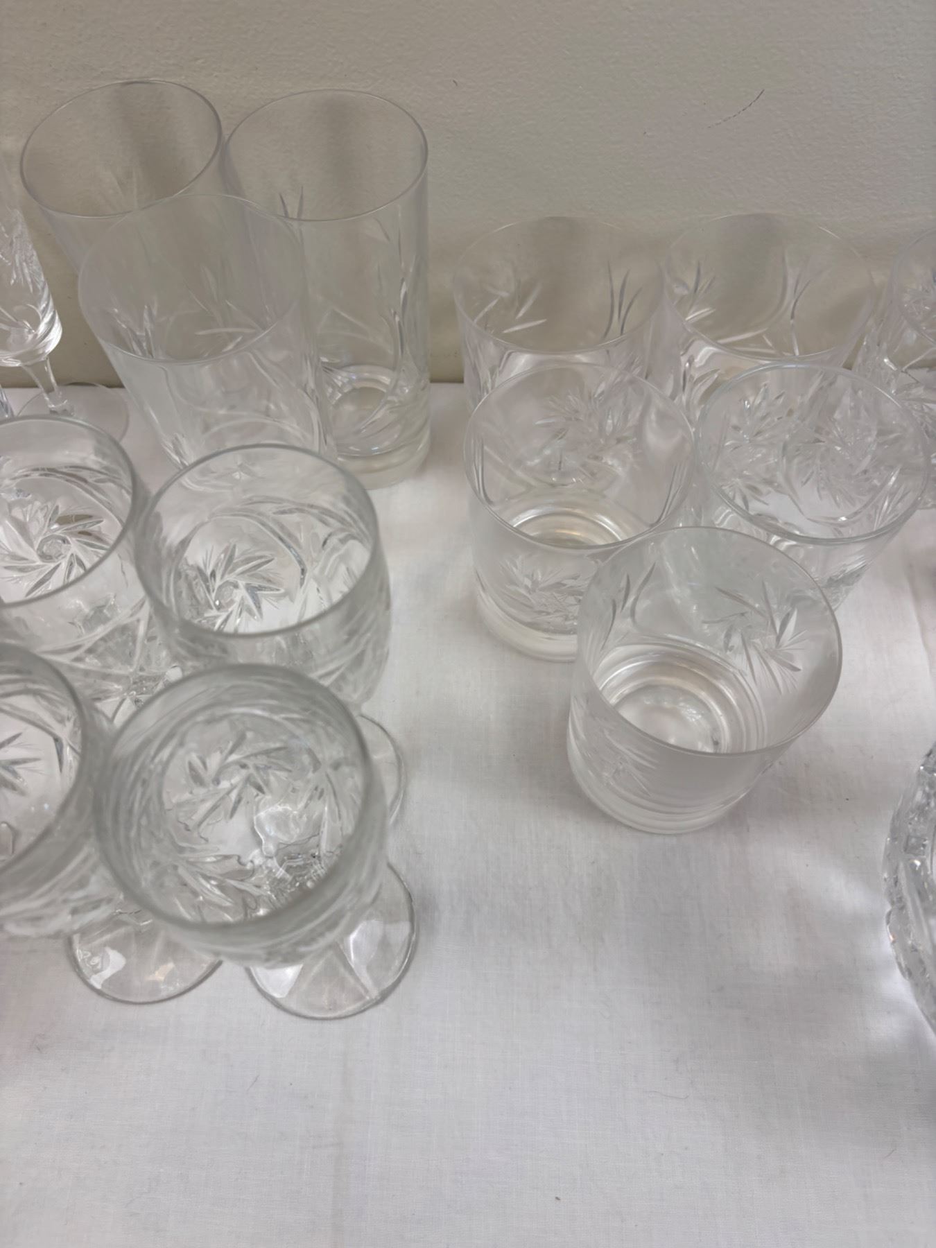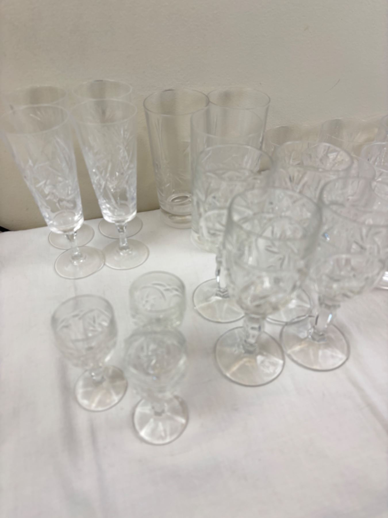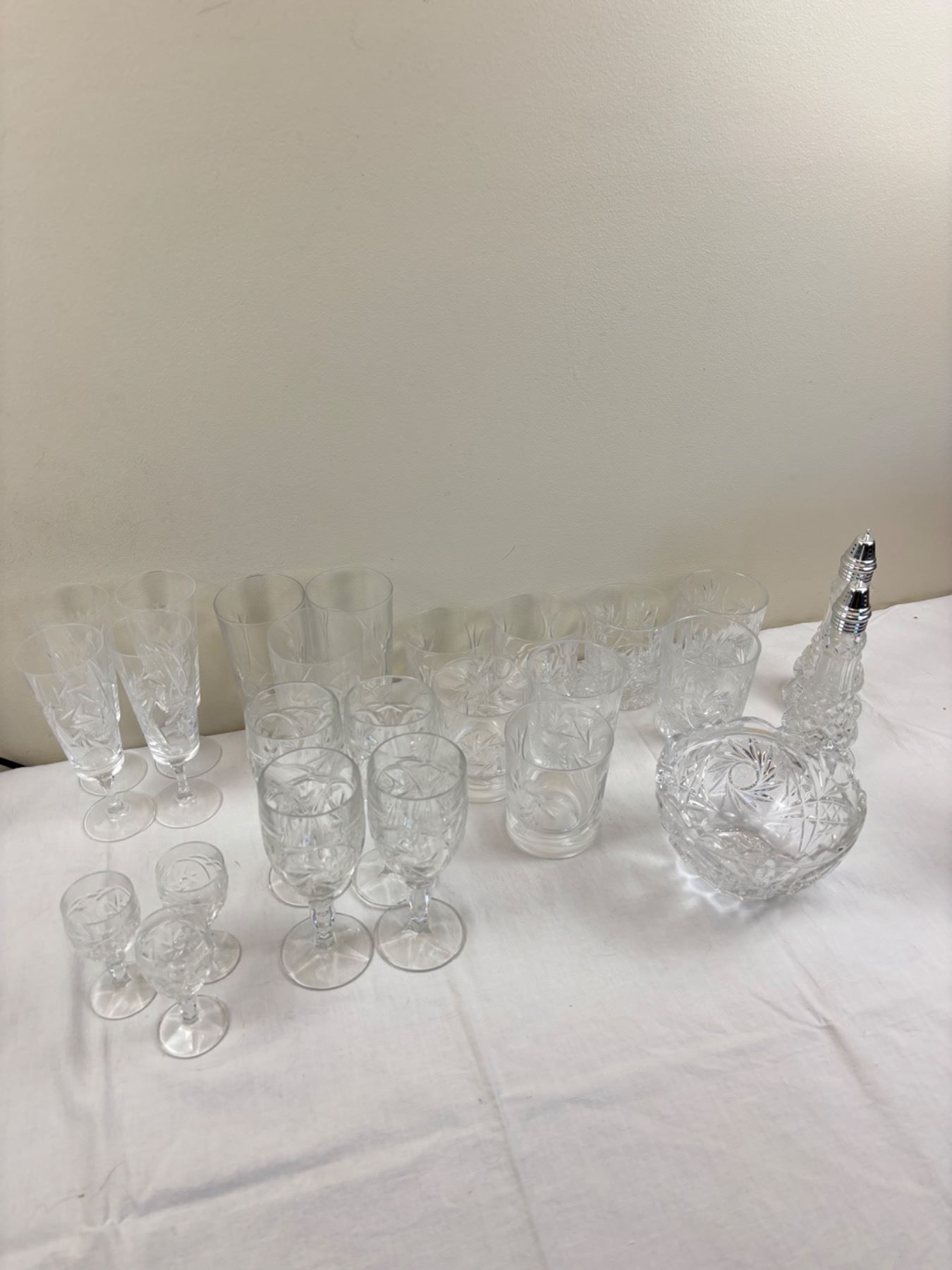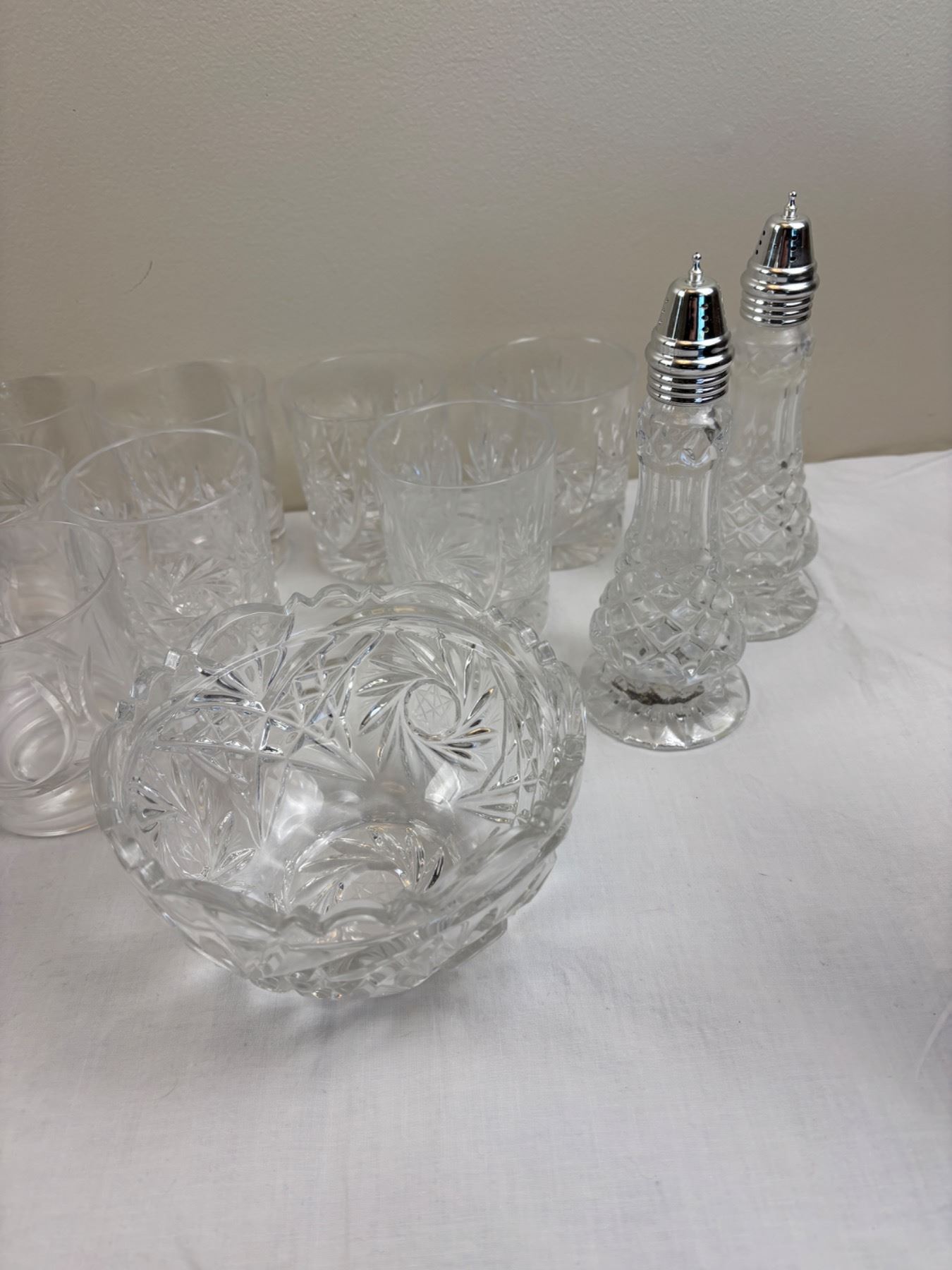 Includes a variety of stemware, salt and pepper shakers, candy bowl, and more
