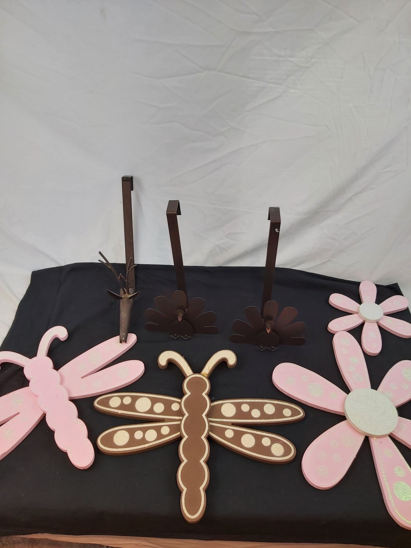 Includes 3 metal door hanging pieces, decorative flowers and dragonfly (has been glued)