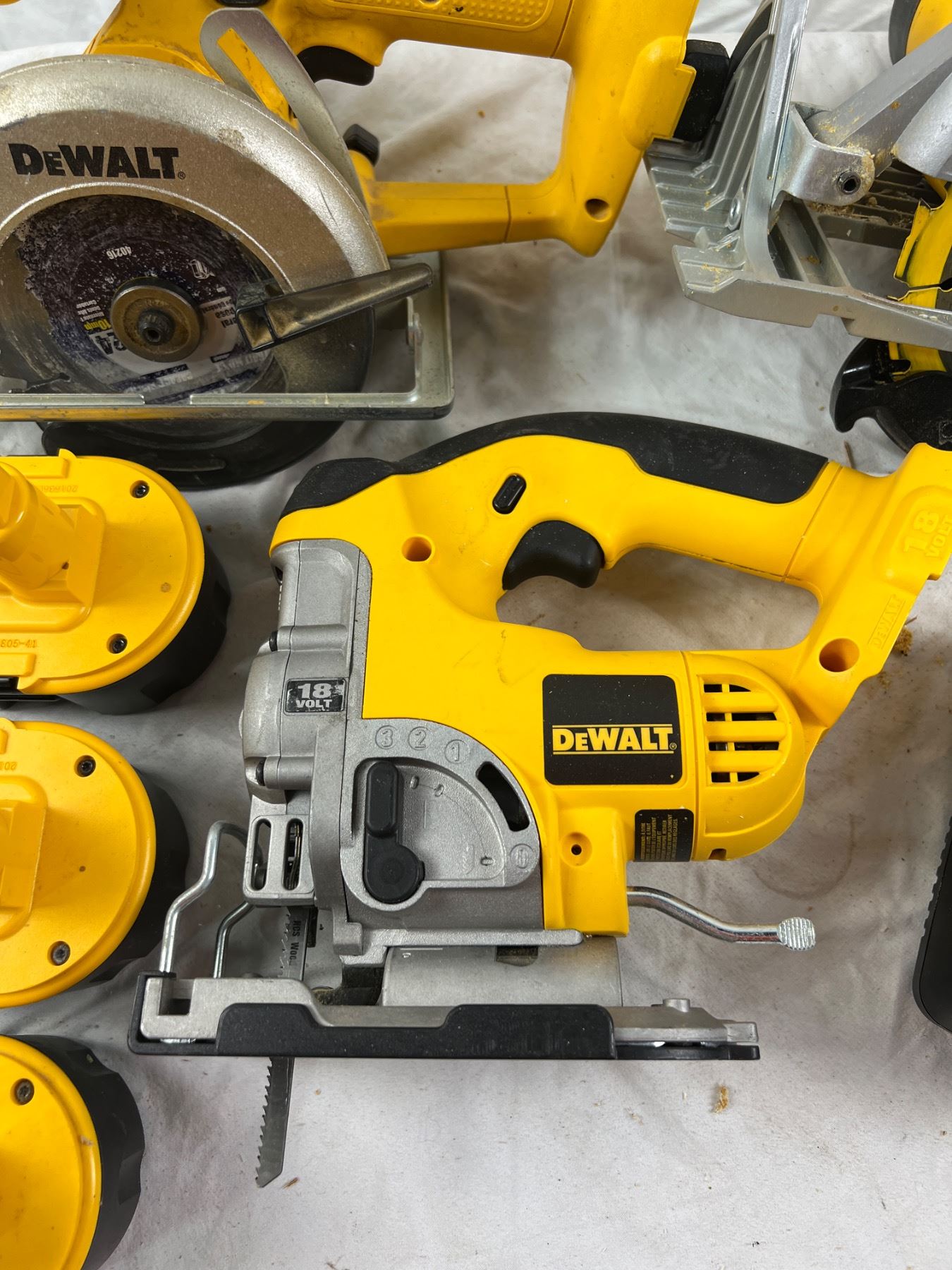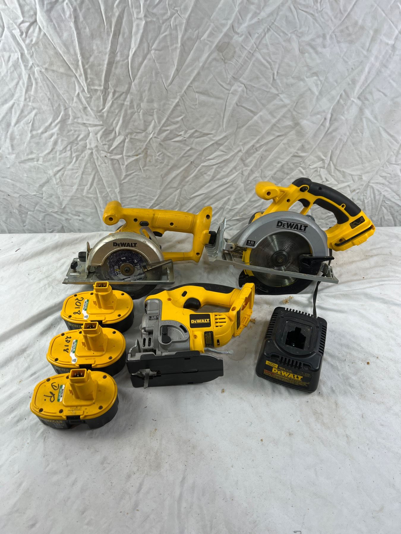 Includes 3 batteries and charger (all working) as well as two circular saws and a jig saw (all working). Sawdust stains to saws.