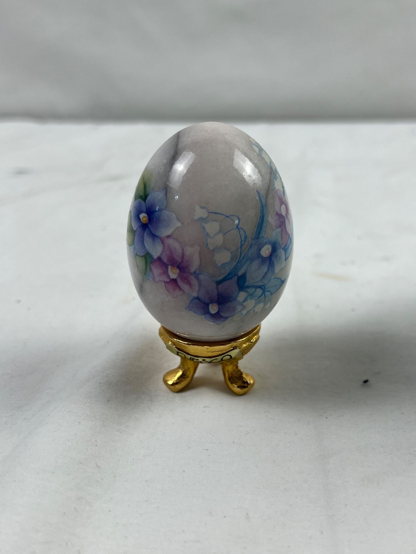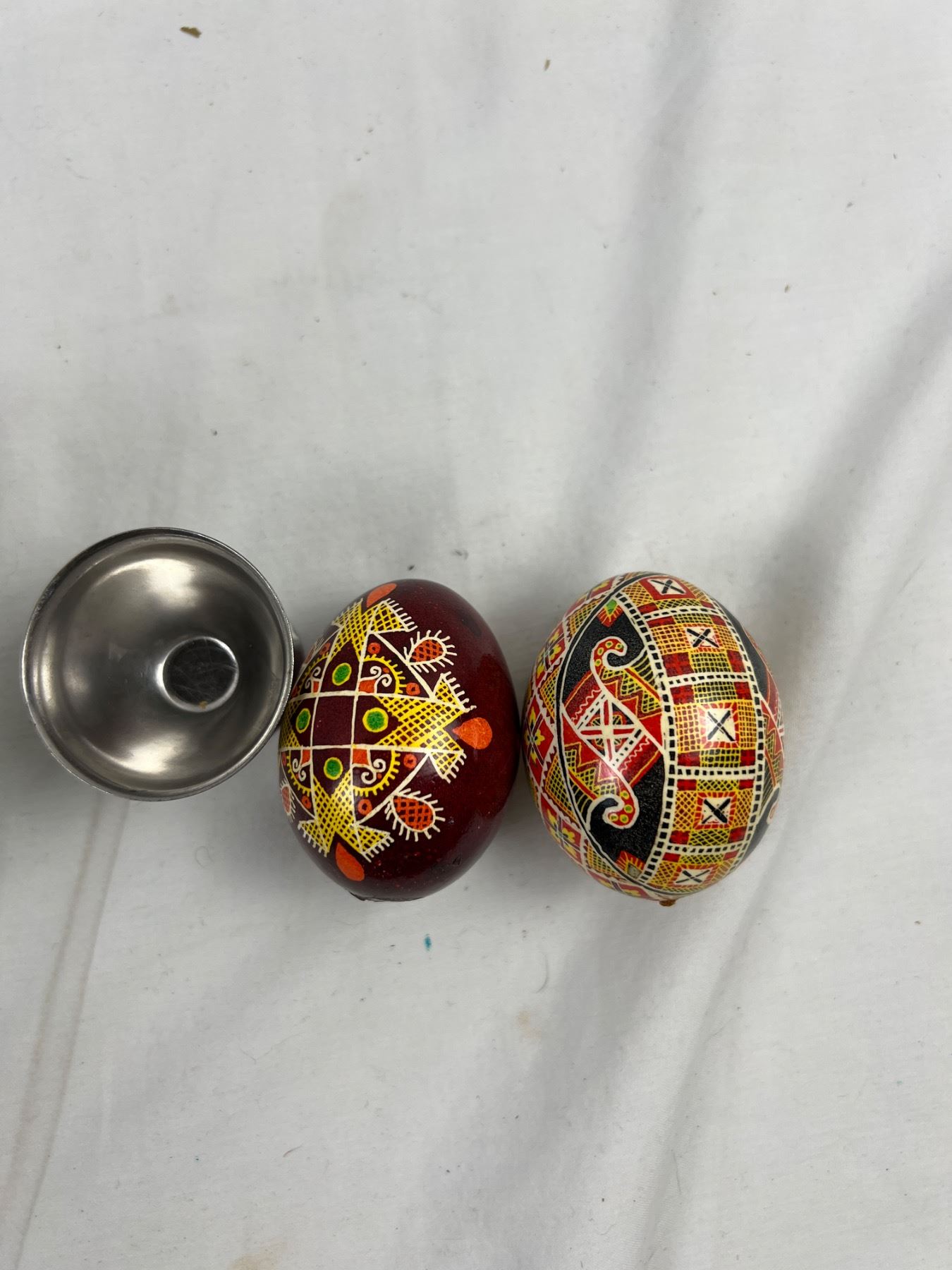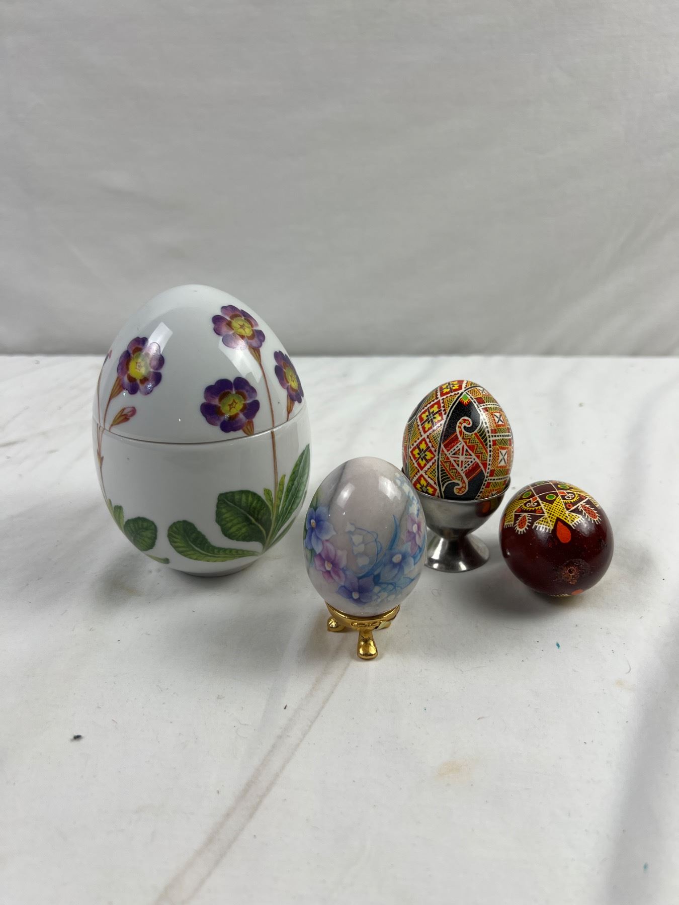 Two are traditional Psyanky eggs, one is a Royal Copenhagen dish and the Enesco piece the client has advised us is marble and hand painted.