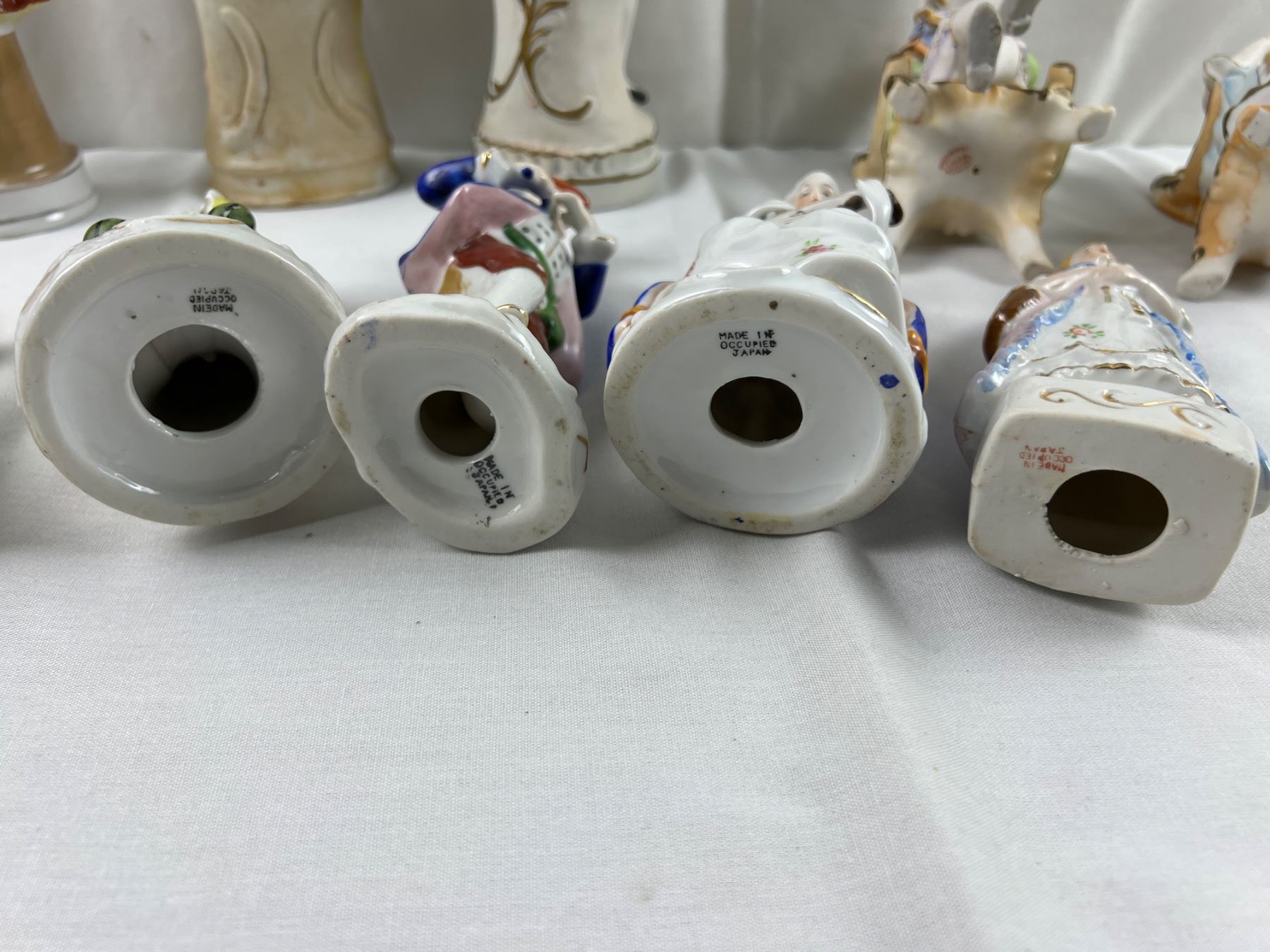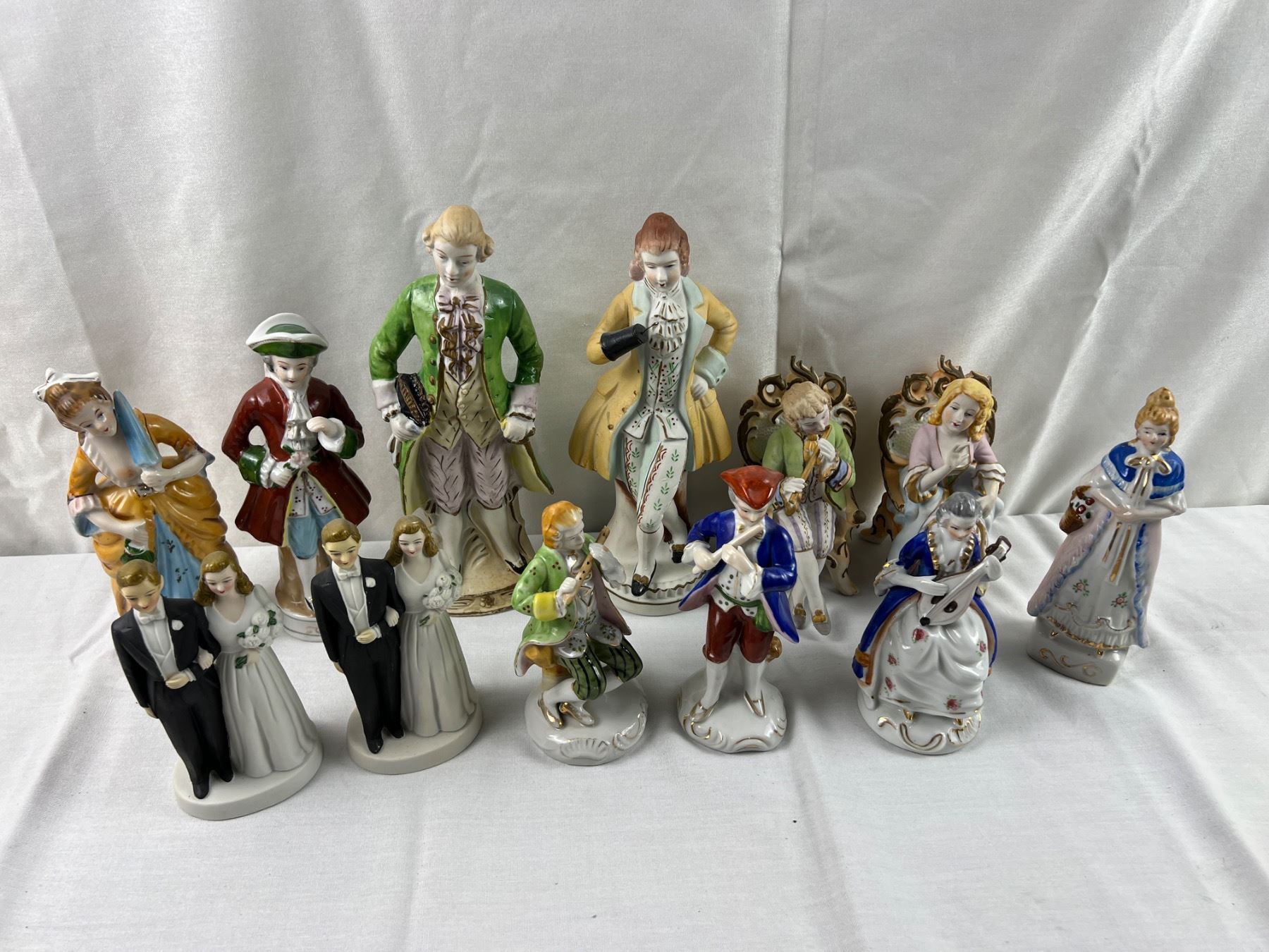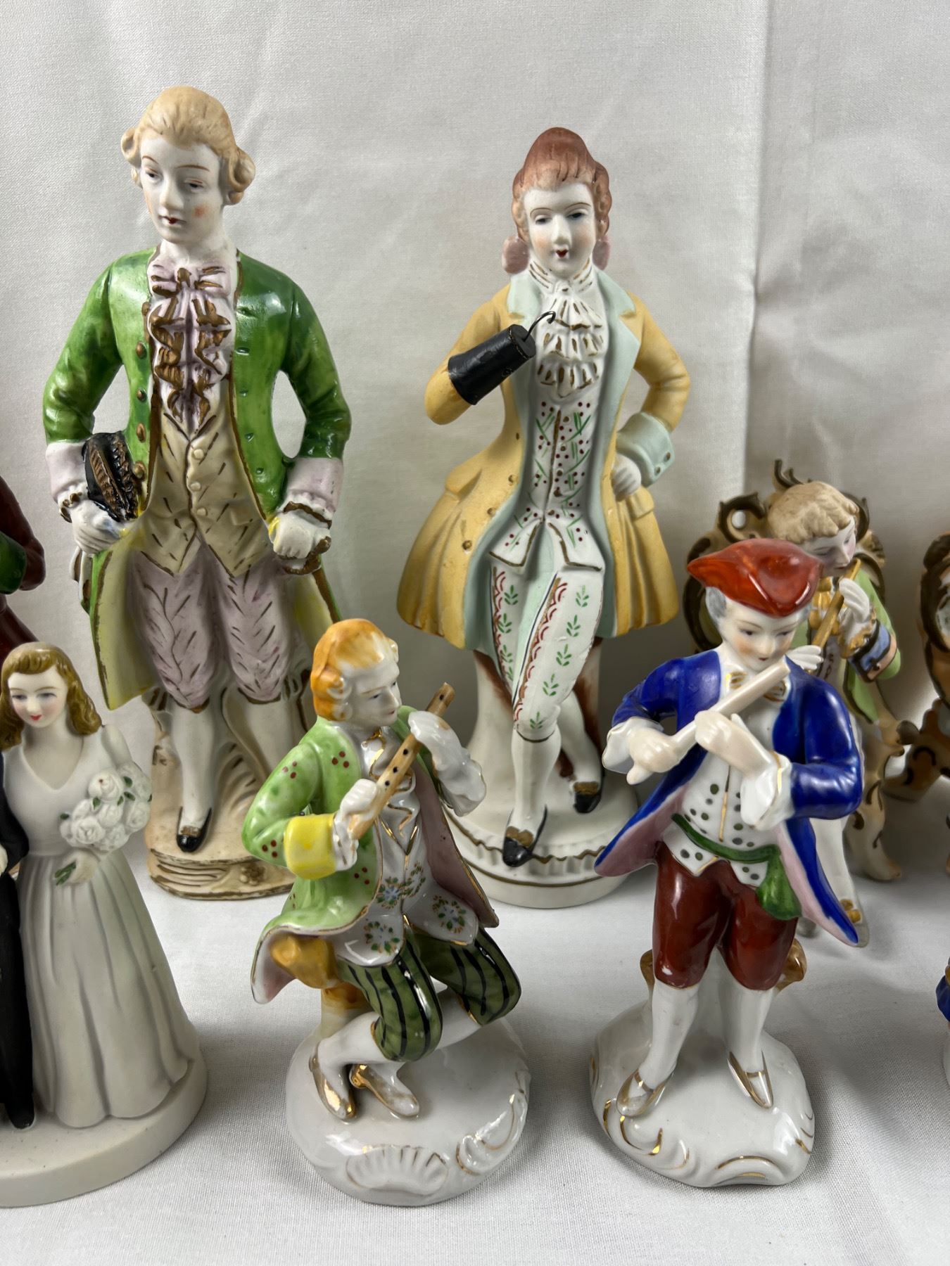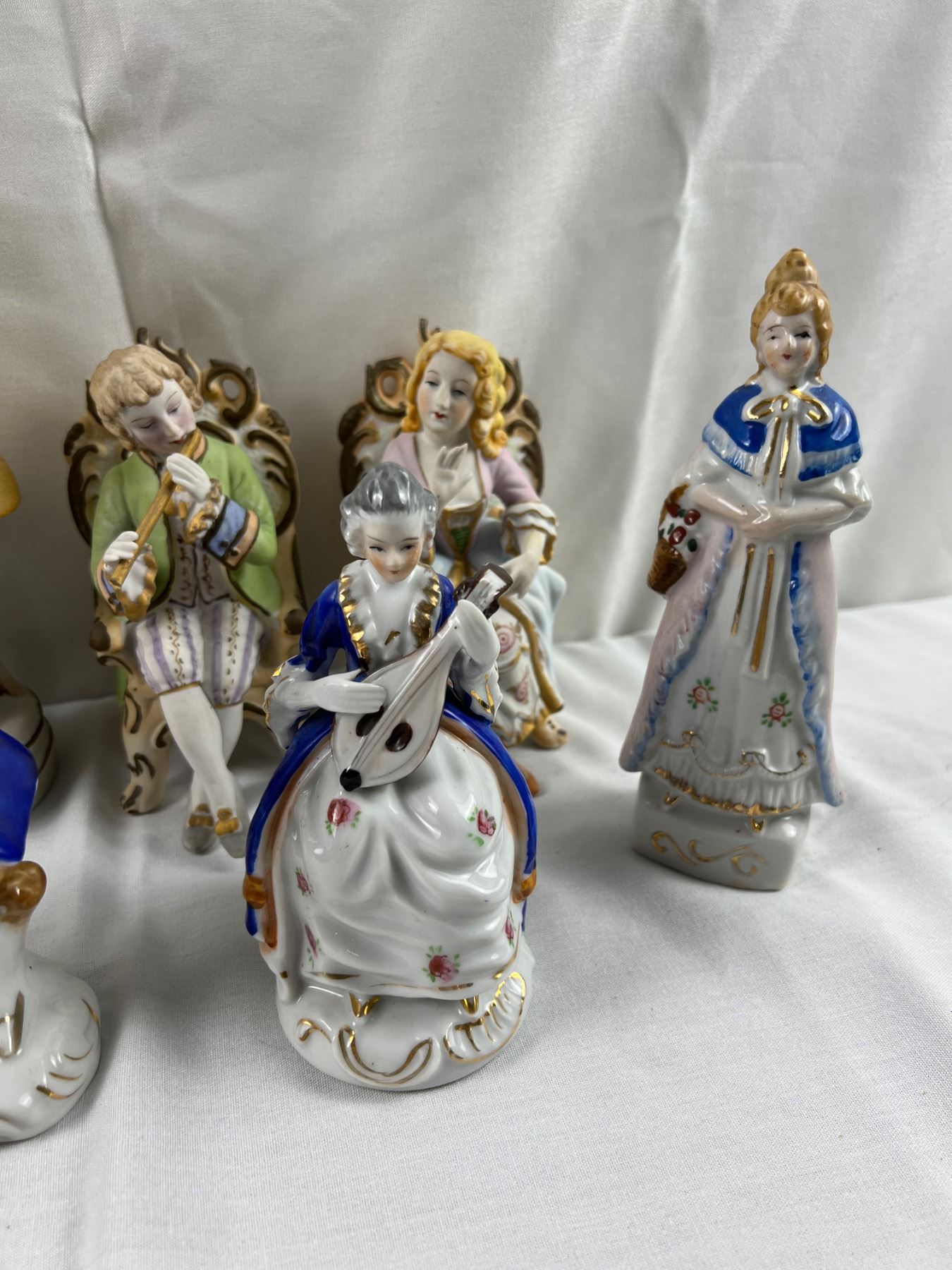 The flute on one of the figures is chipped off, The tallest piece is 10.5"H, some pieces made in Occupied Japan