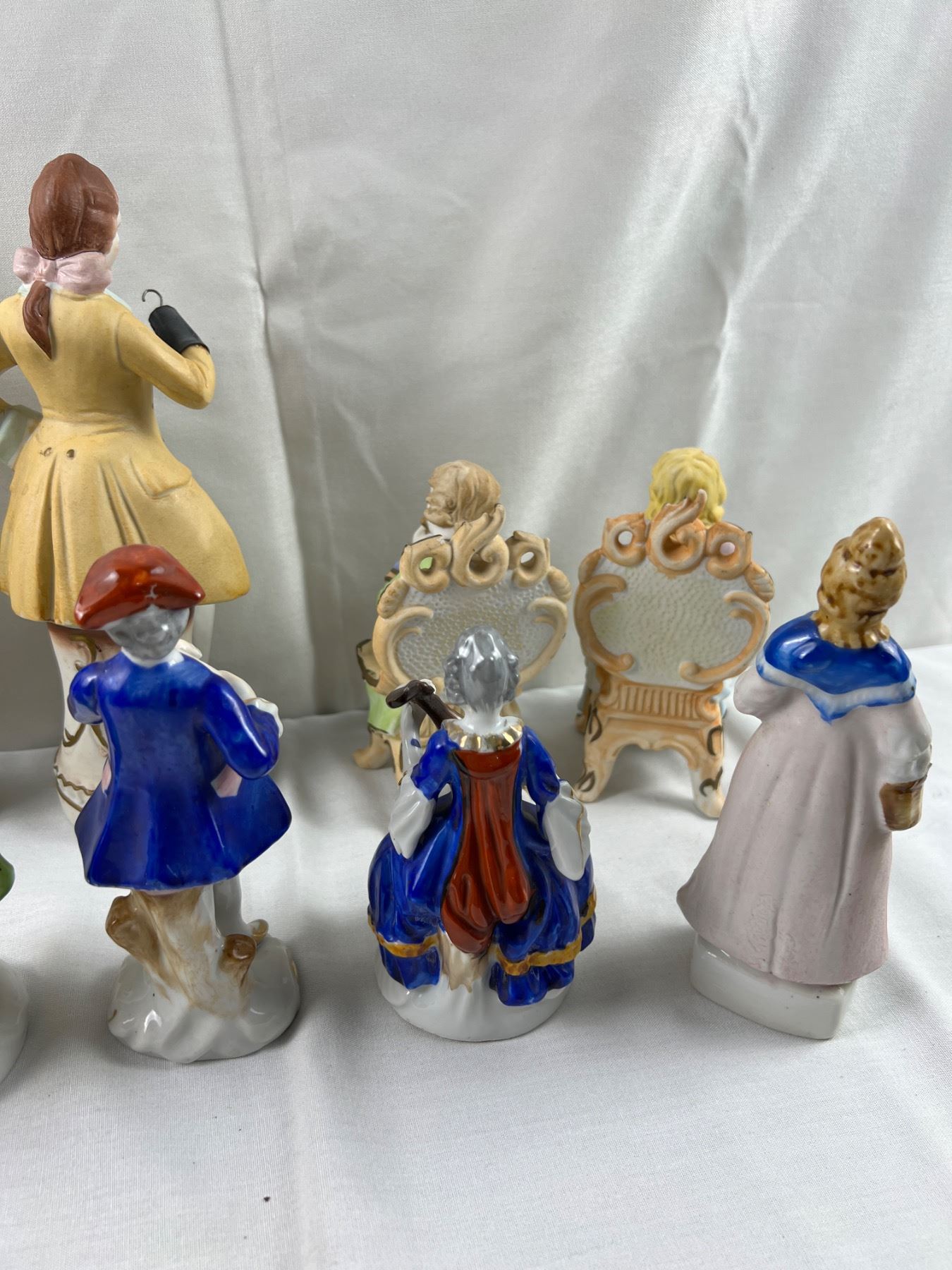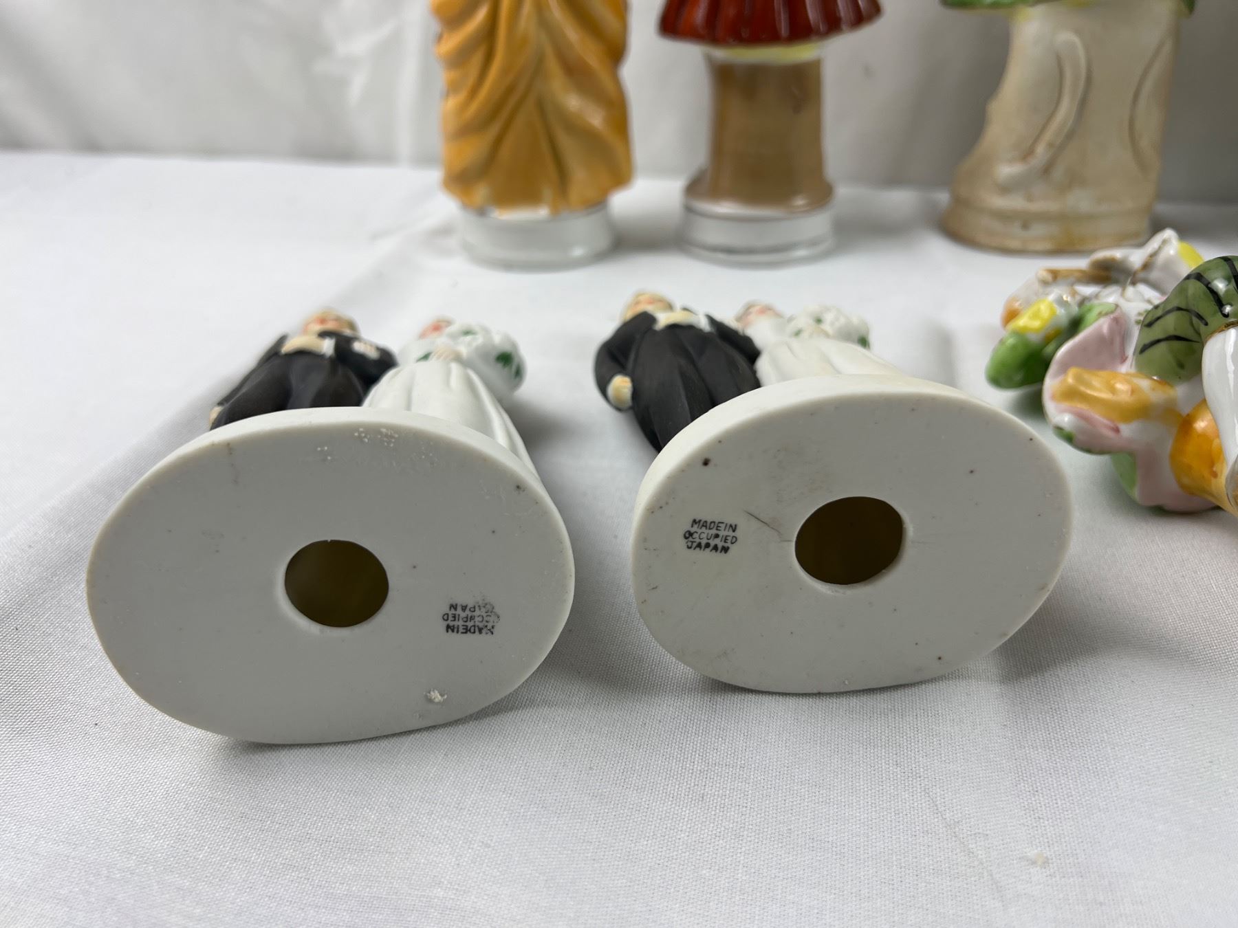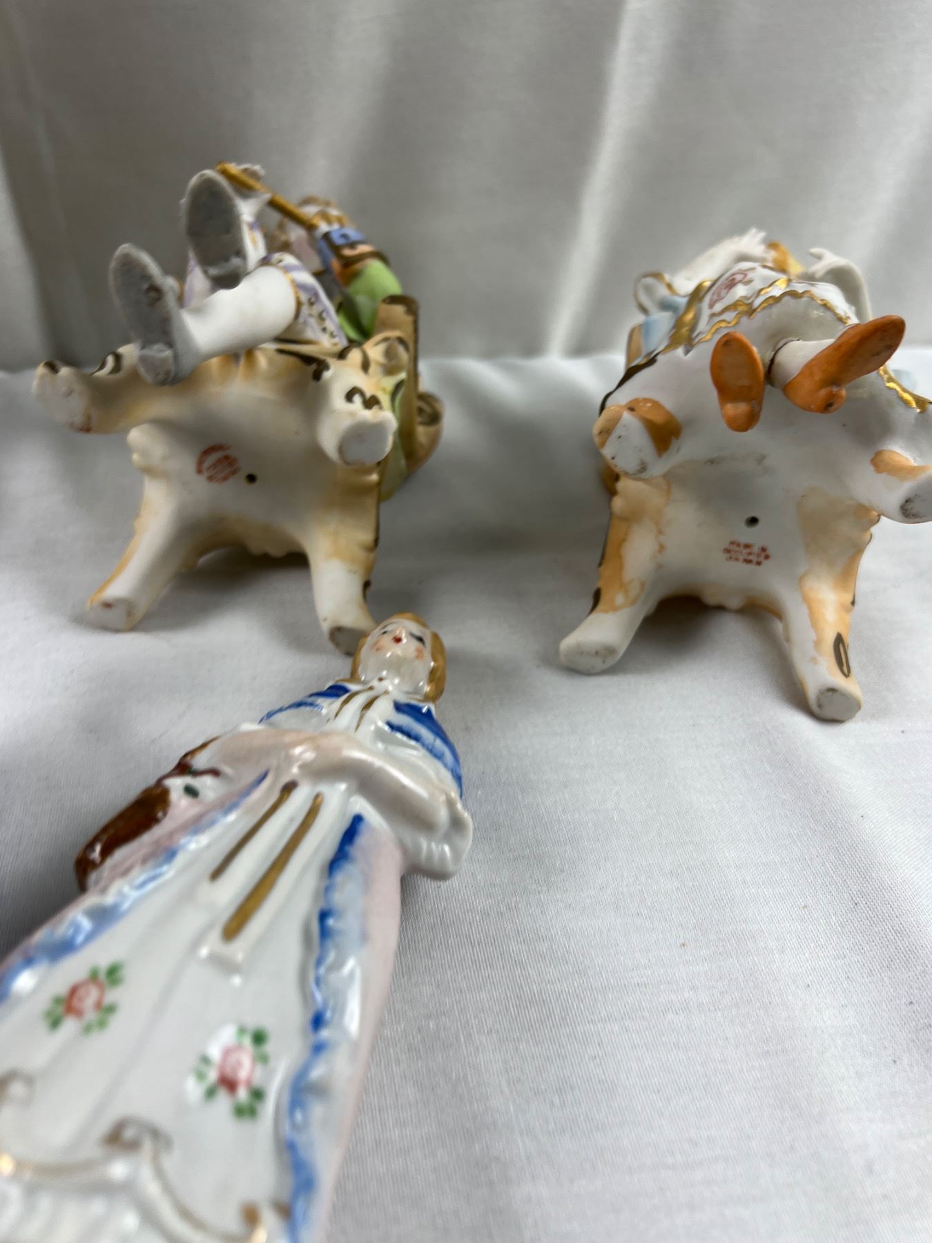 The flute on one of the figures is chipped off, The tallest piece is 10.5"H, some pieces made in Occupied Japan