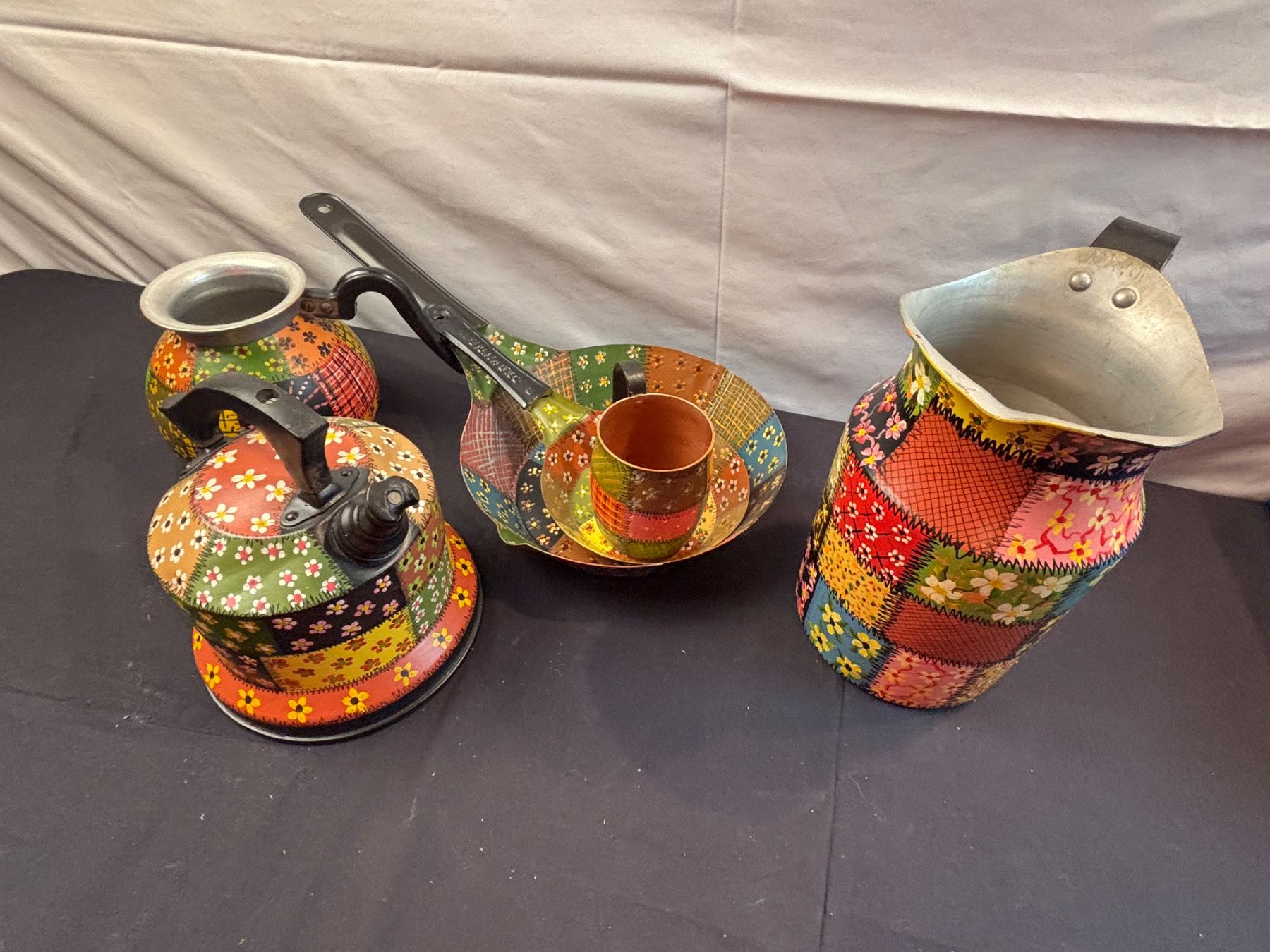 Includes a water jug, frying pans, and tea kettle
