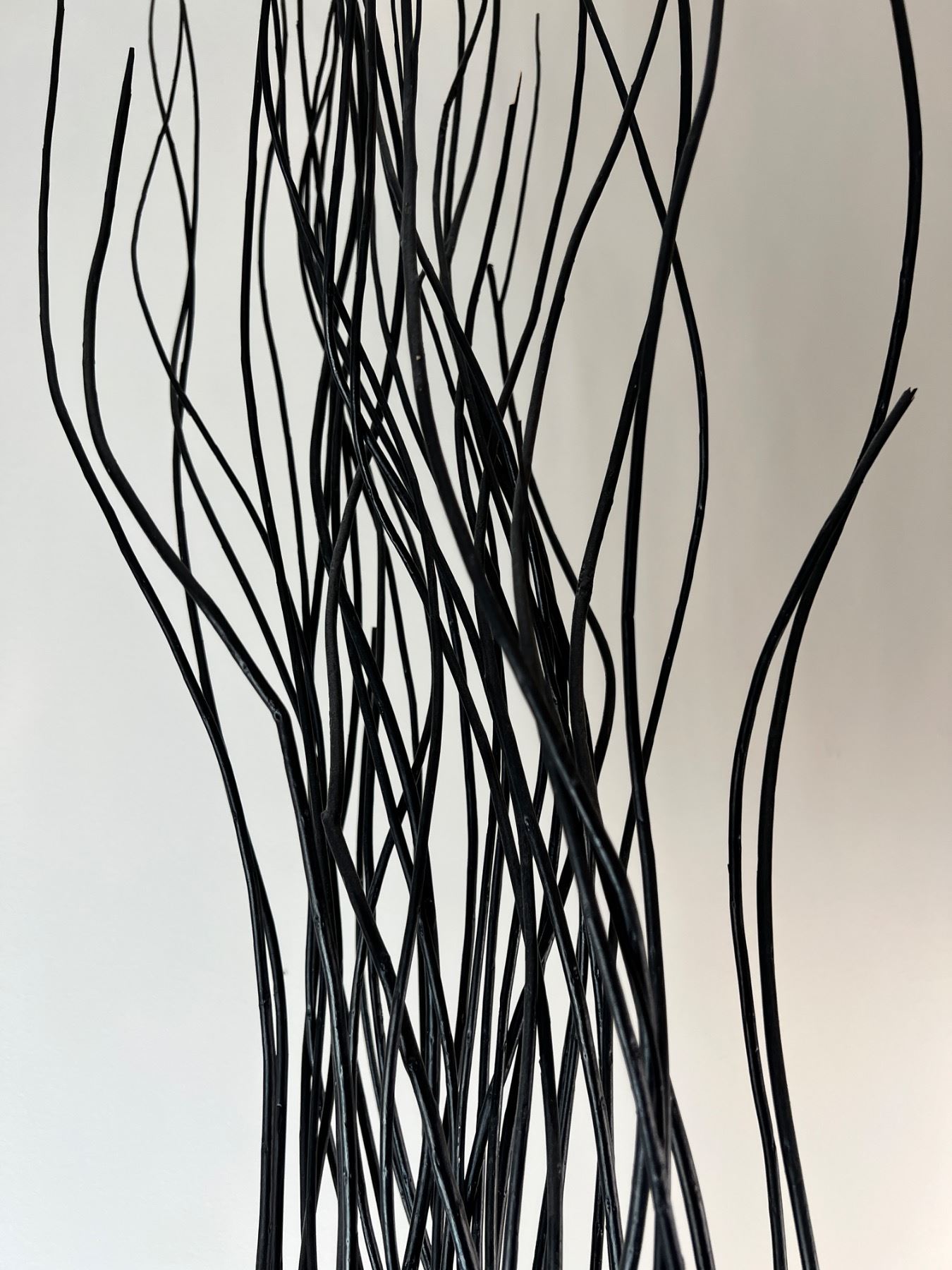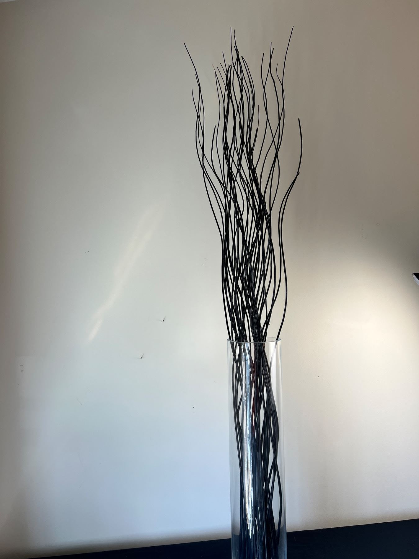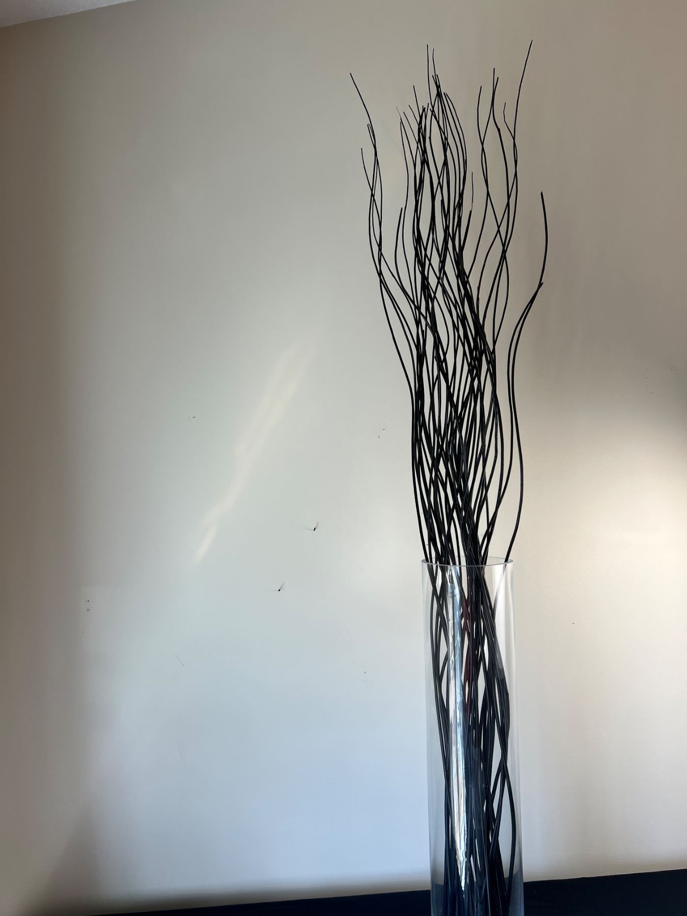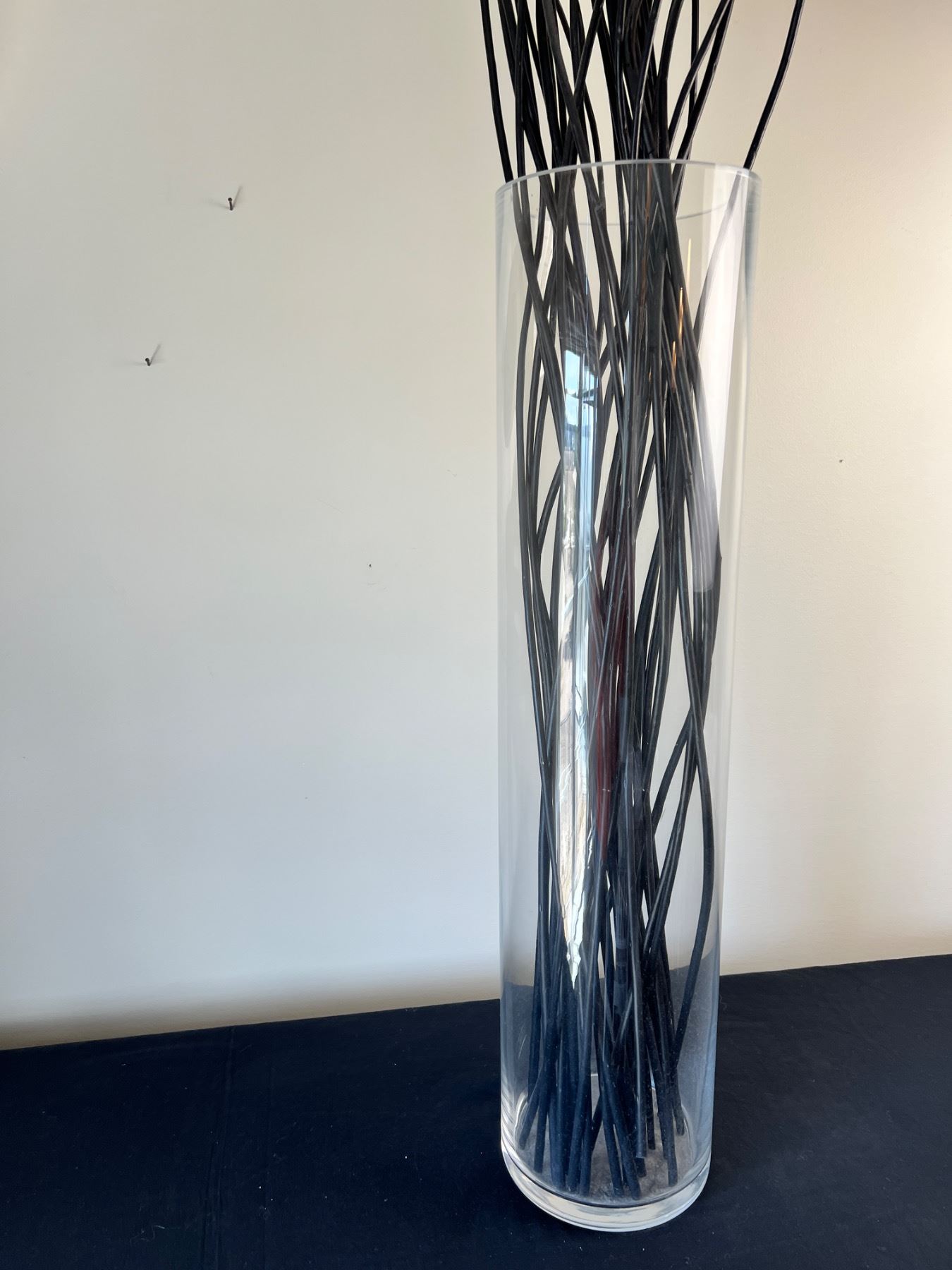 Vase is approximately 26-3/4" tall. With sticks it is raised to a total height of 62". Some sticks are broken at the end.
