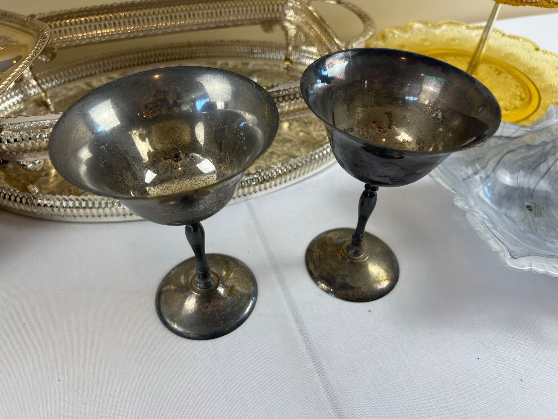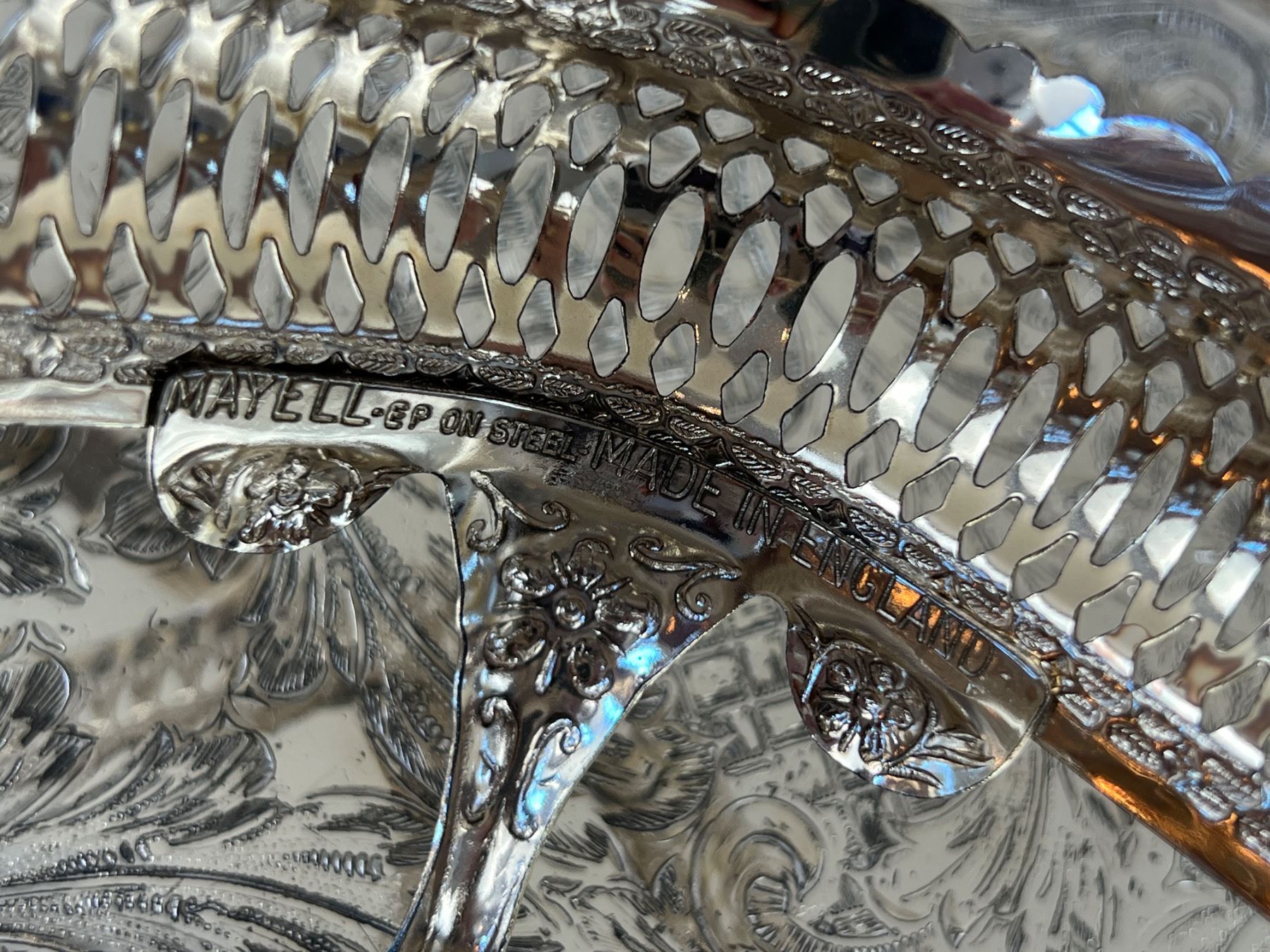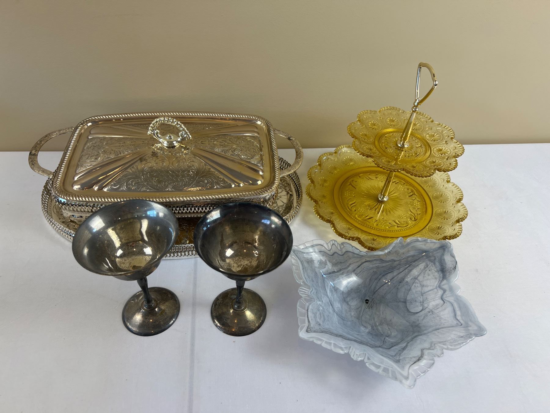 The metal platter is 15.5"L x 10"W, includes Mayell E.P on Steel, Murano Crystal art glass bowl (10"), and more