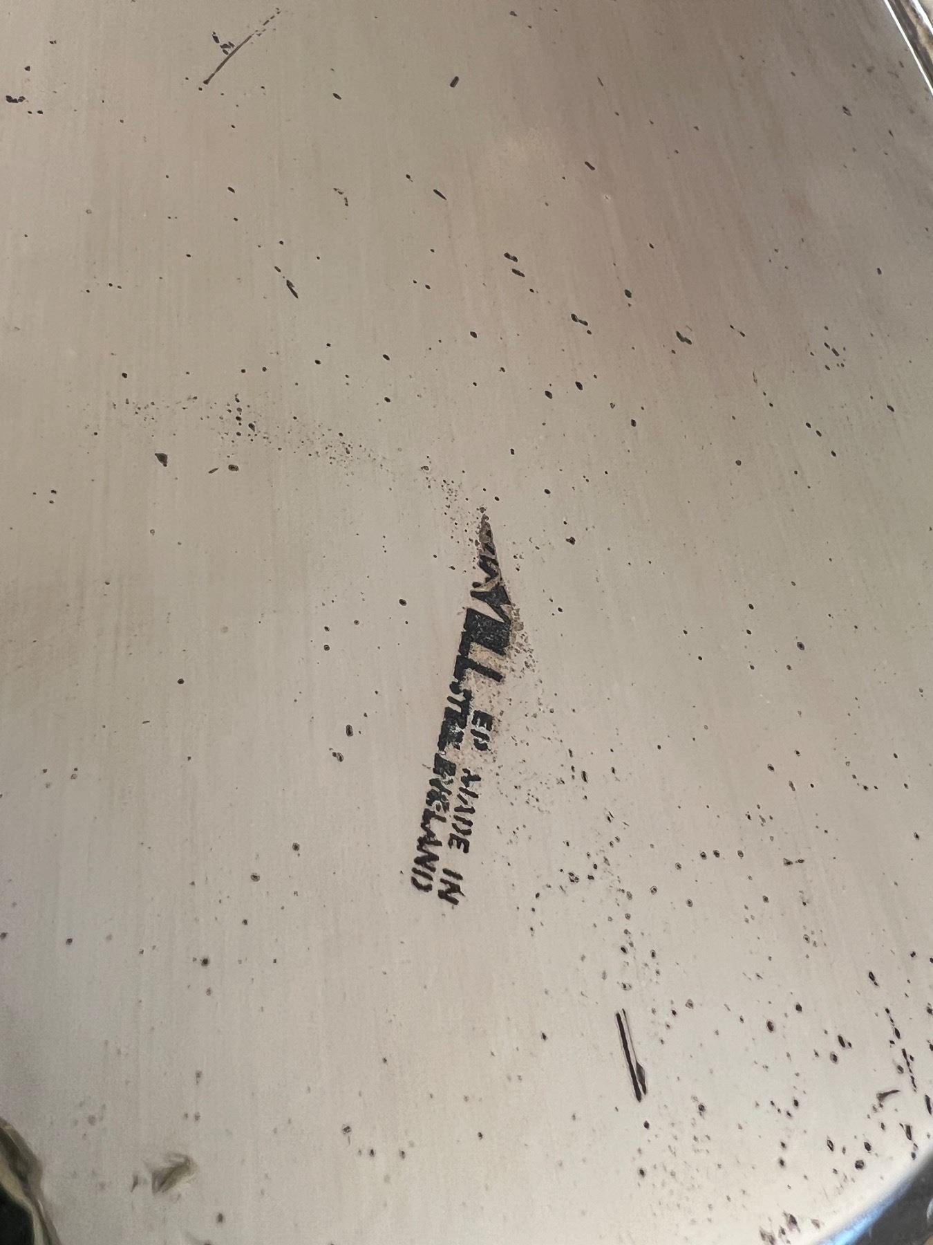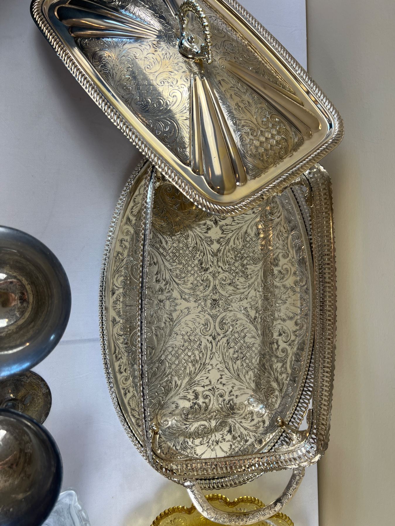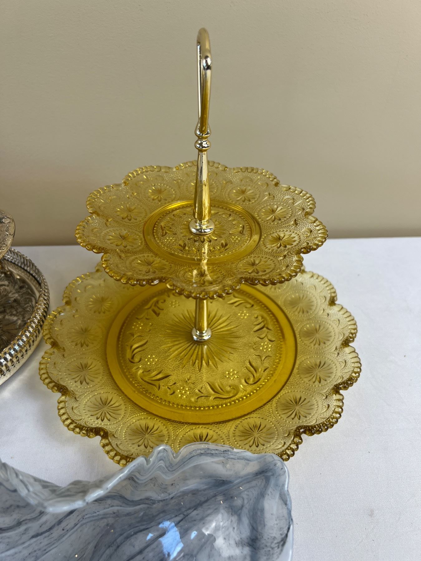 The metal platter is 15.5"L x 10"W, includes Mayell E.P on Steel, Murano Crystal art glass bowl (10"), and more