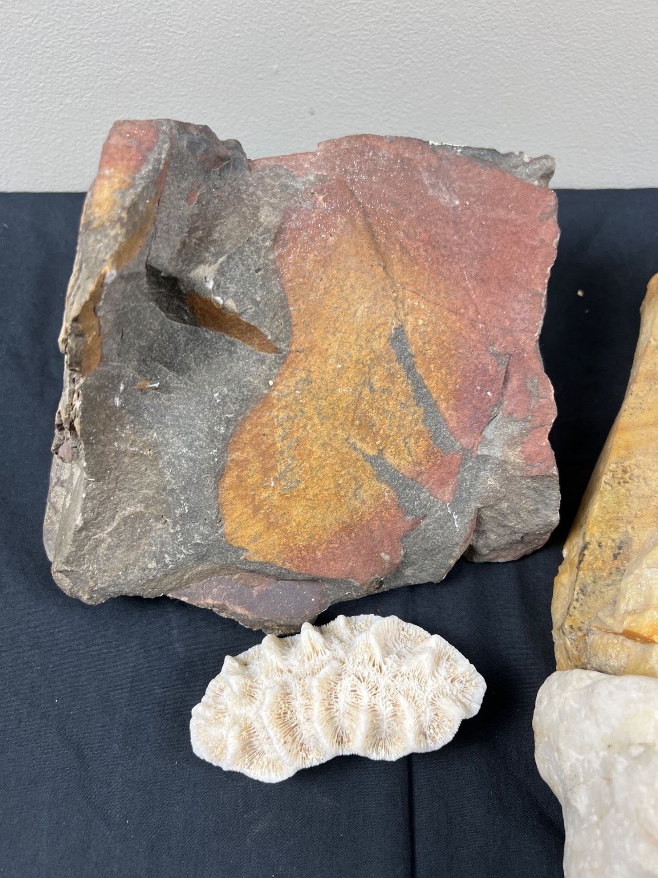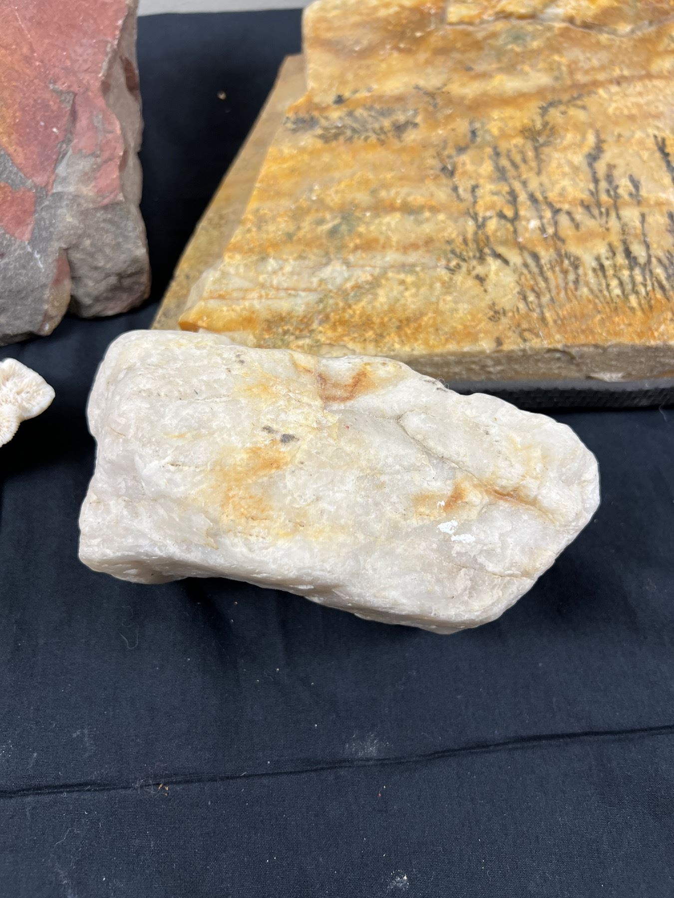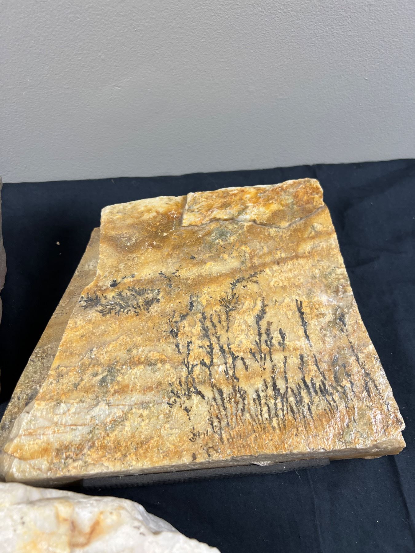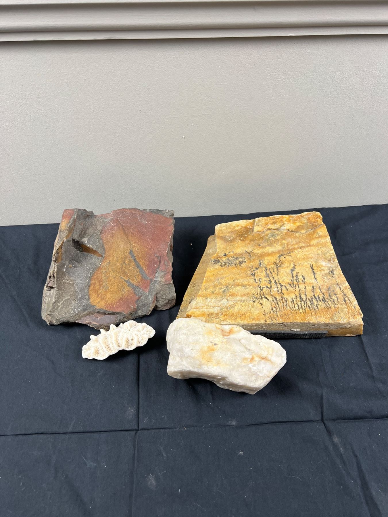 Slab is dendritic stone, tree like formations are called dendrites and are not fossils but mineral formations. Also includes one dried coral