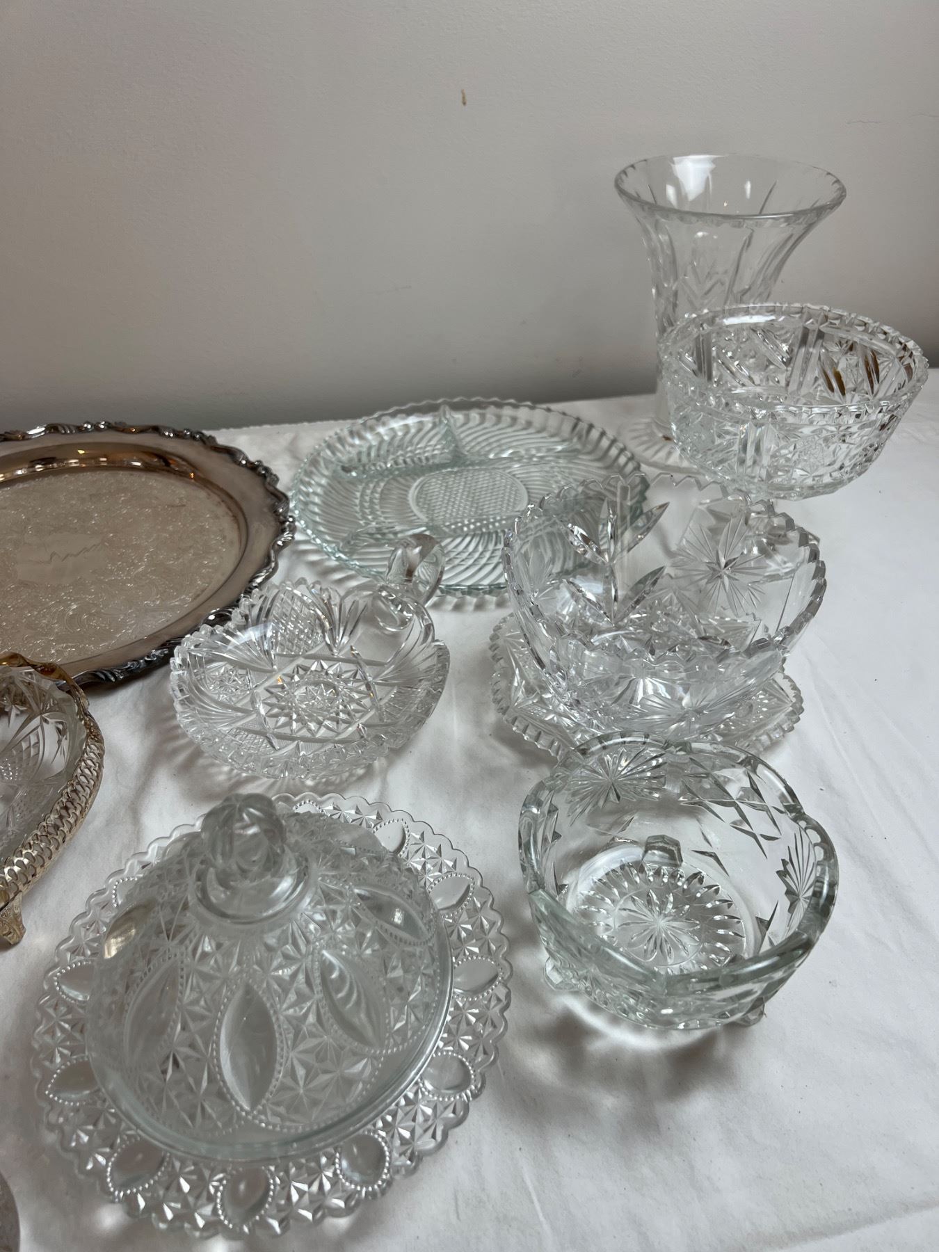 Includes pieces of crystal, art glass and a silver plated platter. Platter is 13" in diameter