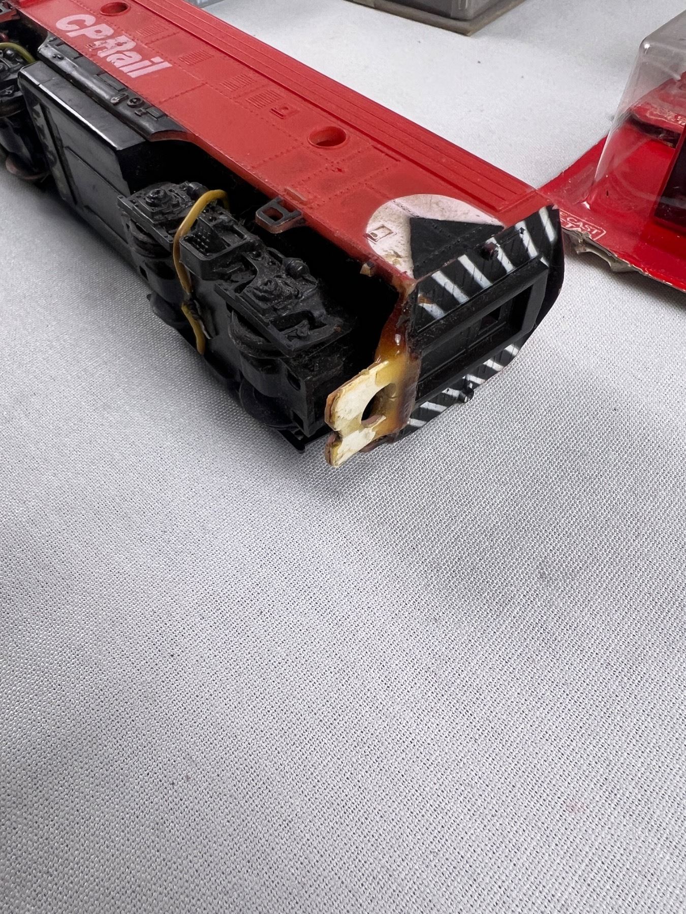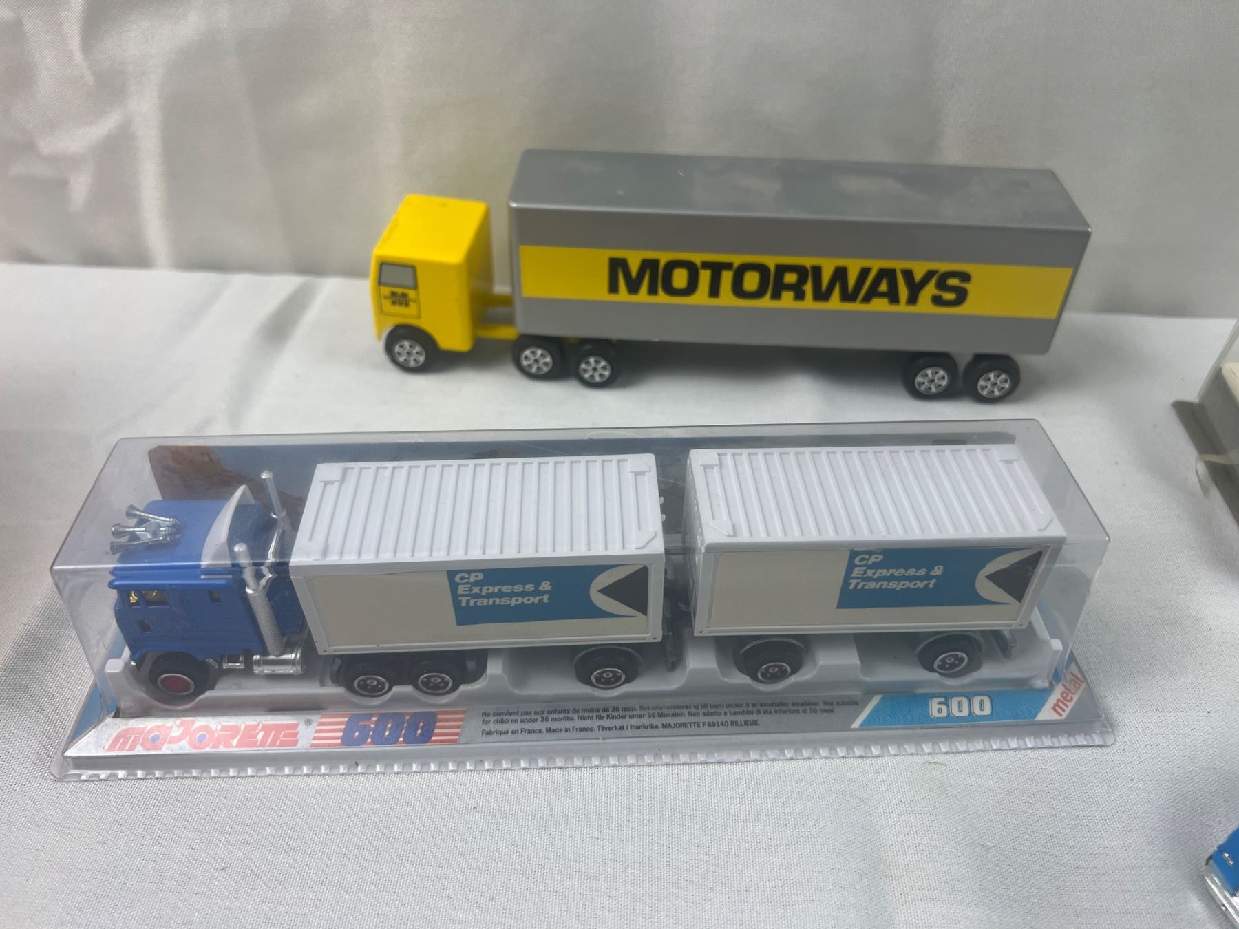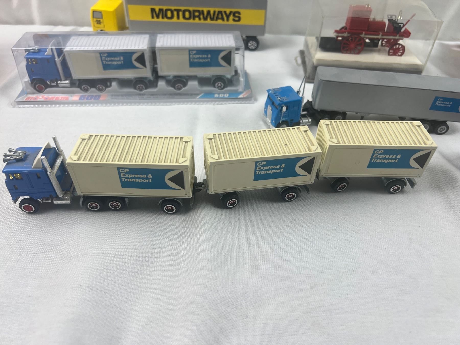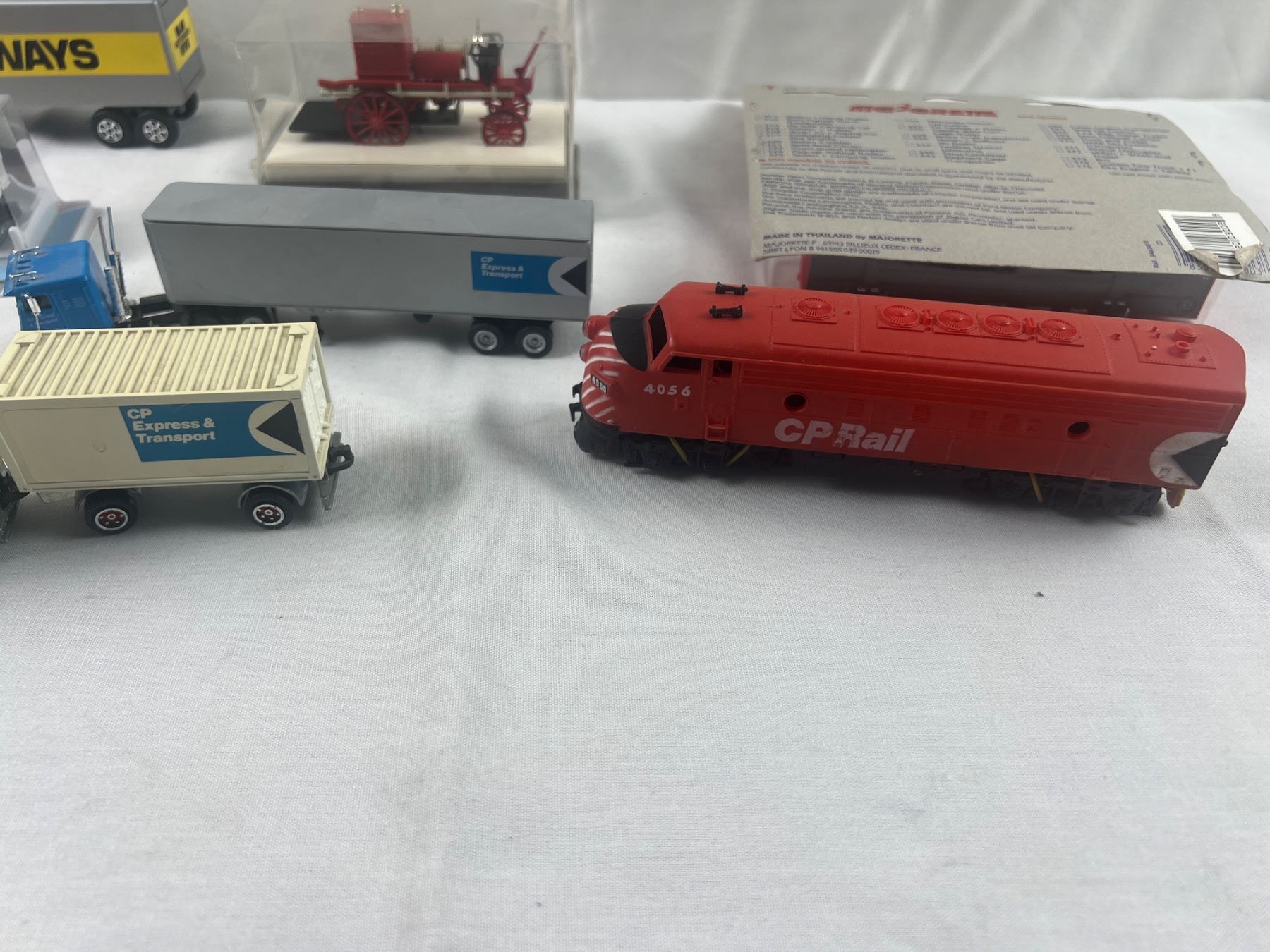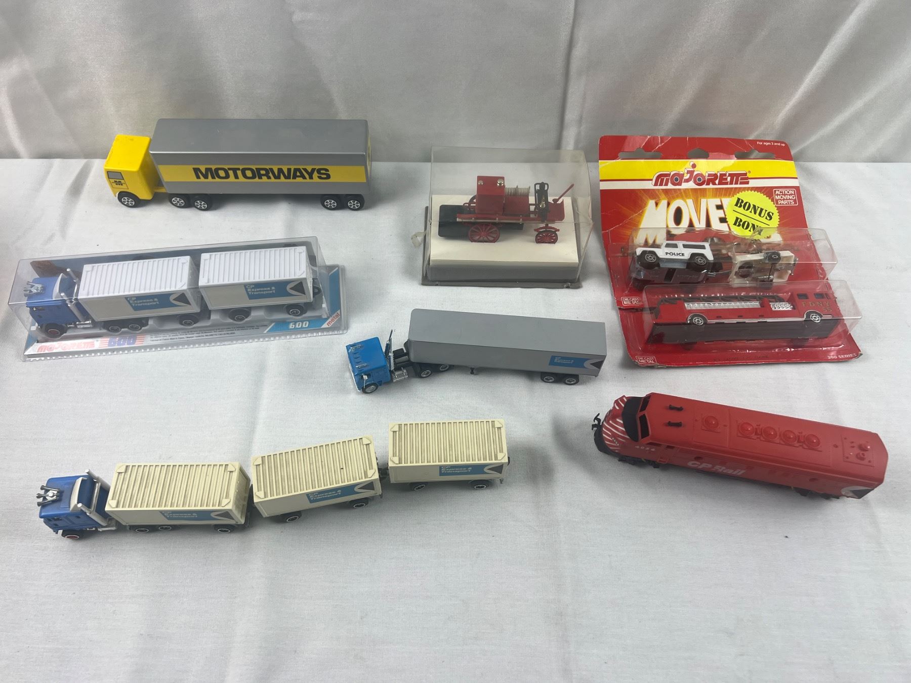 Includes a CP Rail locomotive (7"L), Majorette 300 series, 1896 Mercedes Benz, and more