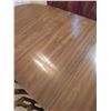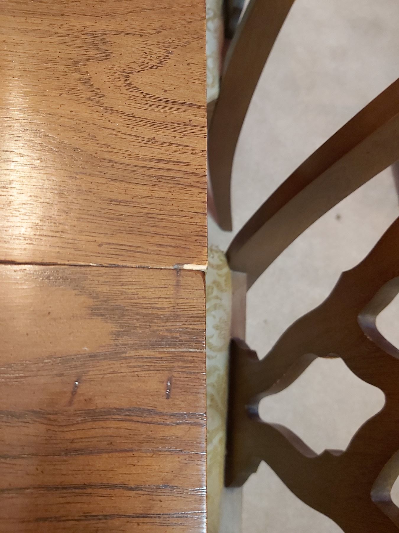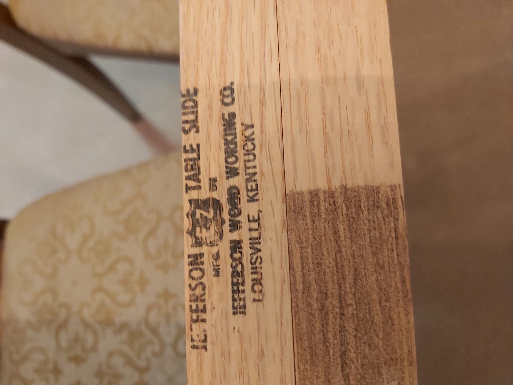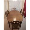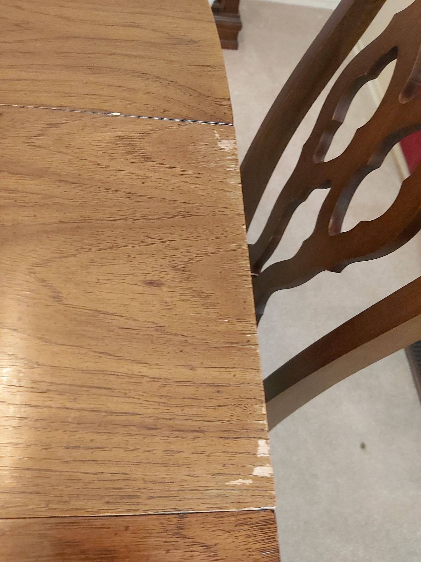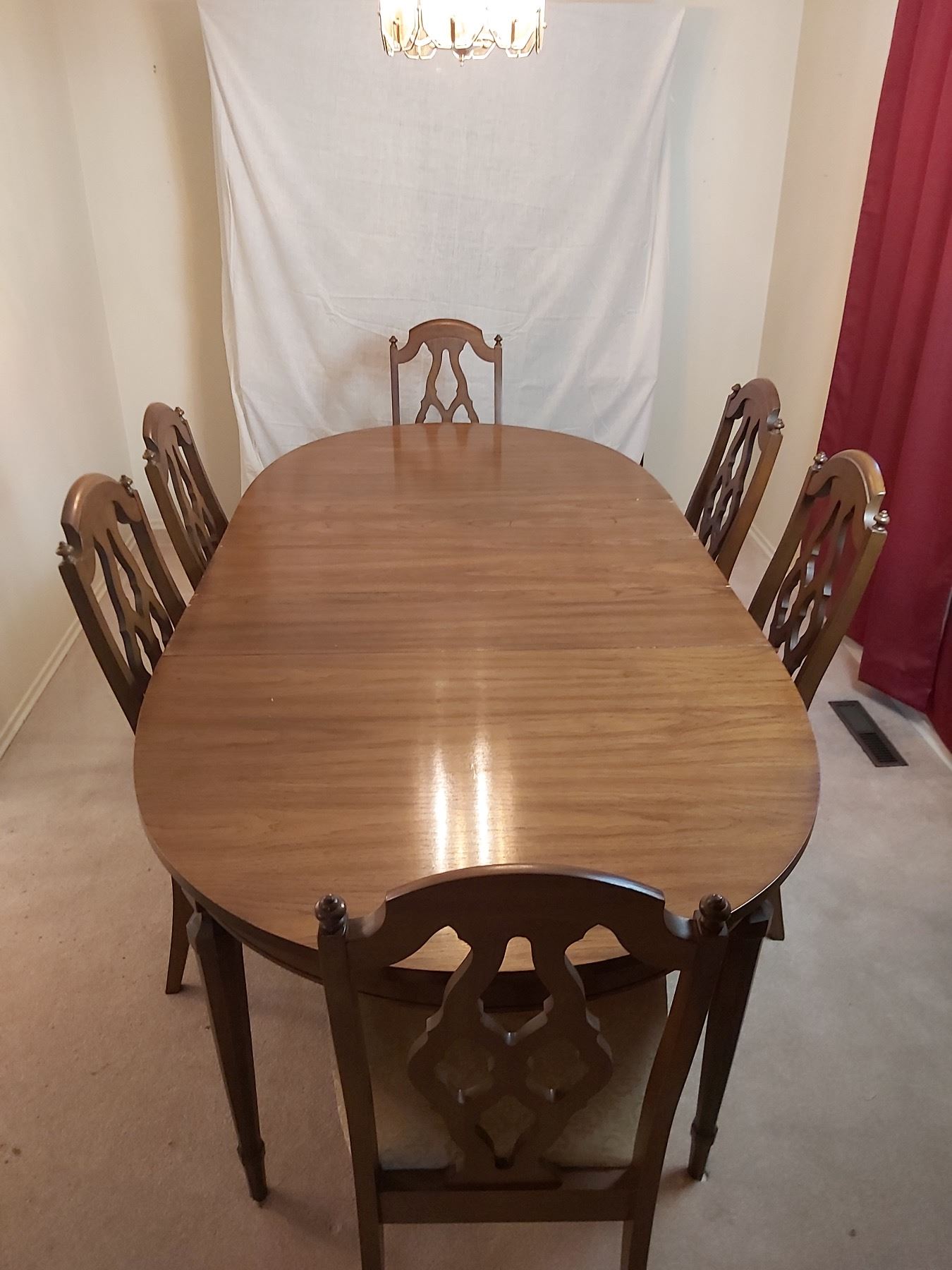 Includes 3 leafs, One leaf is 10"W, With leafs; 87.5"L x 42"W, Some chairs have stains, table has some scuffs and wear