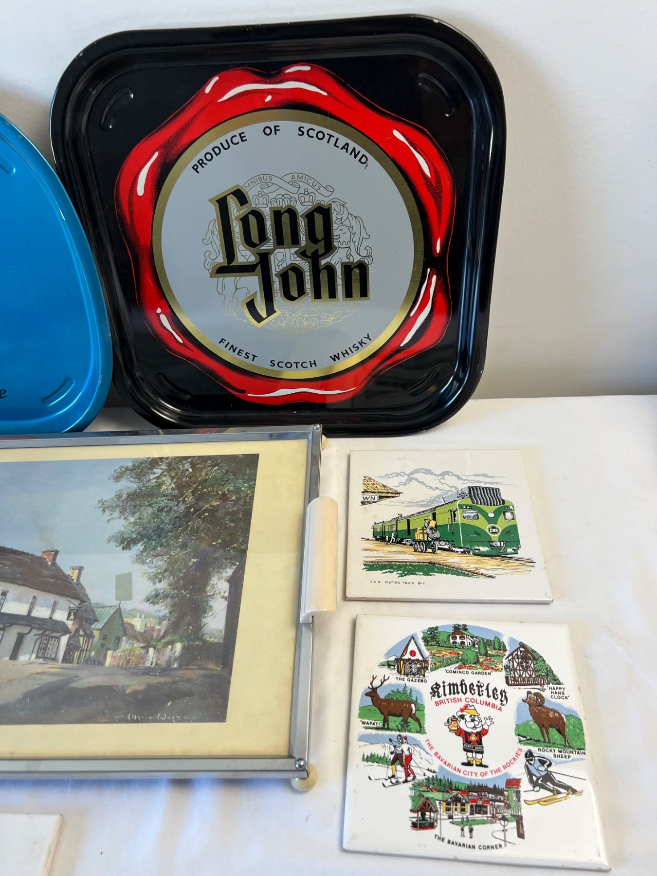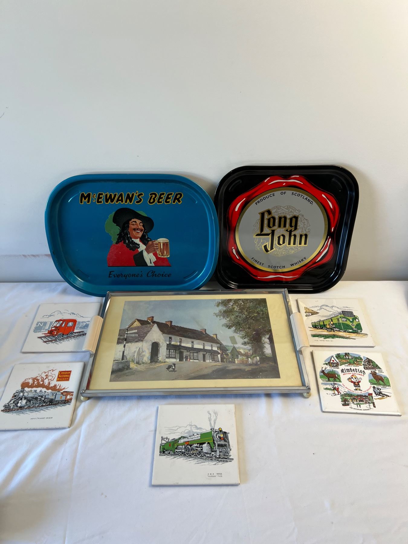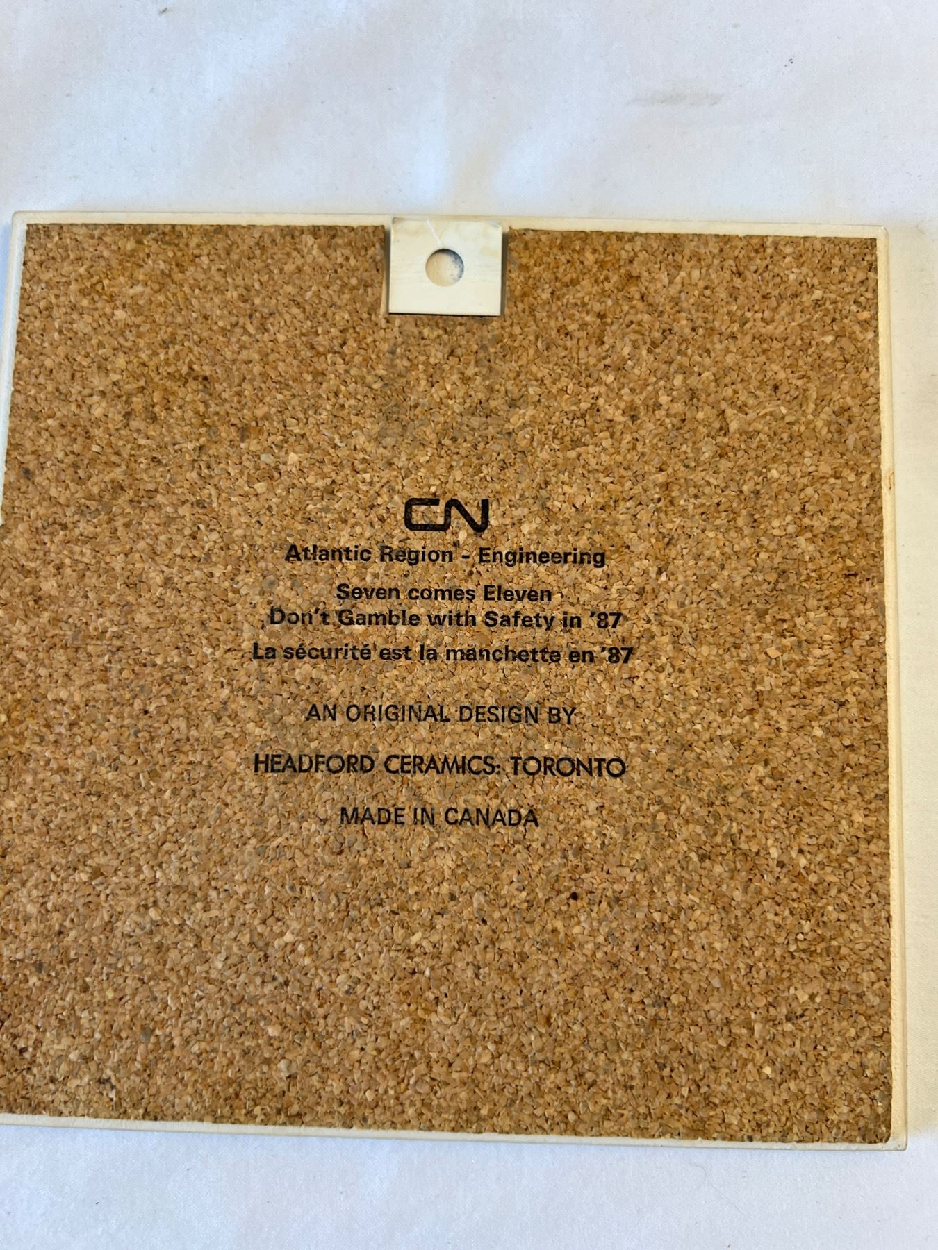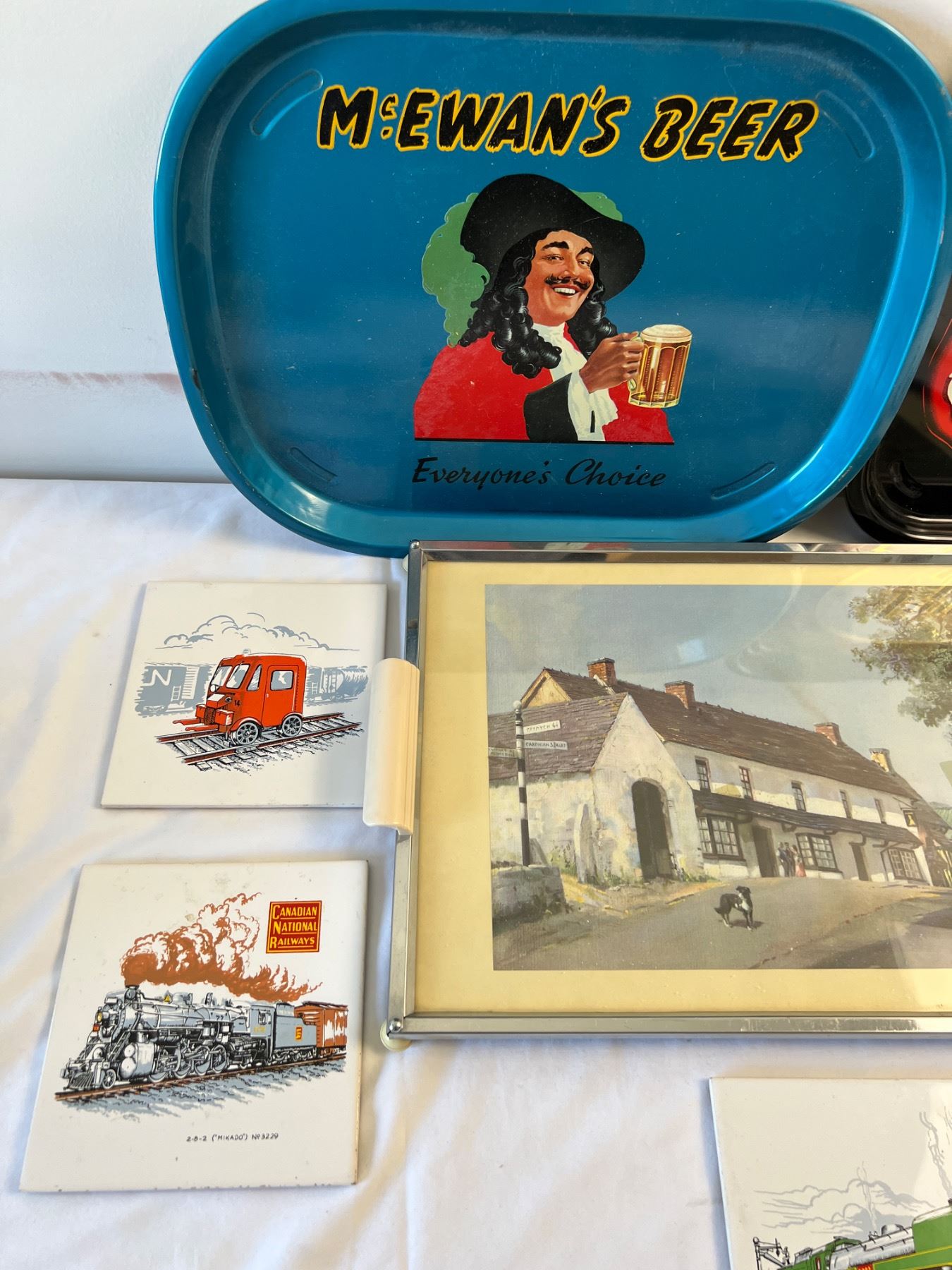 Includes two metal trays and one artistic tray. Hot plates are CN rail artworks except for BC tile which is unbranded. Dinner tray is 19" by 12"