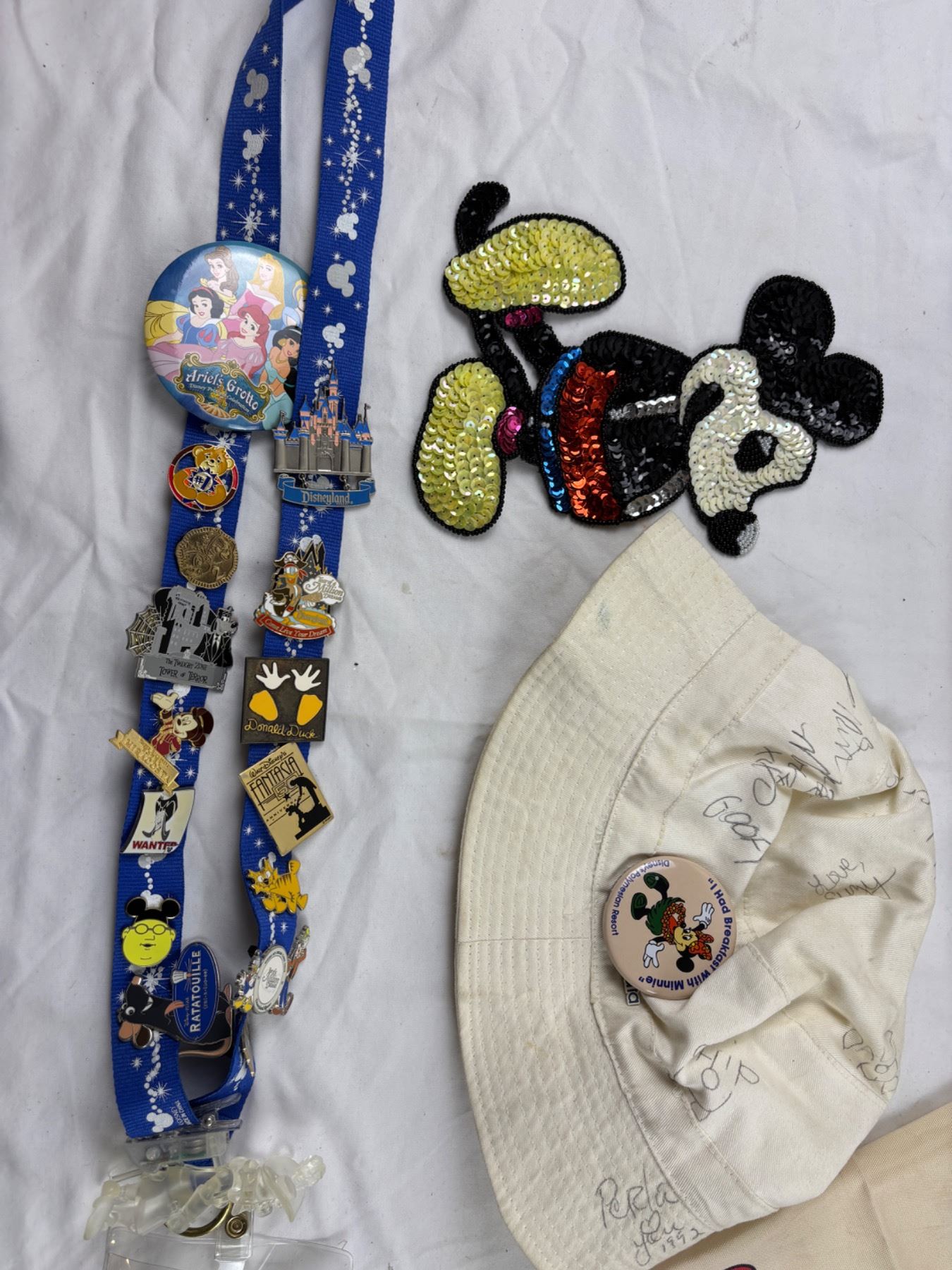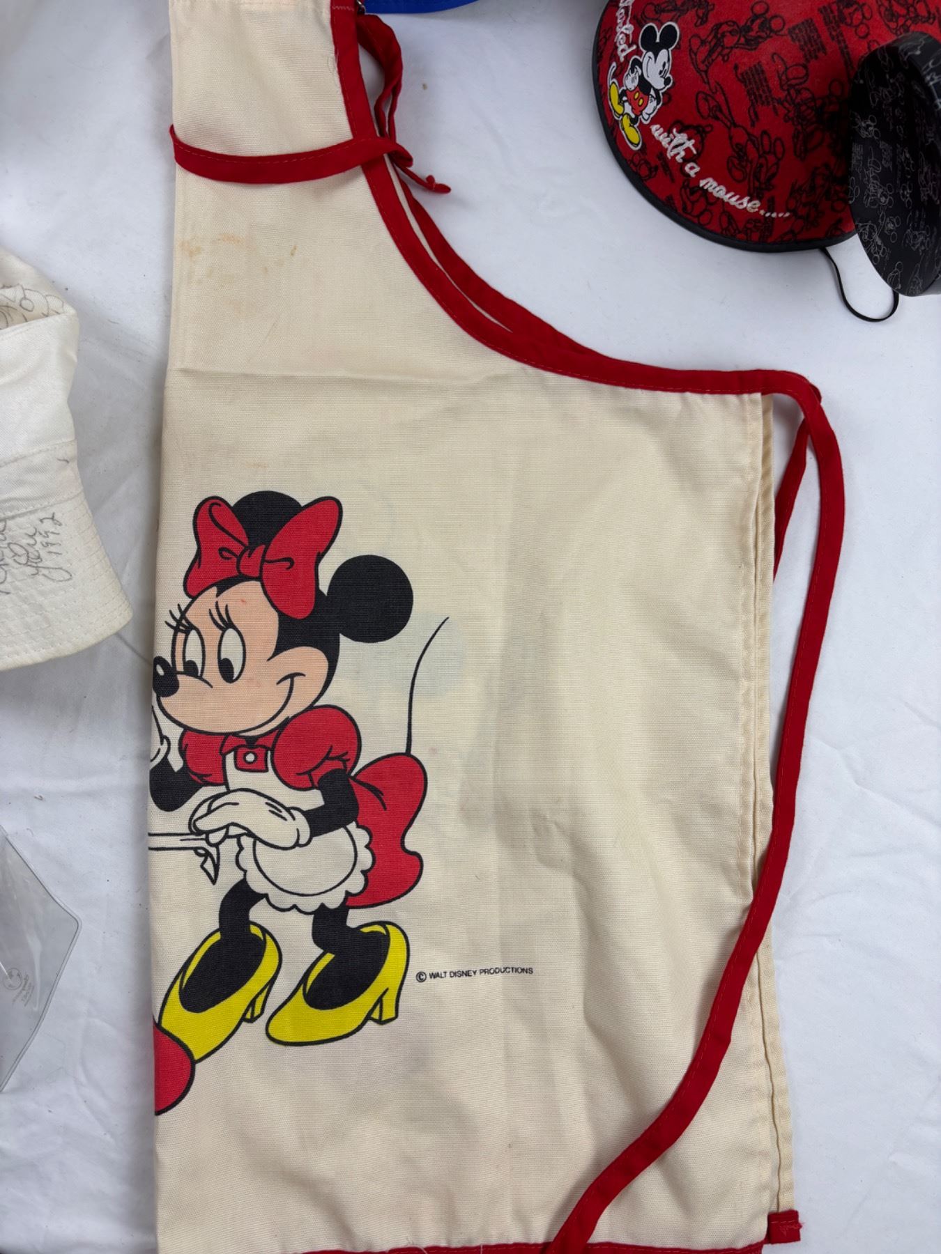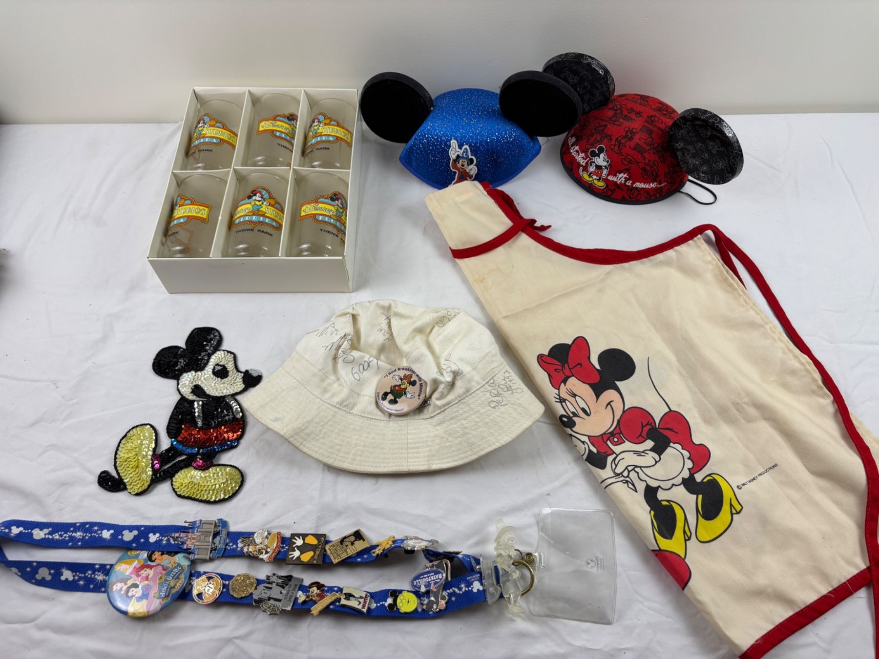 Includes, Mickey & Minnie Apron (some sm stains), various pins, set of six Theme Park Glasses, and more