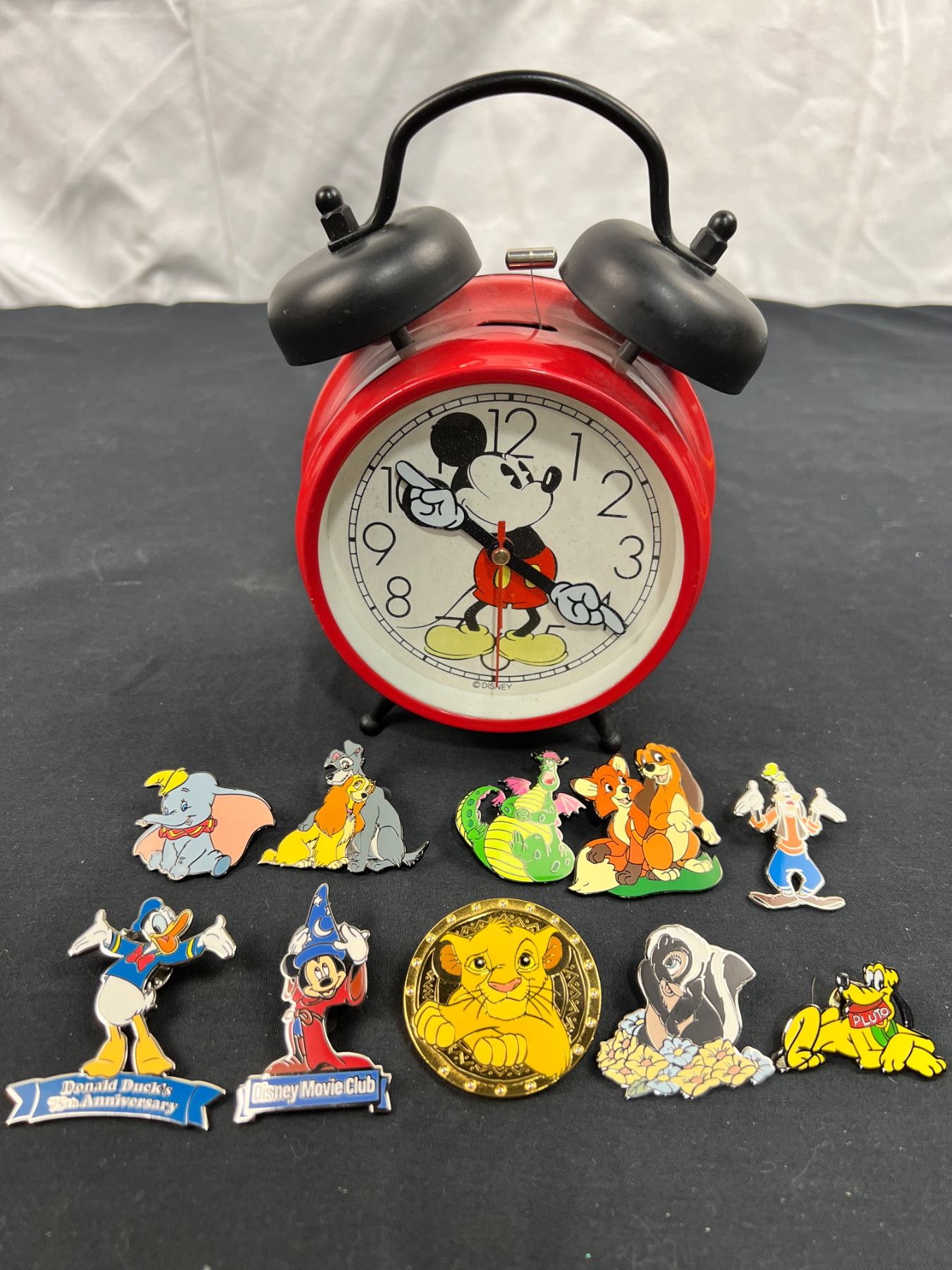 Includes an assortment of Disney Movie Club pins (some are missing the backings), Disney Mickey Mouse alarm clock 5"diameter x 8"H