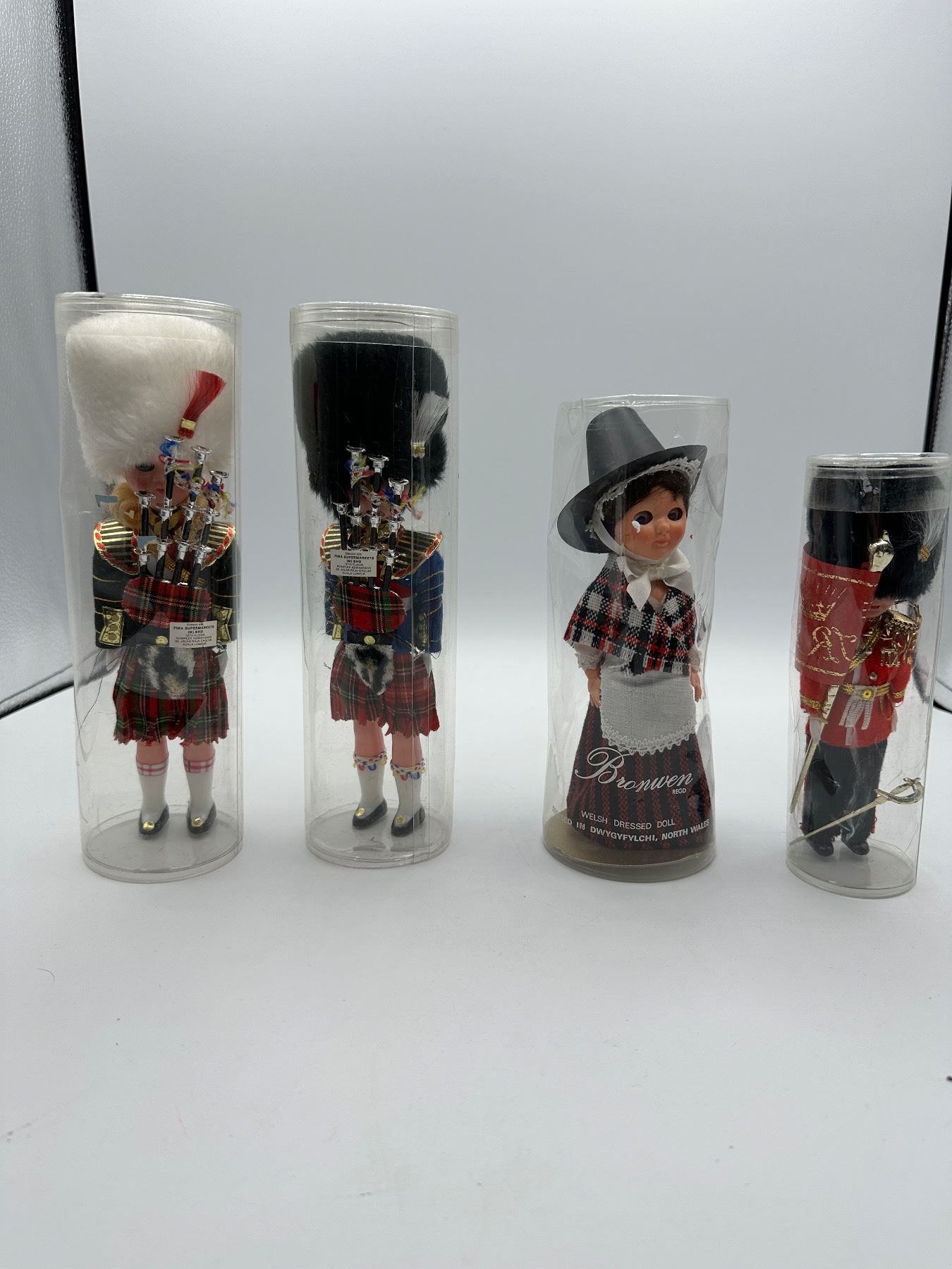 Including 6.5" Buckingham Palace Guard in red military outfit - 9" Scottish guard with bagpipes - 7" Welsh guard - 9" Tartan dressed piper doll
