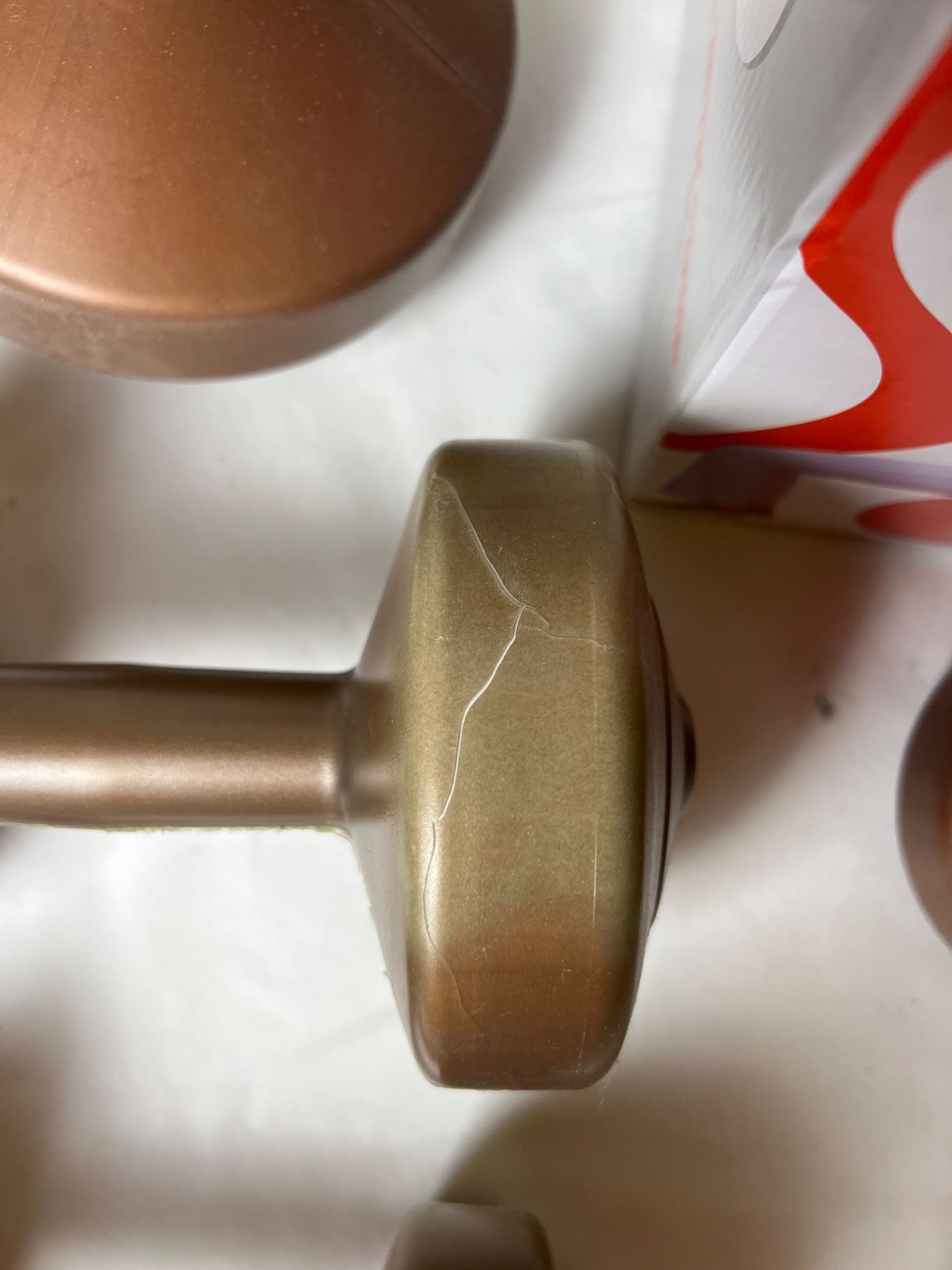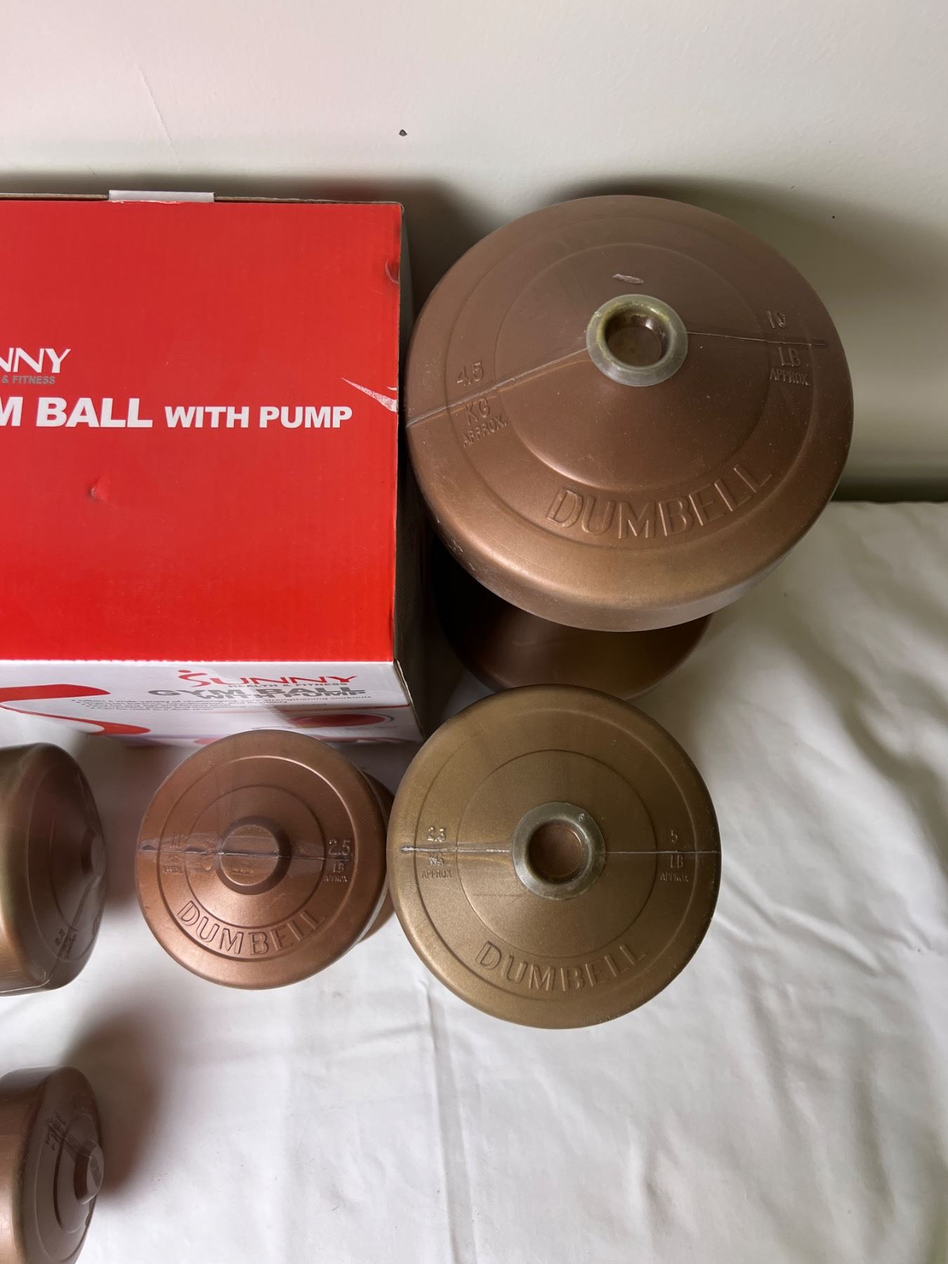 Includes a pair of 10 lb weights, a pair of 5 lbs and a pair of 2.5 lbs. Some damage to one of the 5's. Ball is new in box with pump.