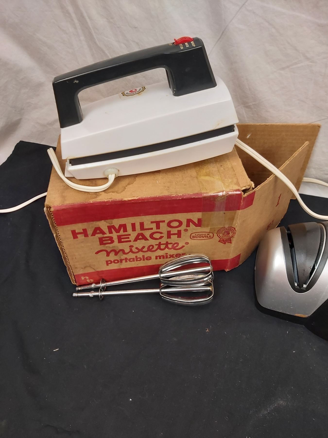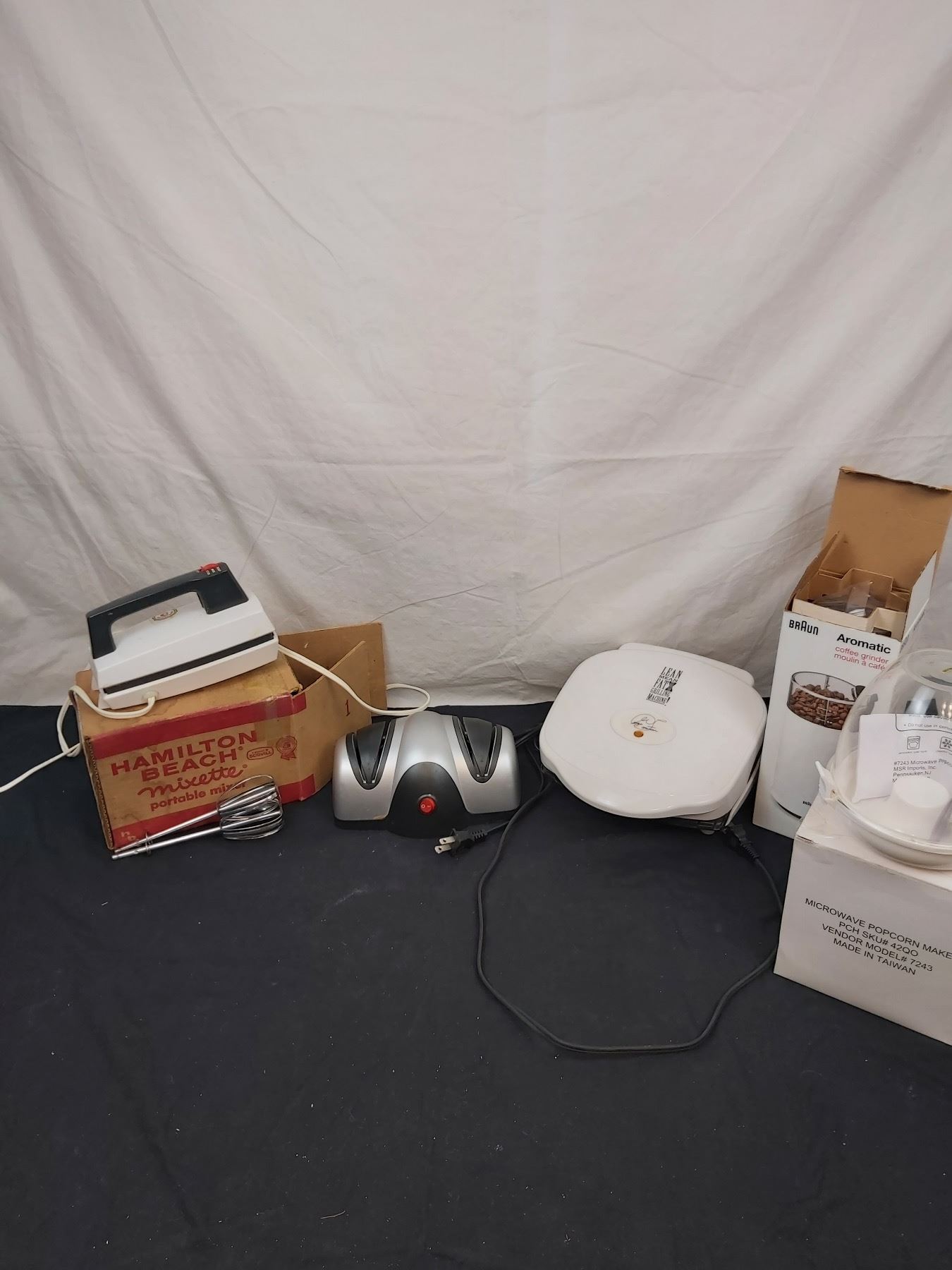 Includes, Hamilton Beach Mixette, Knife sharpener, George Foreman grill, etc. working condition