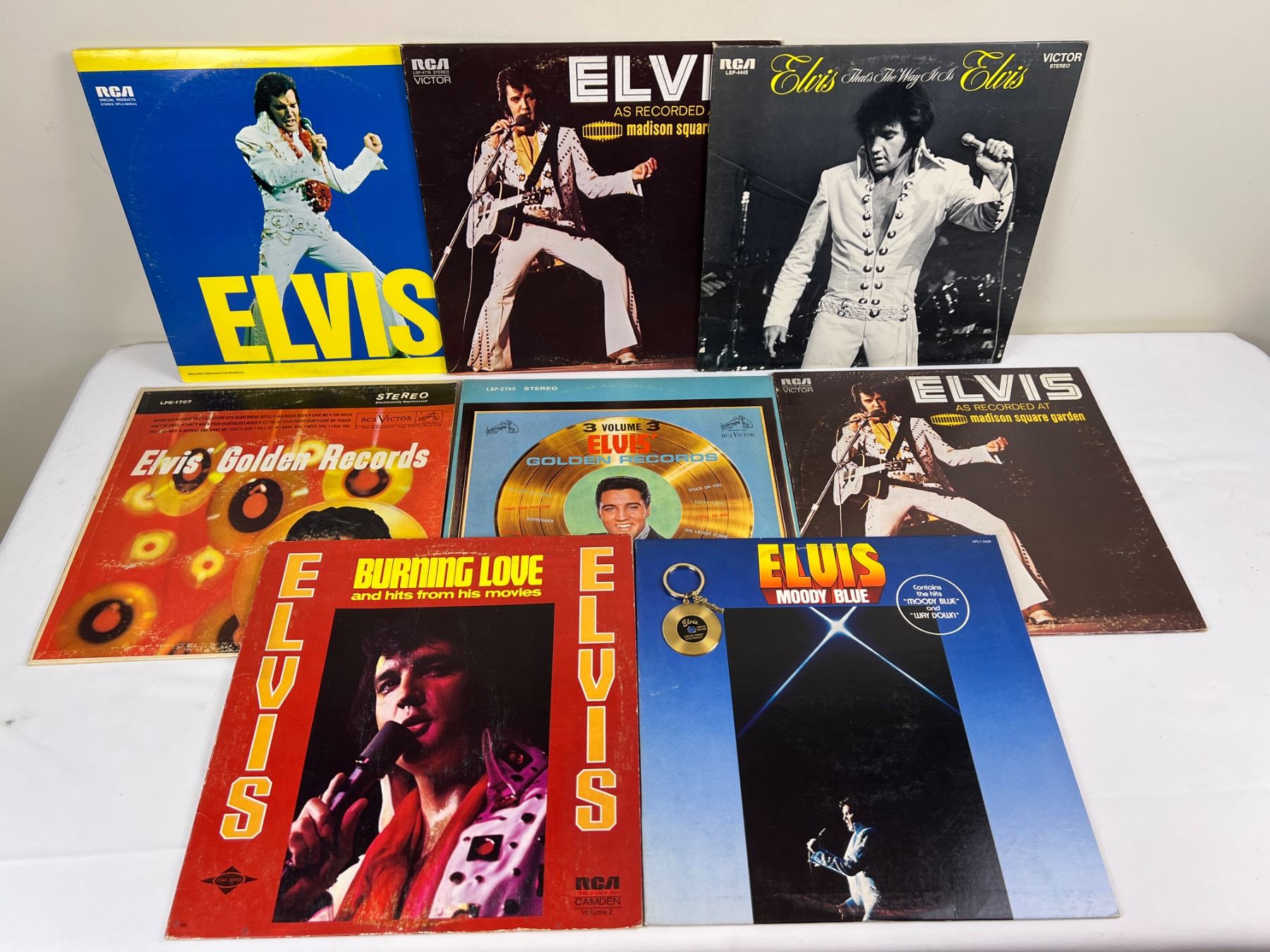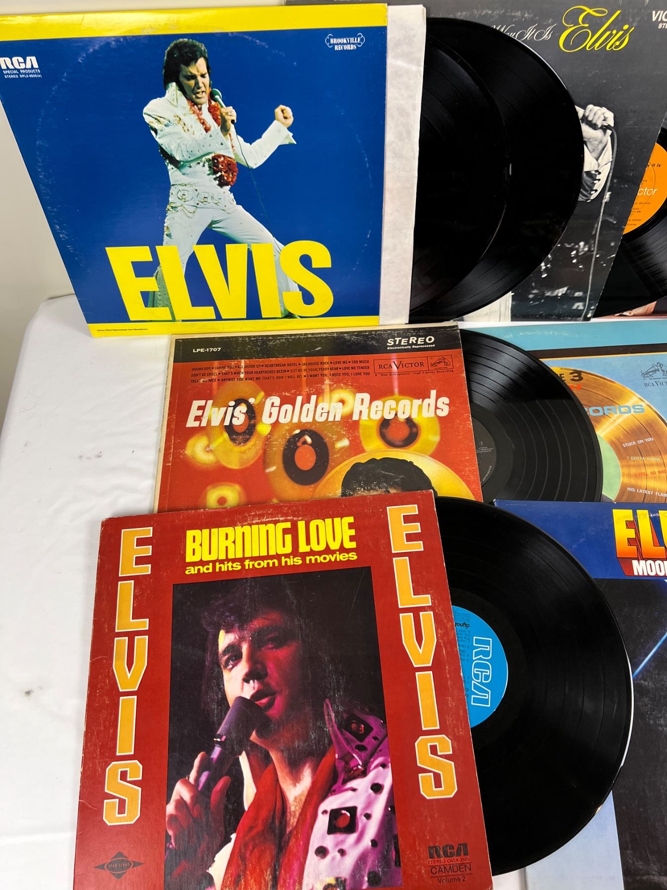 Includes variety of Elvis vinyls and collectible keychain. Some records missing sleeves, condition of records unknown.