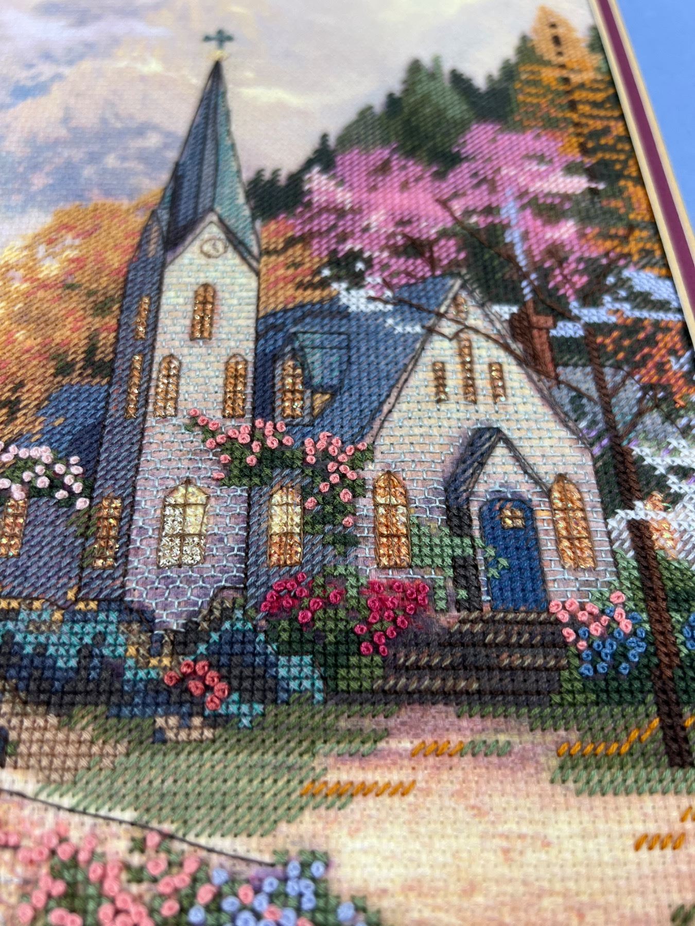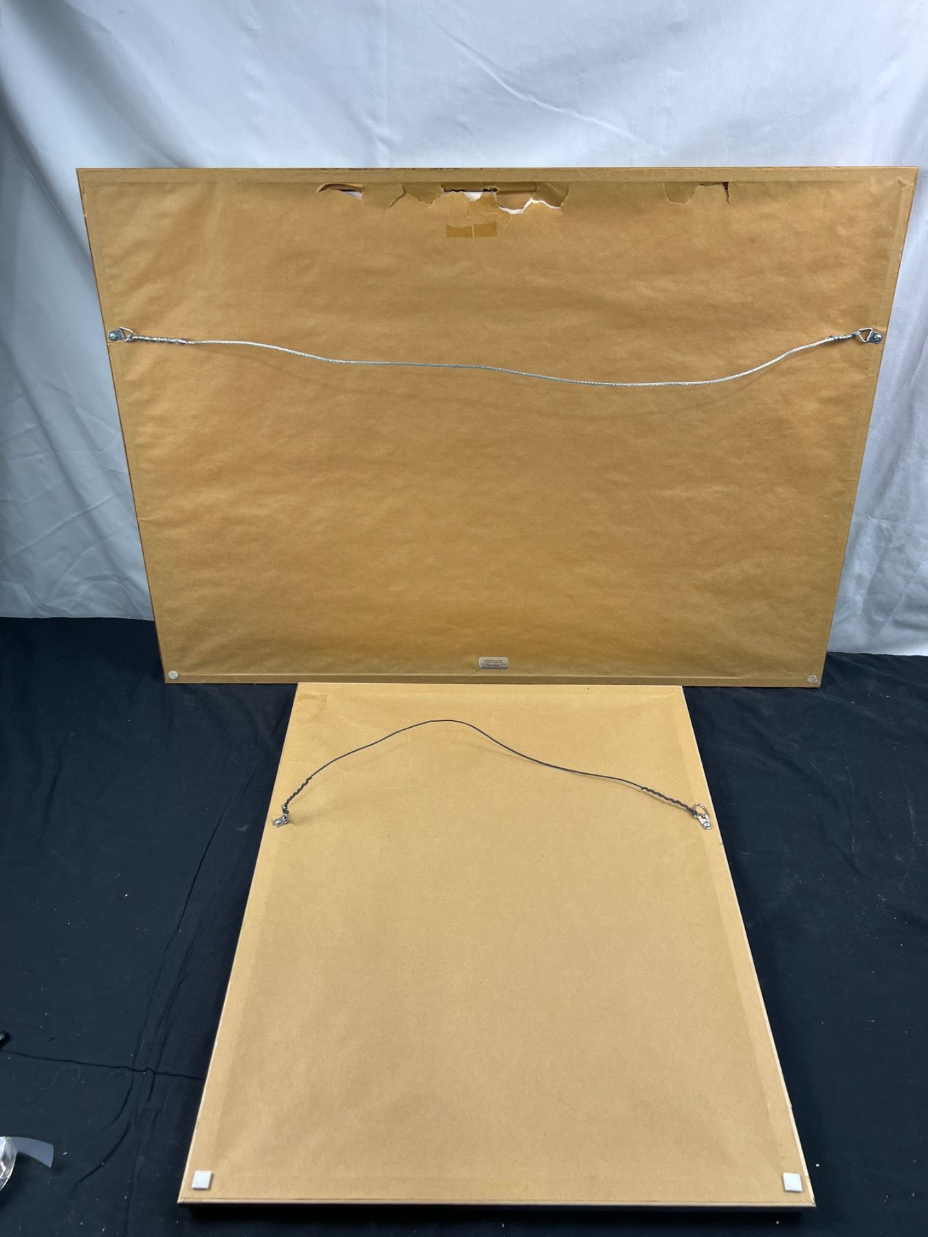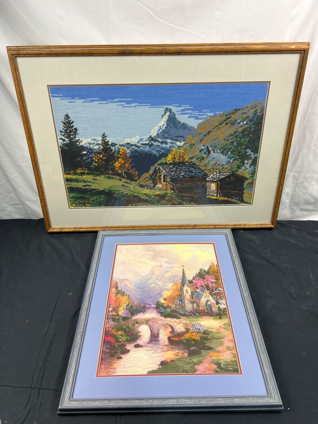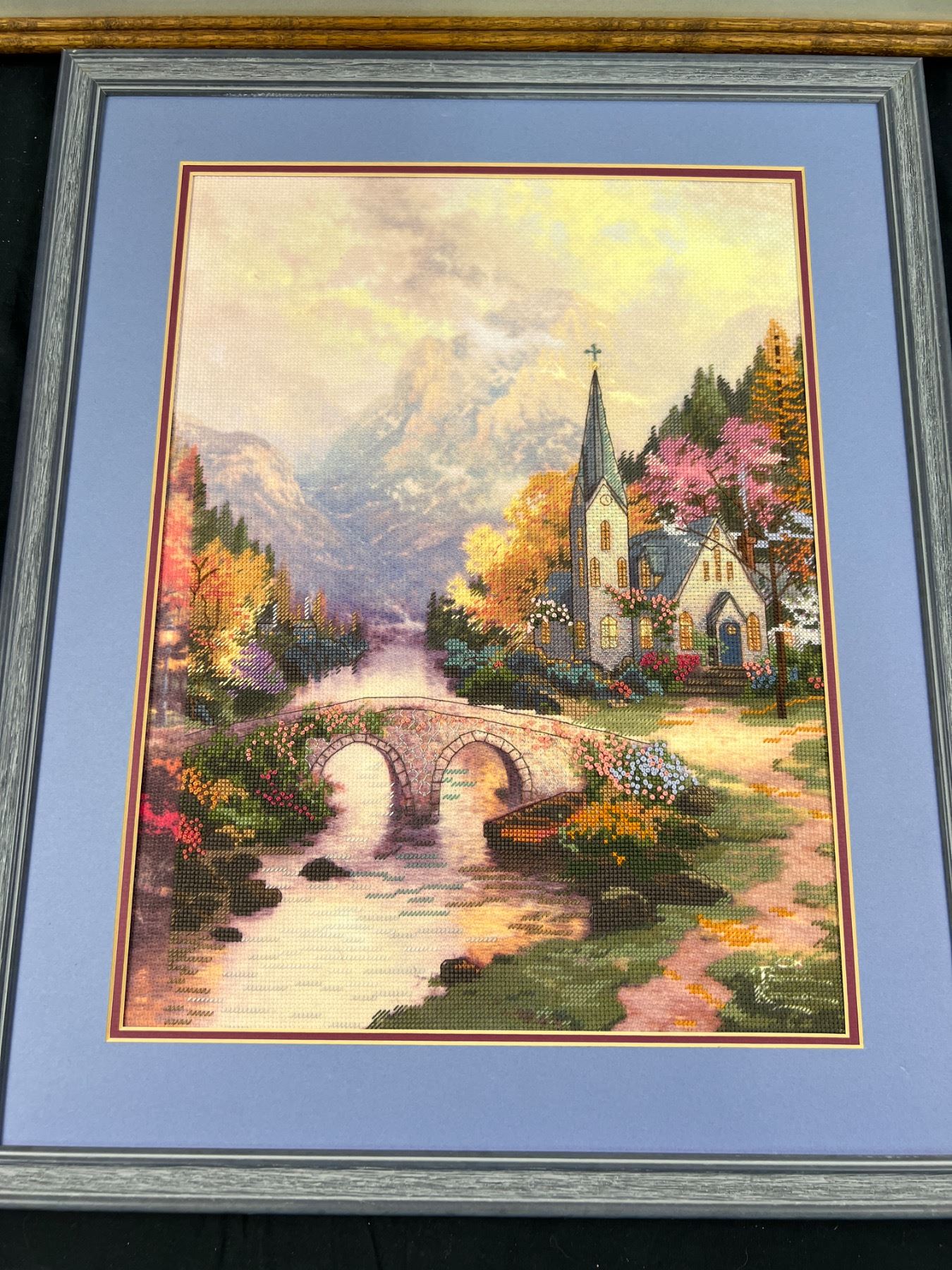 Larger piece measures 30" by 22". The smaller artwork has an impressive array of colours, the windows of the church almost look illuminated. Photos struggle to do it justice.