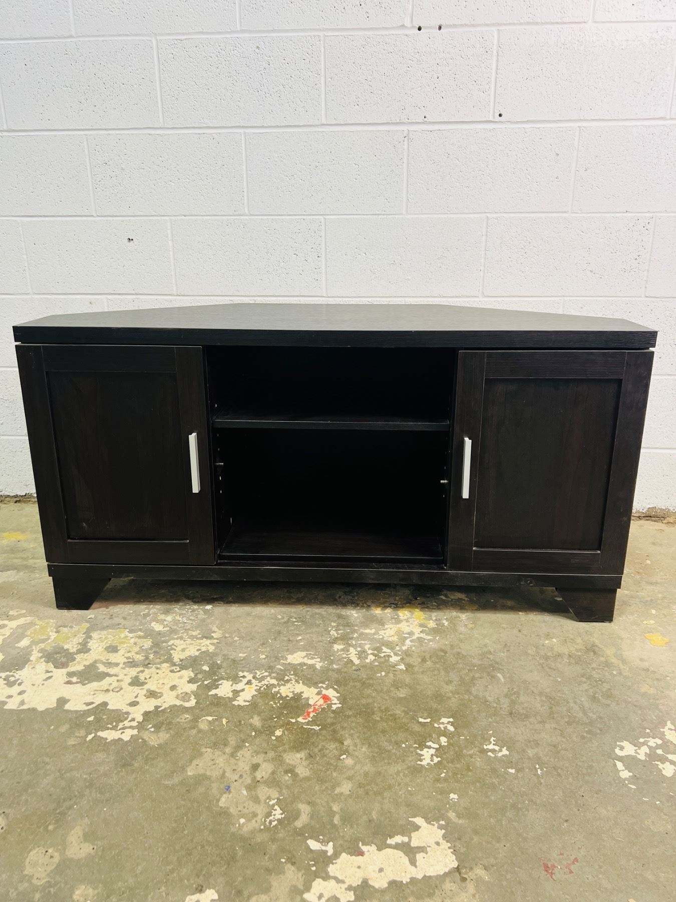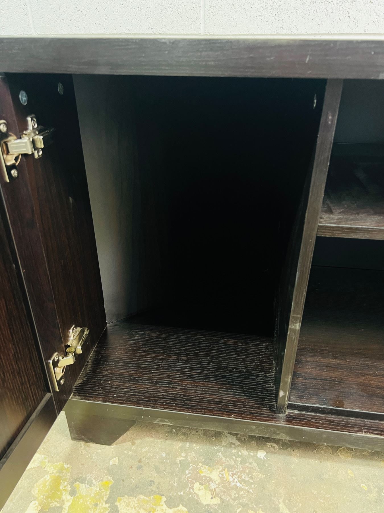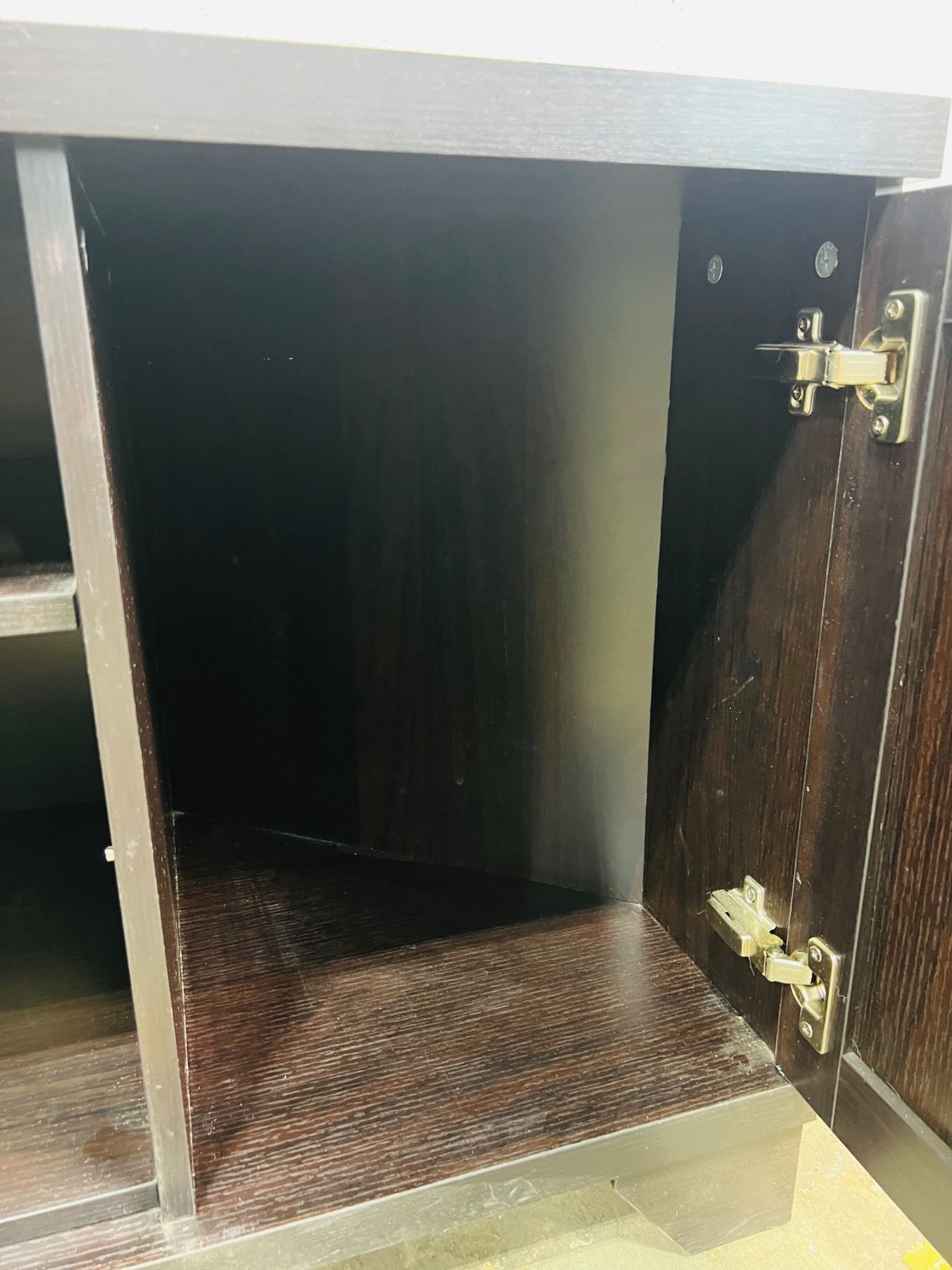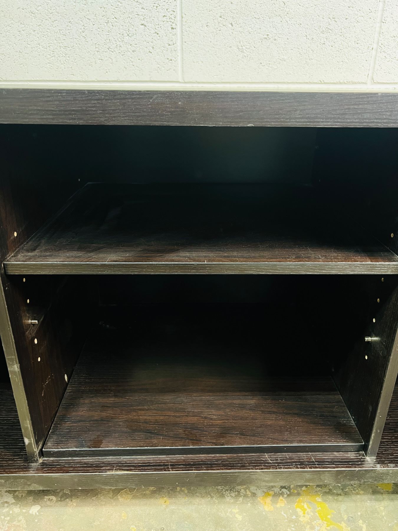 Missing two self pegs, has a water stain on the back panel, measures 24" H by 47" wide and 18" deep