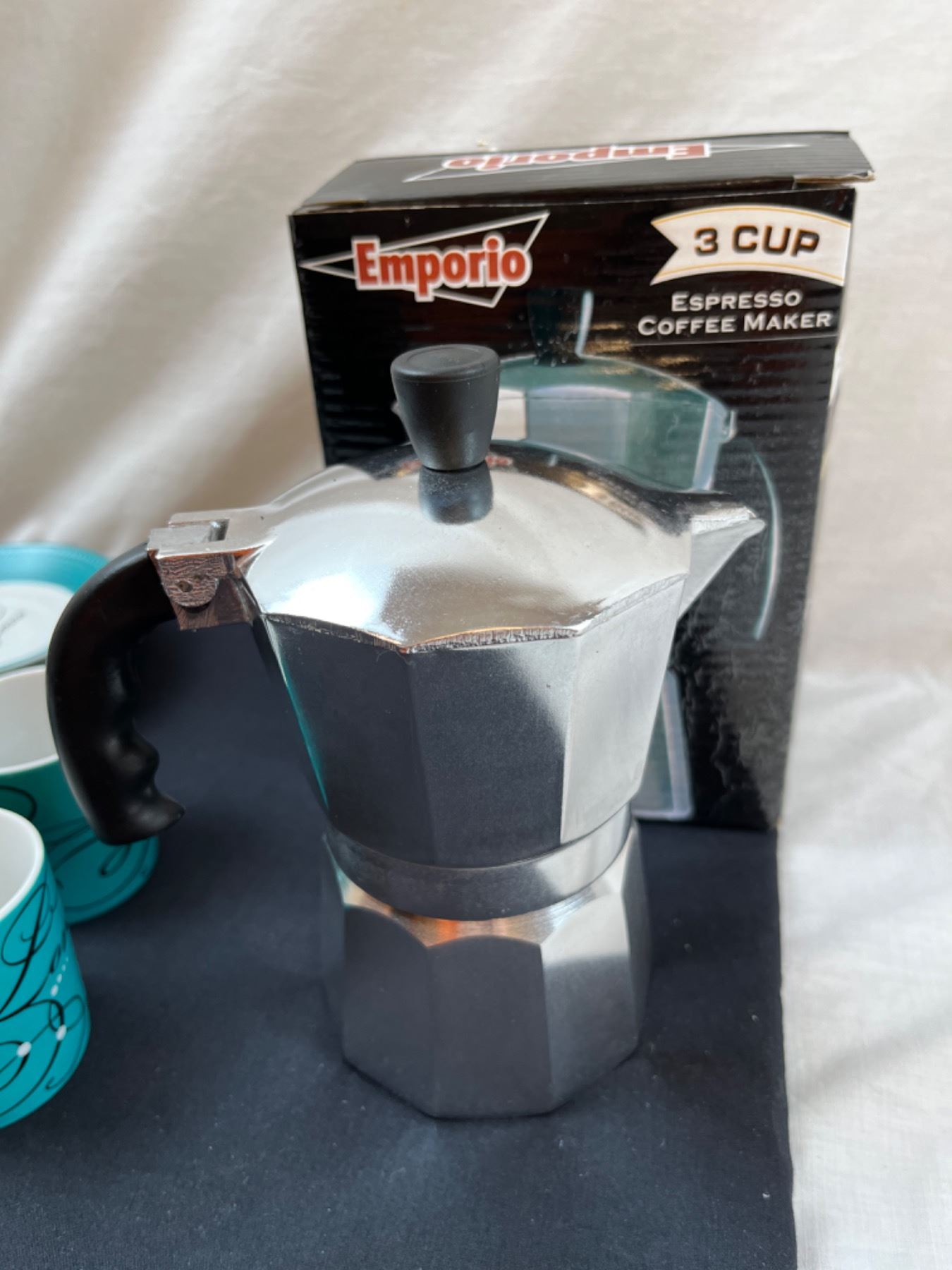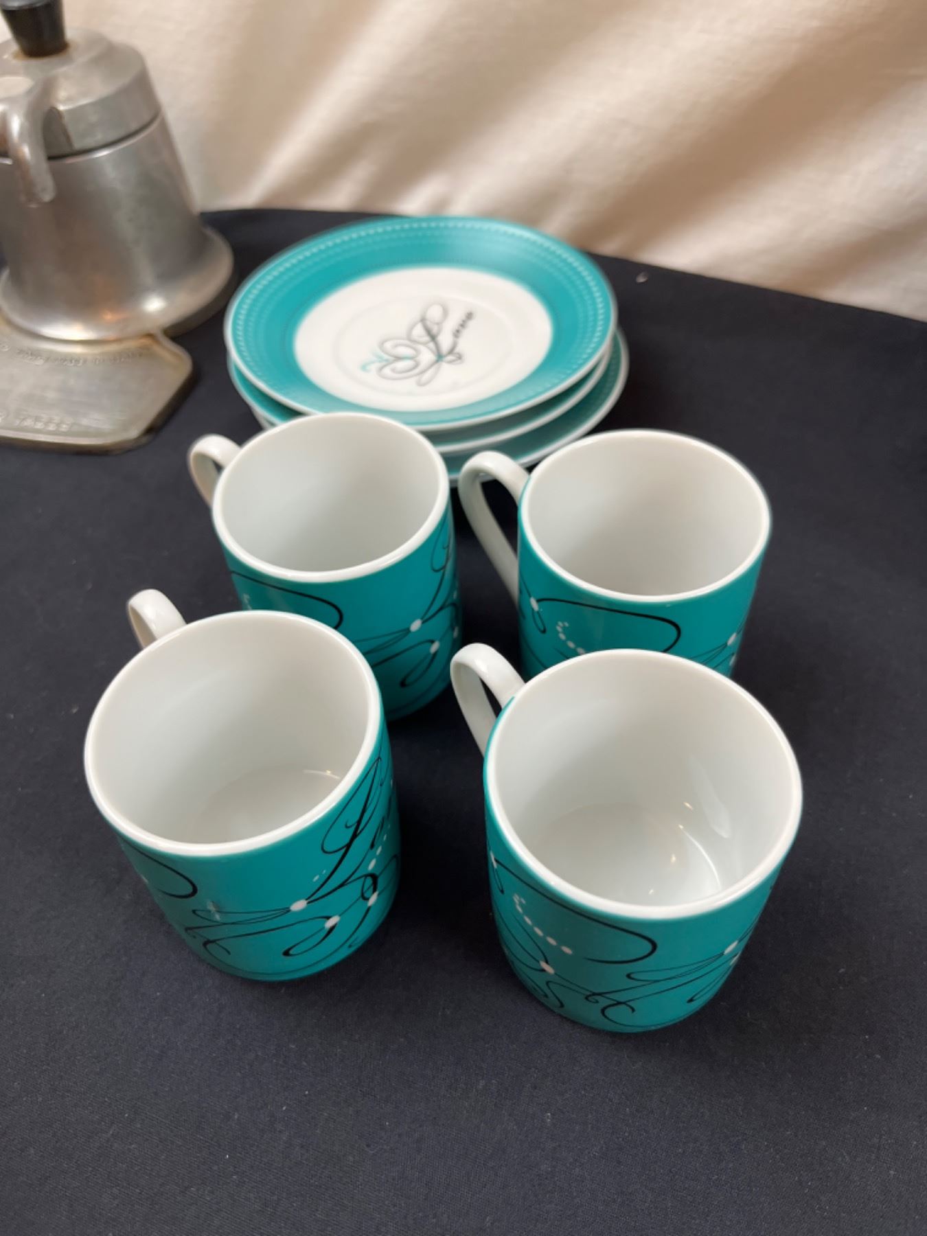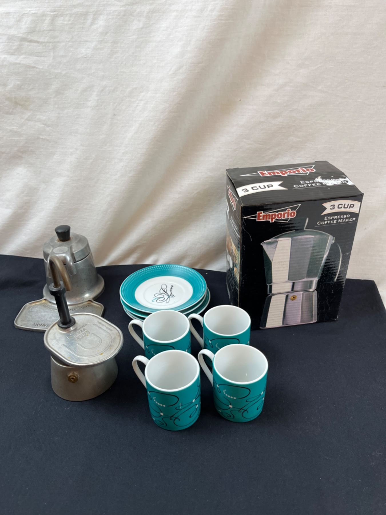 Emporio Coffee Maker, 4 Artisano Cups & Saucers