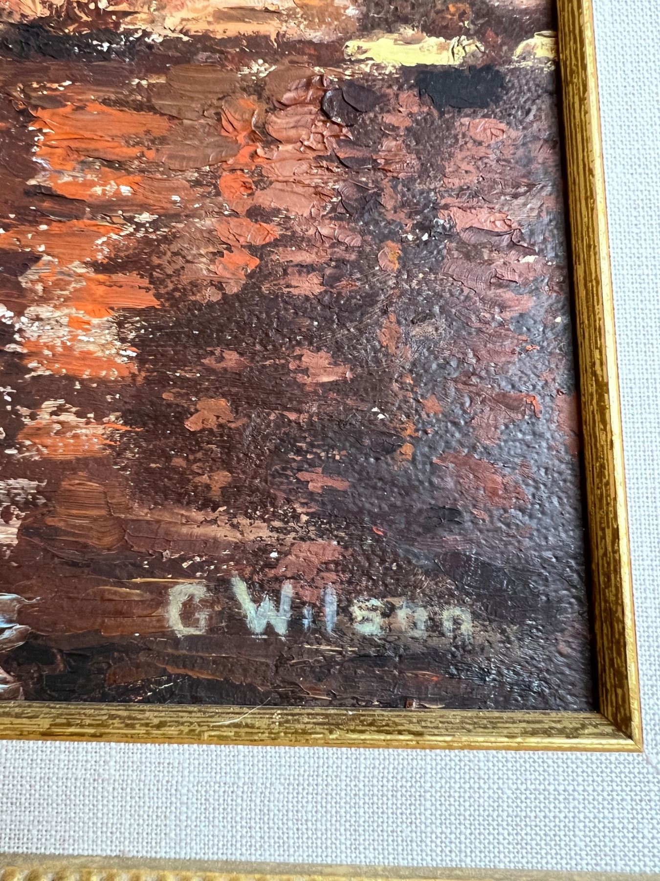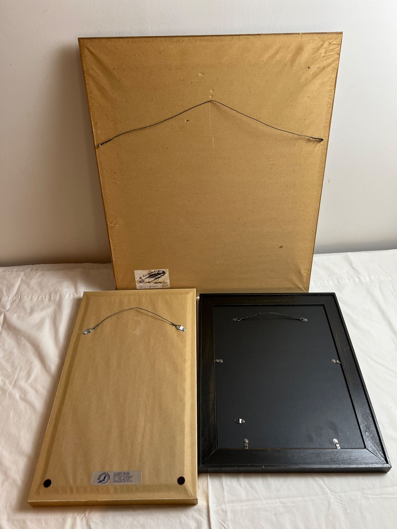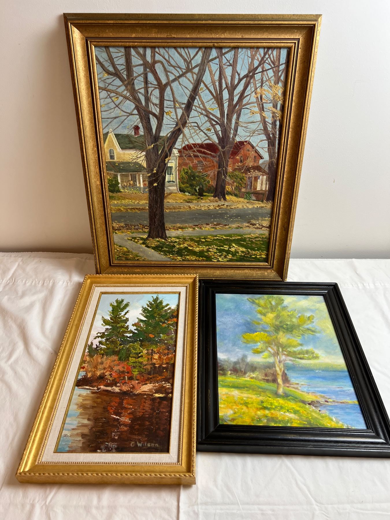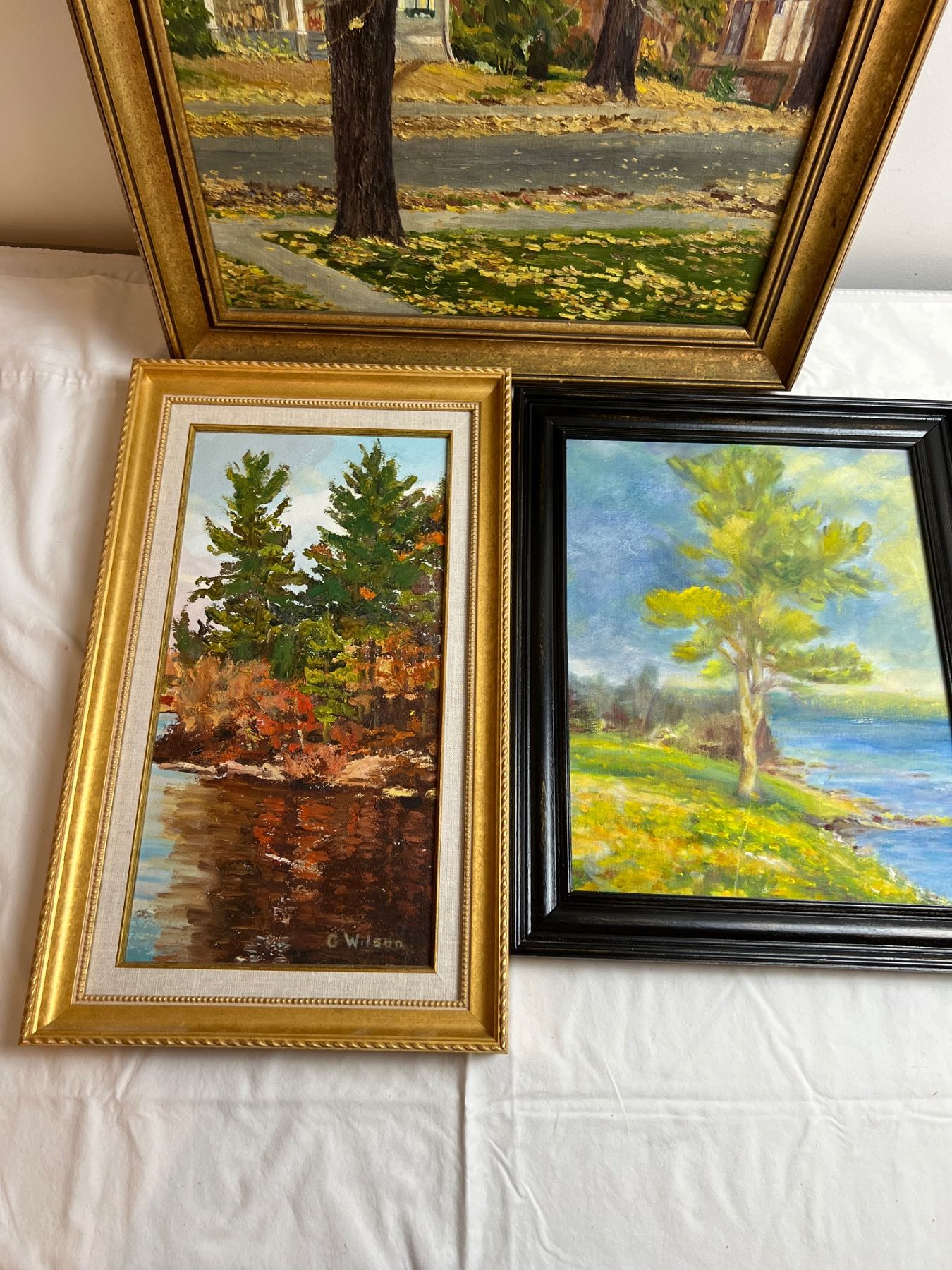 One of the artworks is by G. Wilson. Unknown if originals or prints but the largest artwork and the G. Wilson artwork both have texture and raised sections. Largest artwork measures 20" by 24"