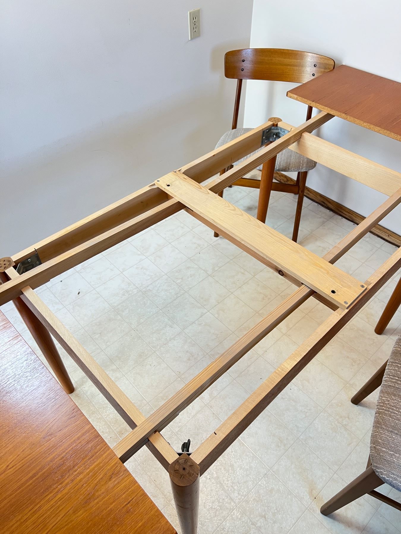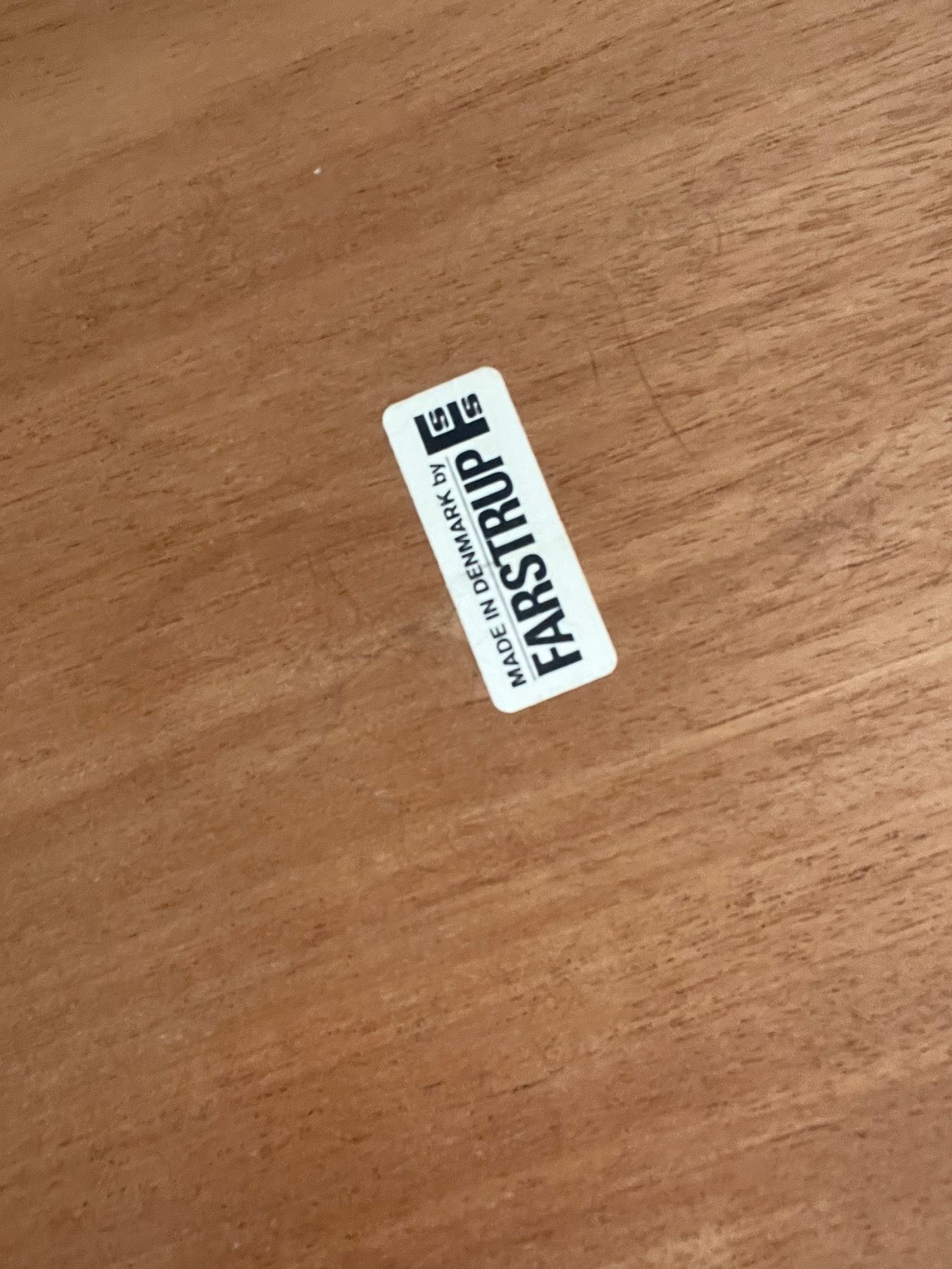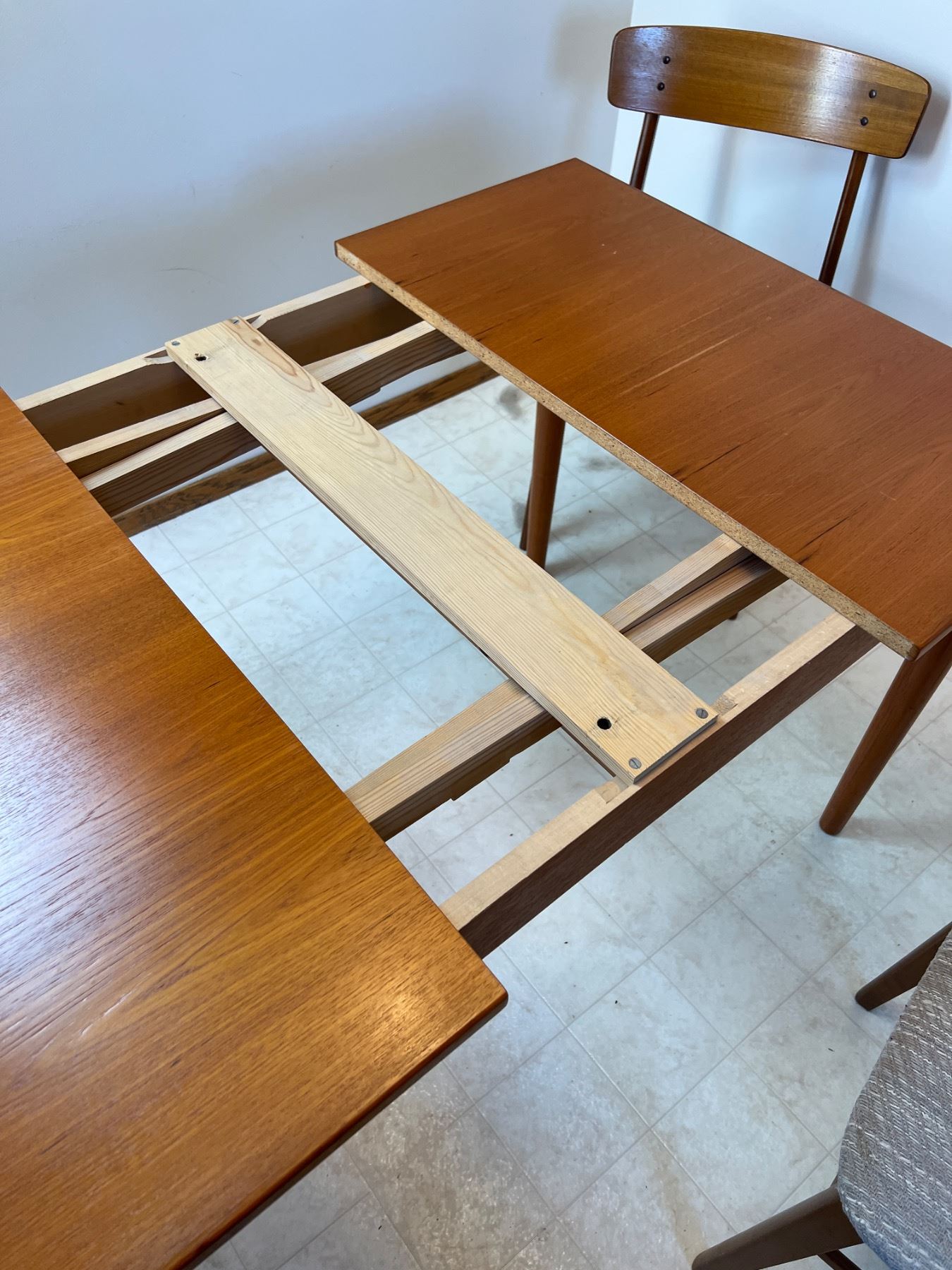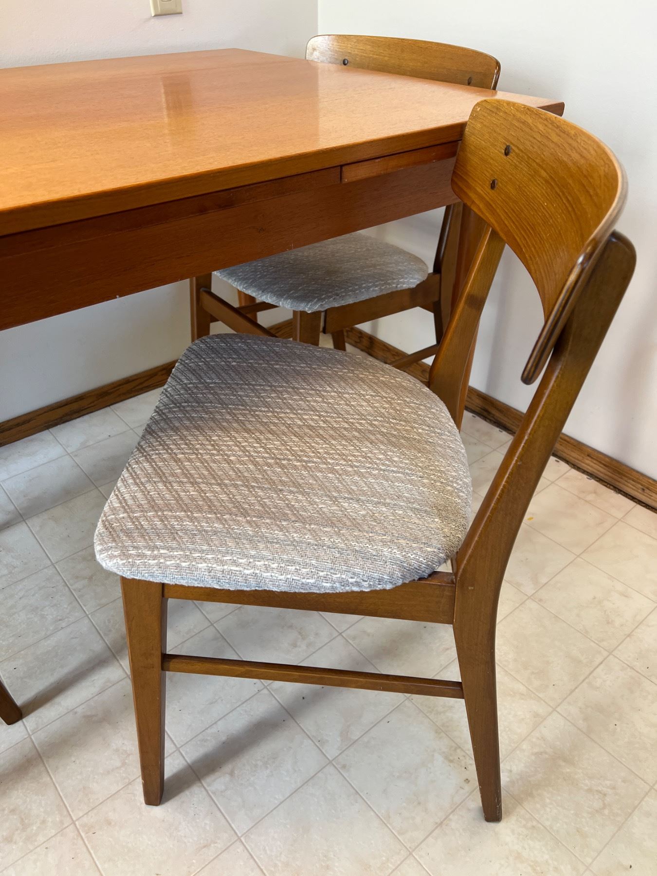 Table top has a water mark and some scuffing, only three chairs, made in Denmark