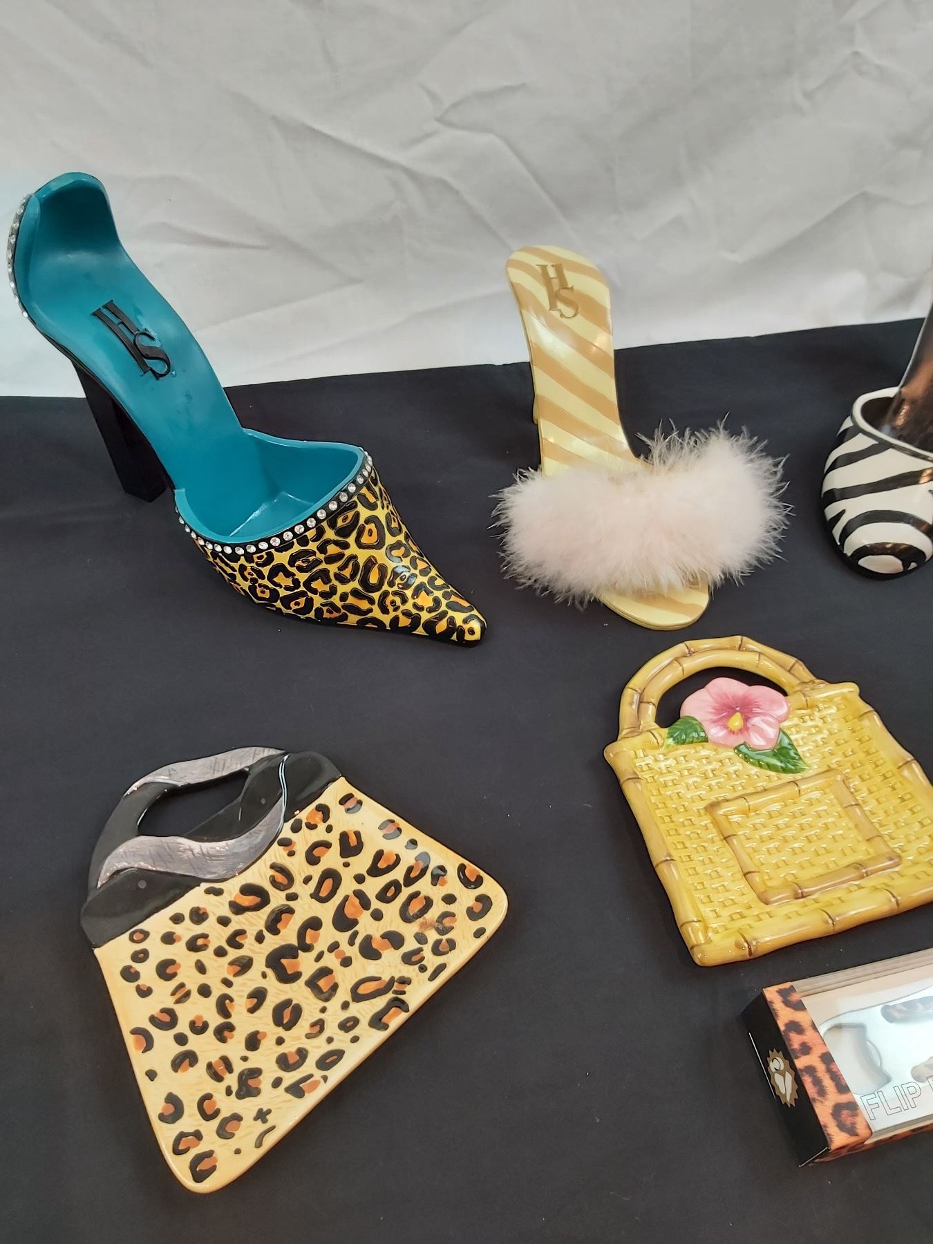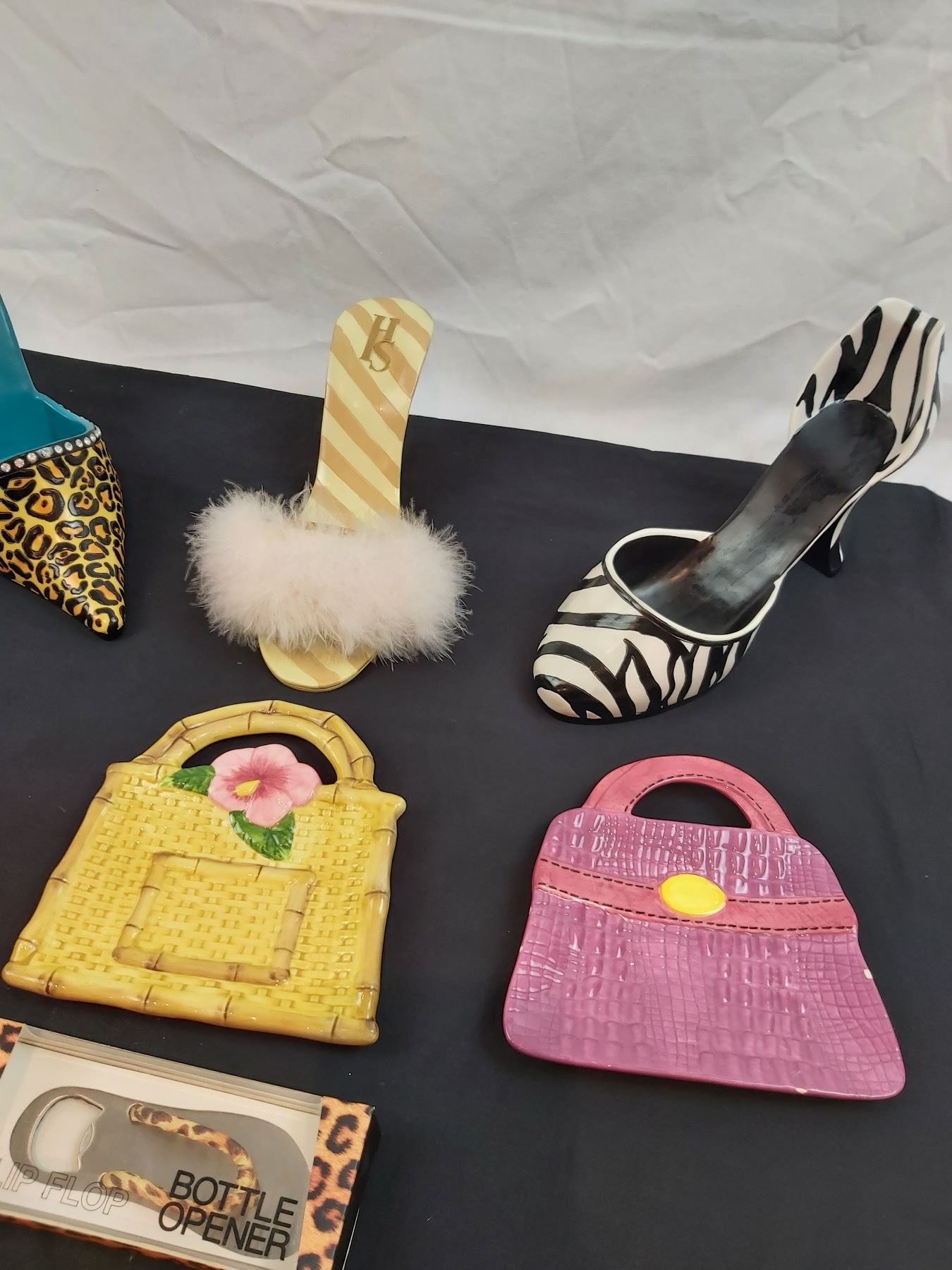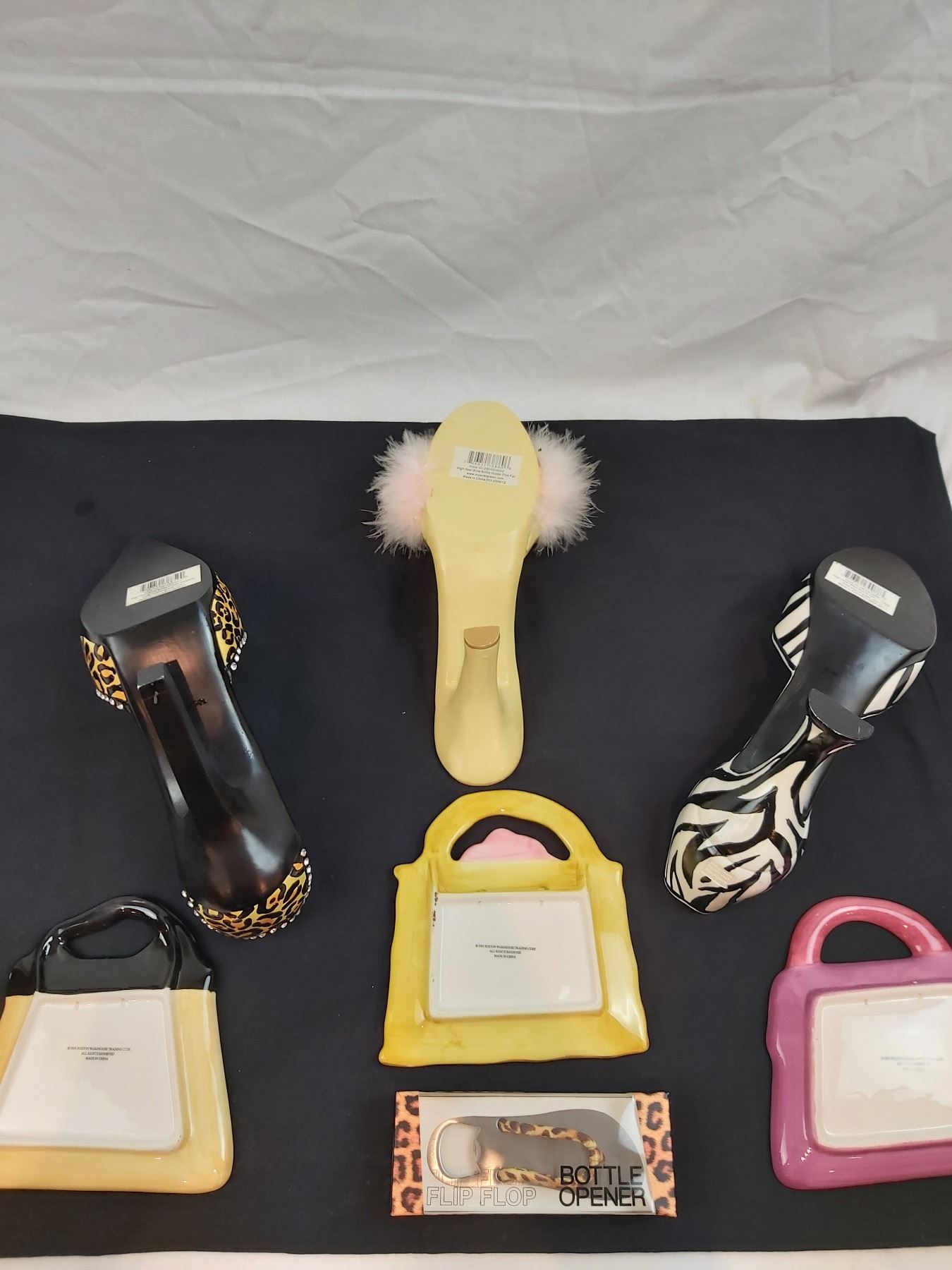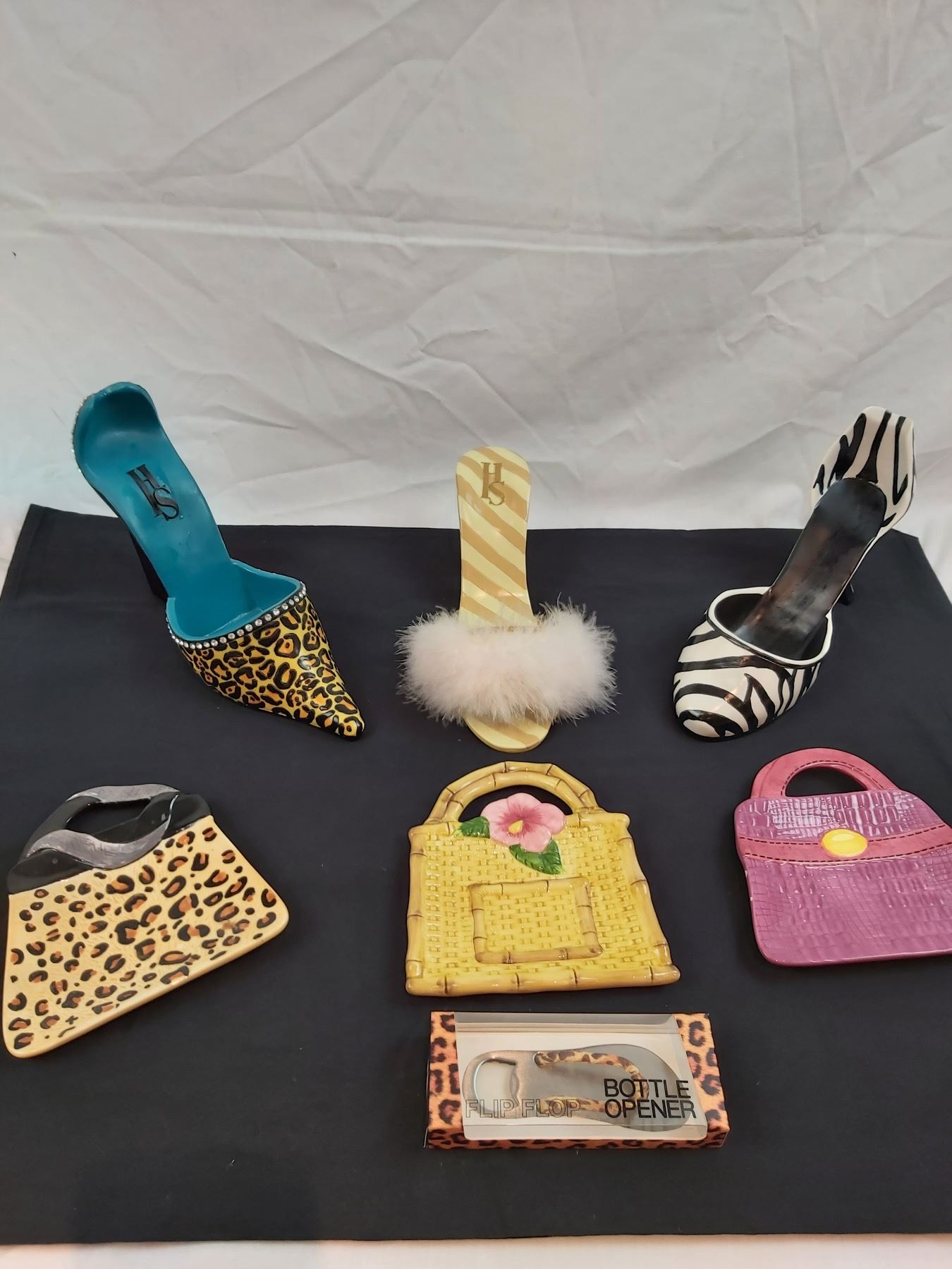 Includes, High heel bottle holders, purse plates (one is chipped), flip flop bottle opener, etc.
