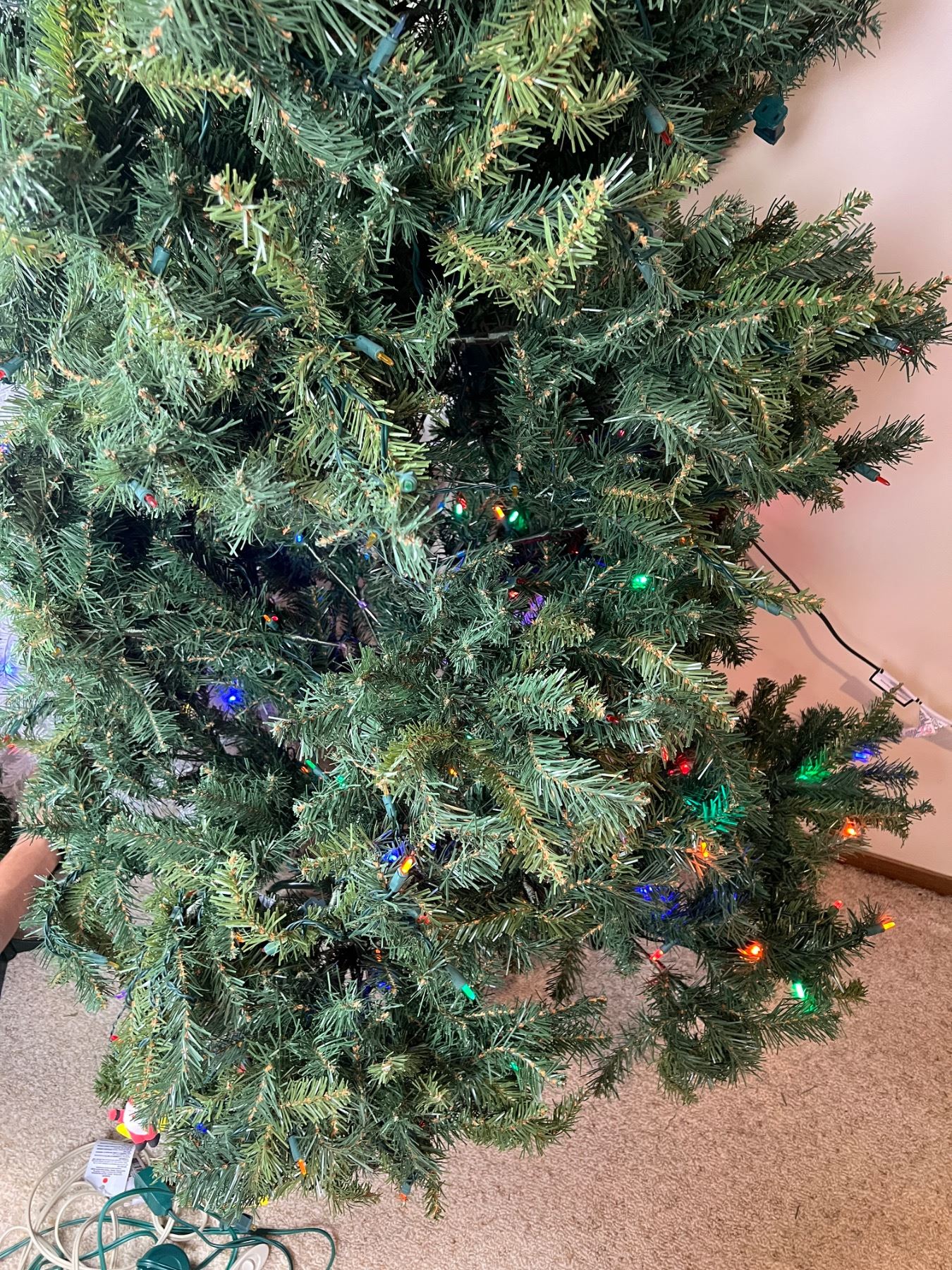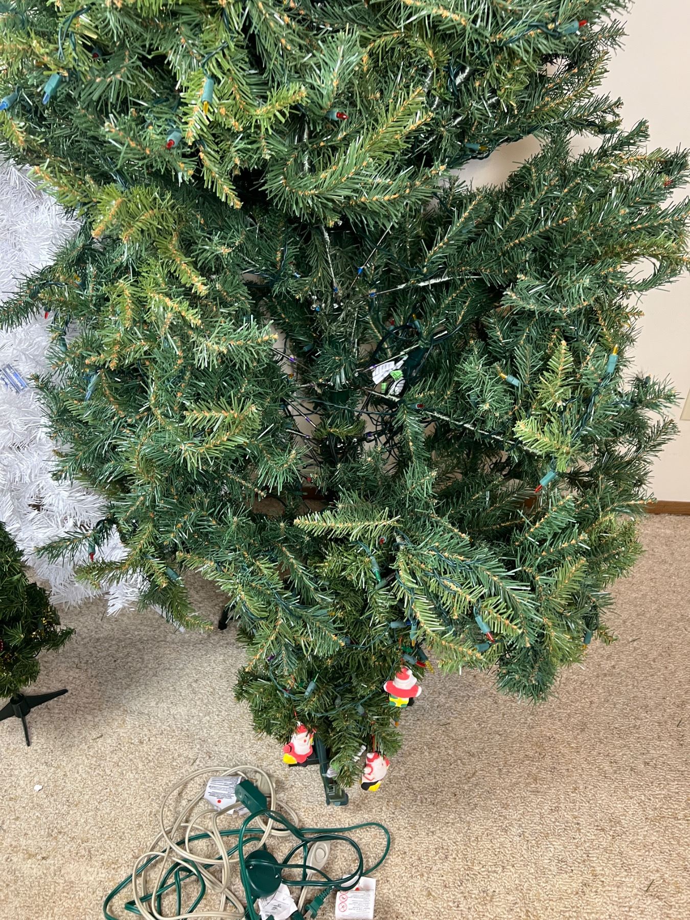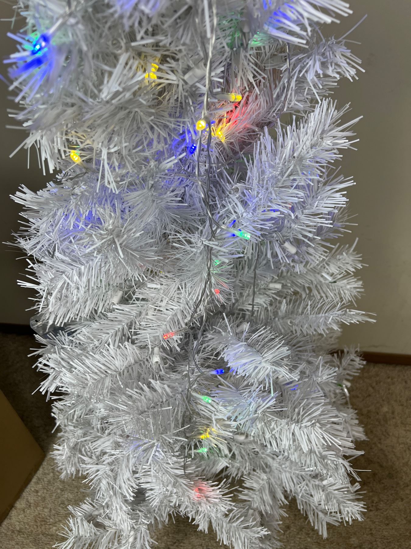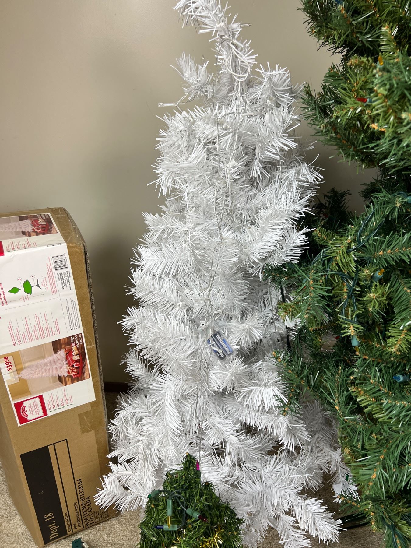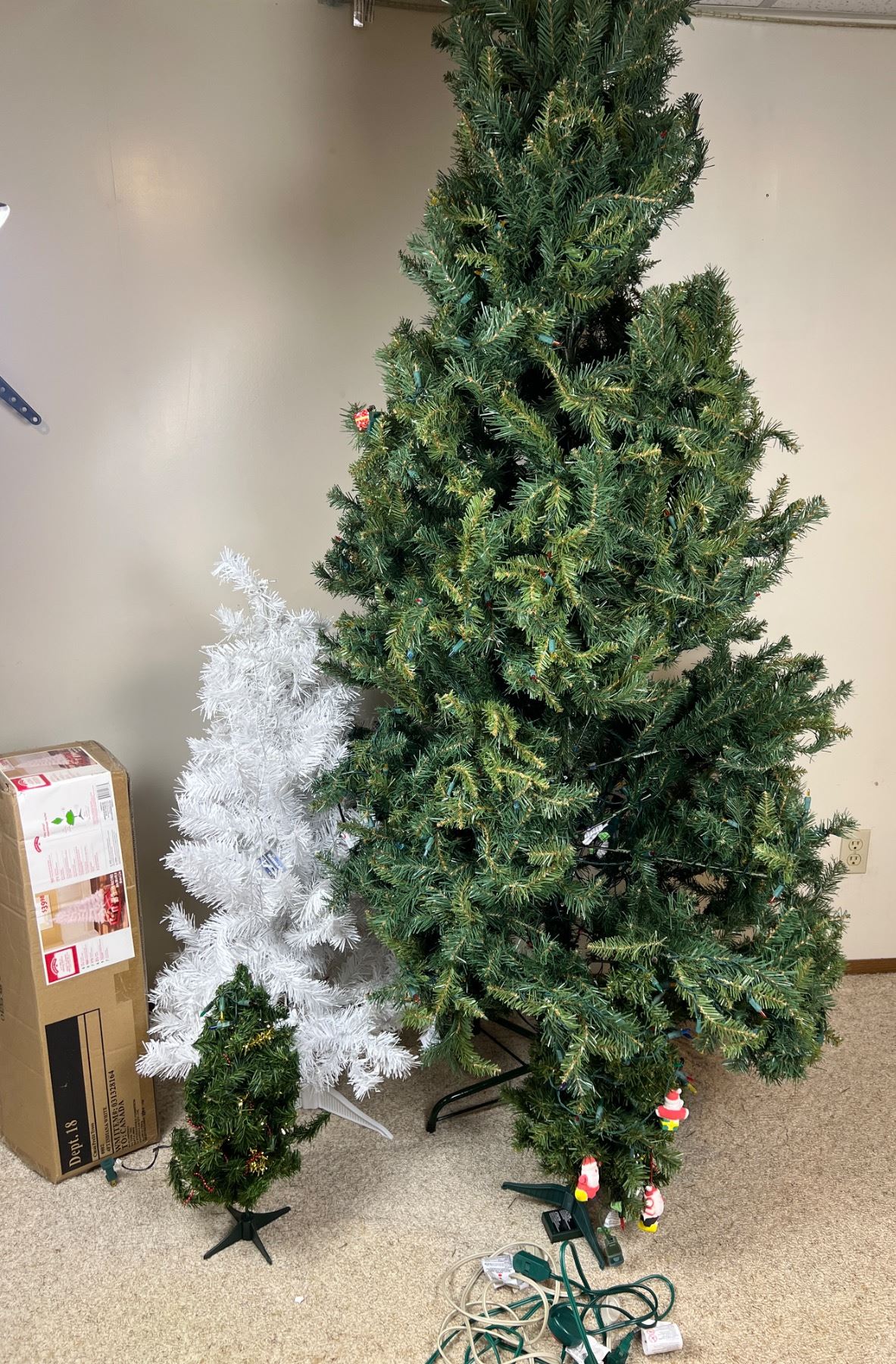 The large Christmas tree has some burnt bulbs (6.5'), Includes a 4' Indiana Spruce white tree (lights work)