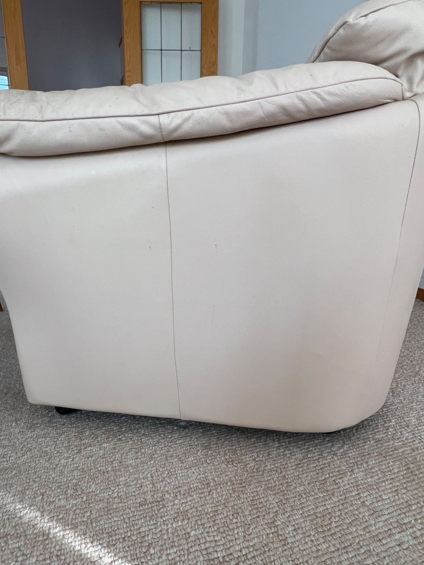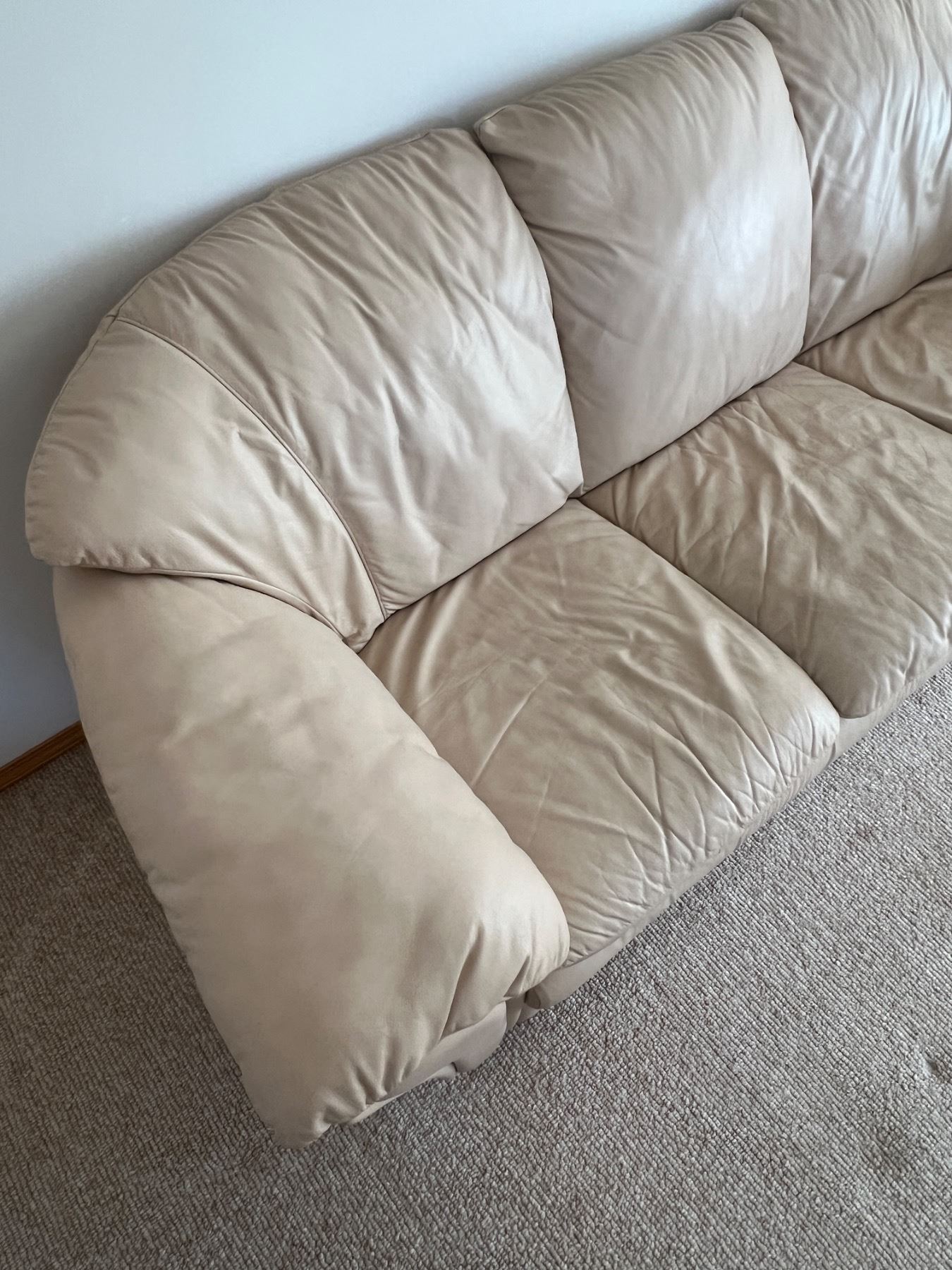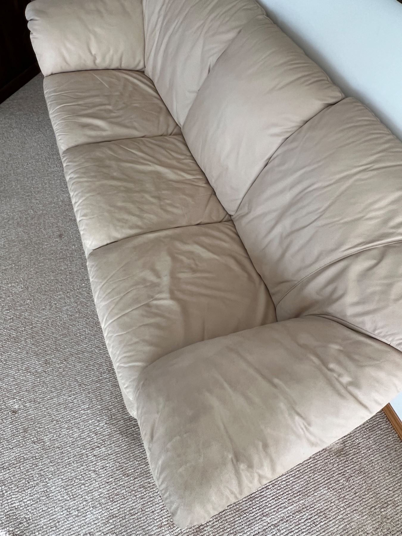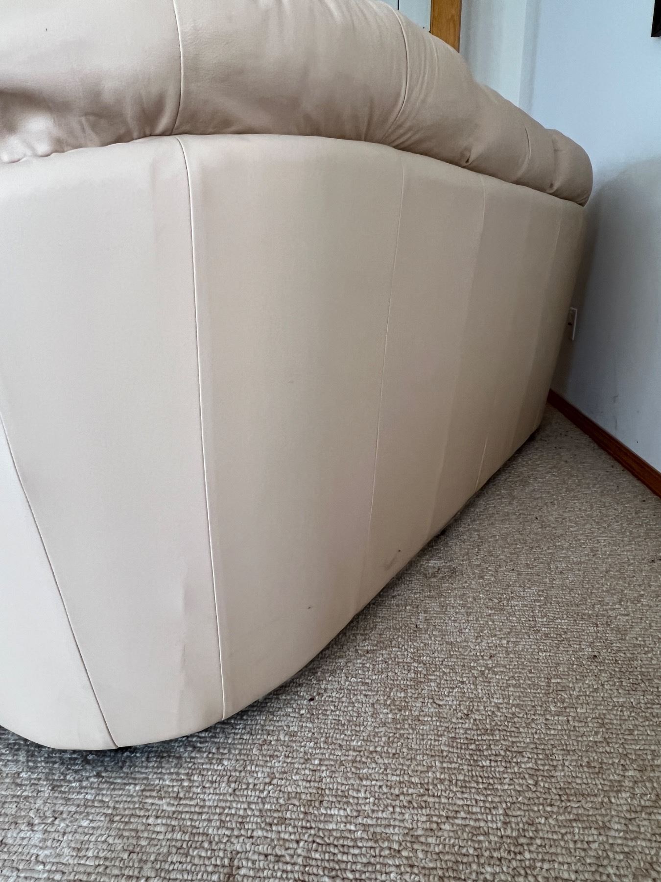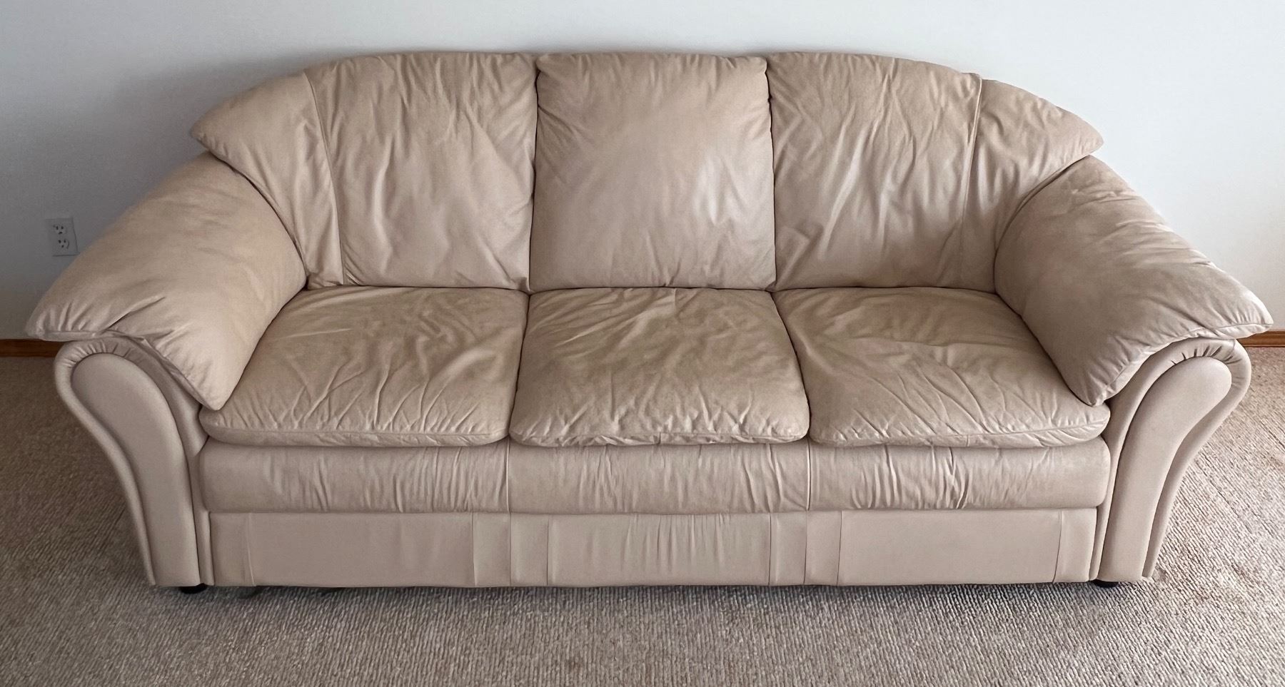 May be real leather unable to confirm. Measures 32"H by 86"W and 30"D