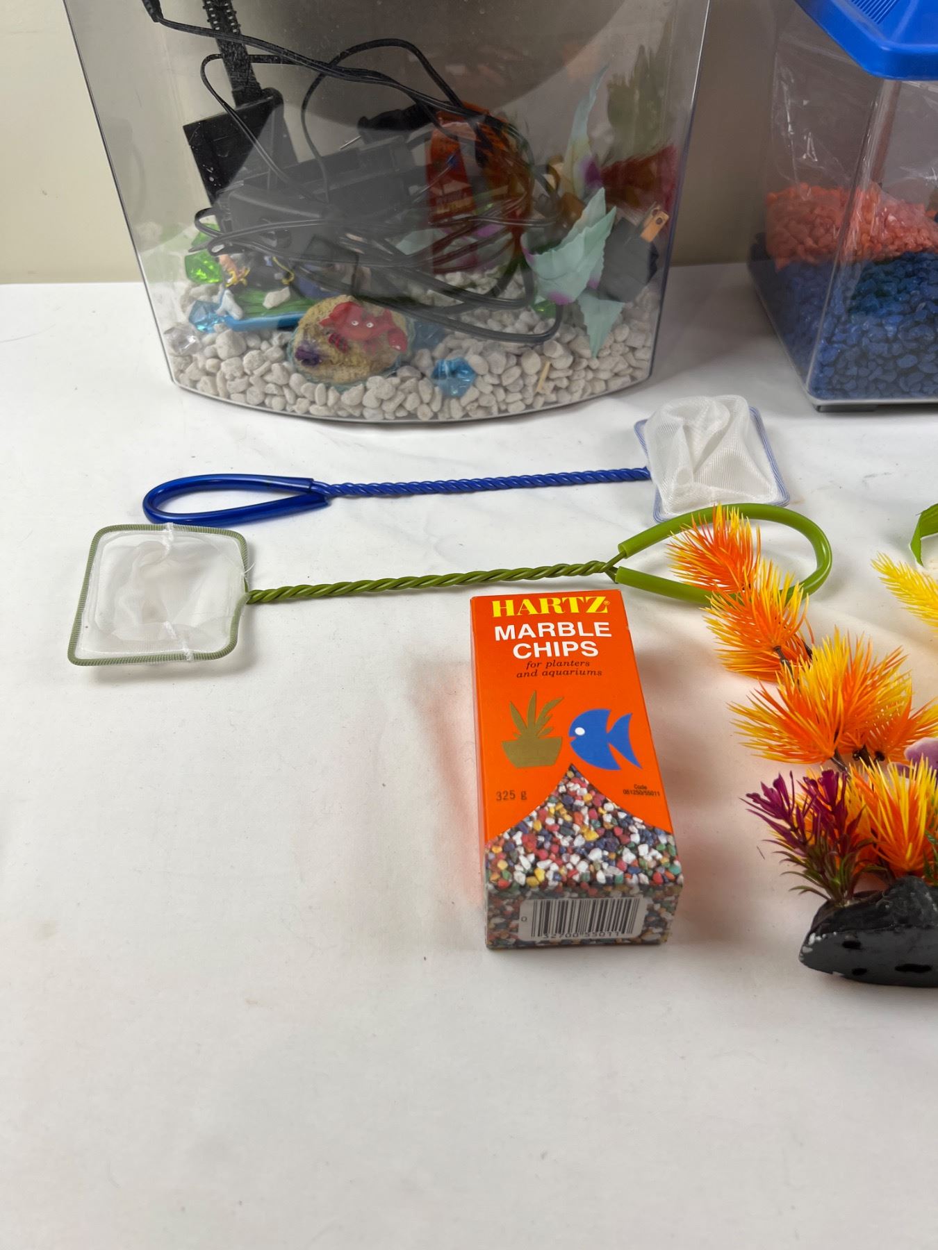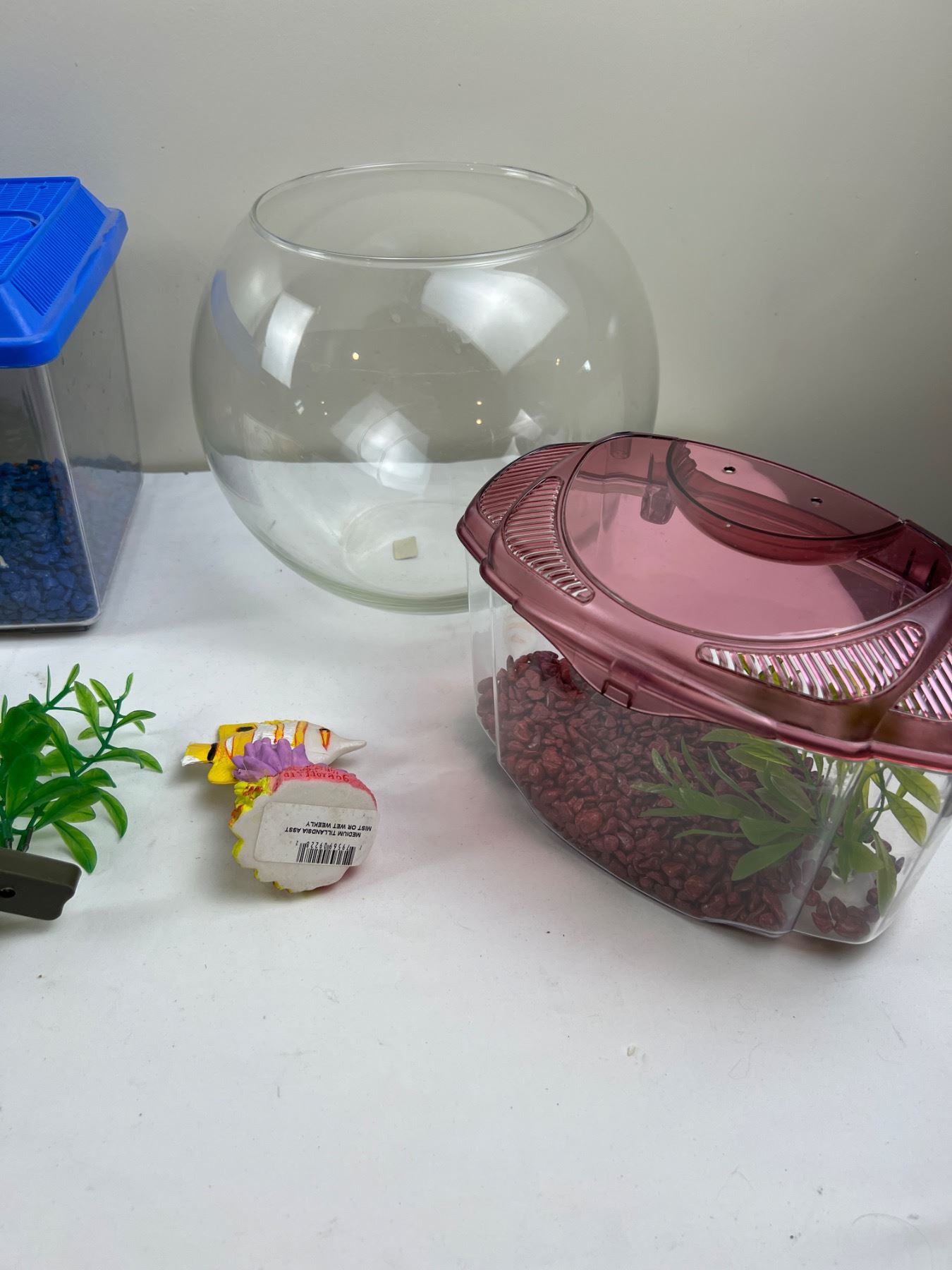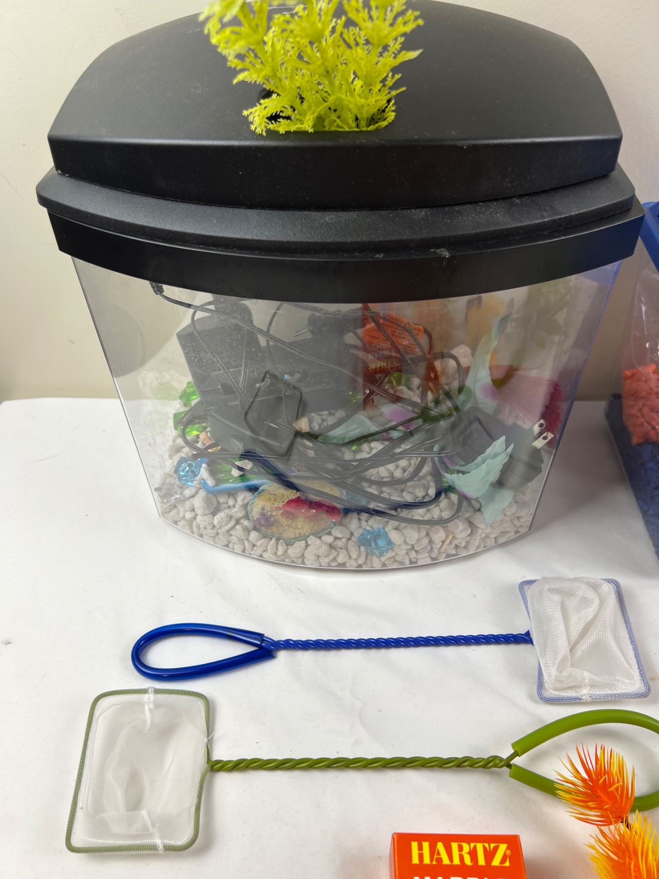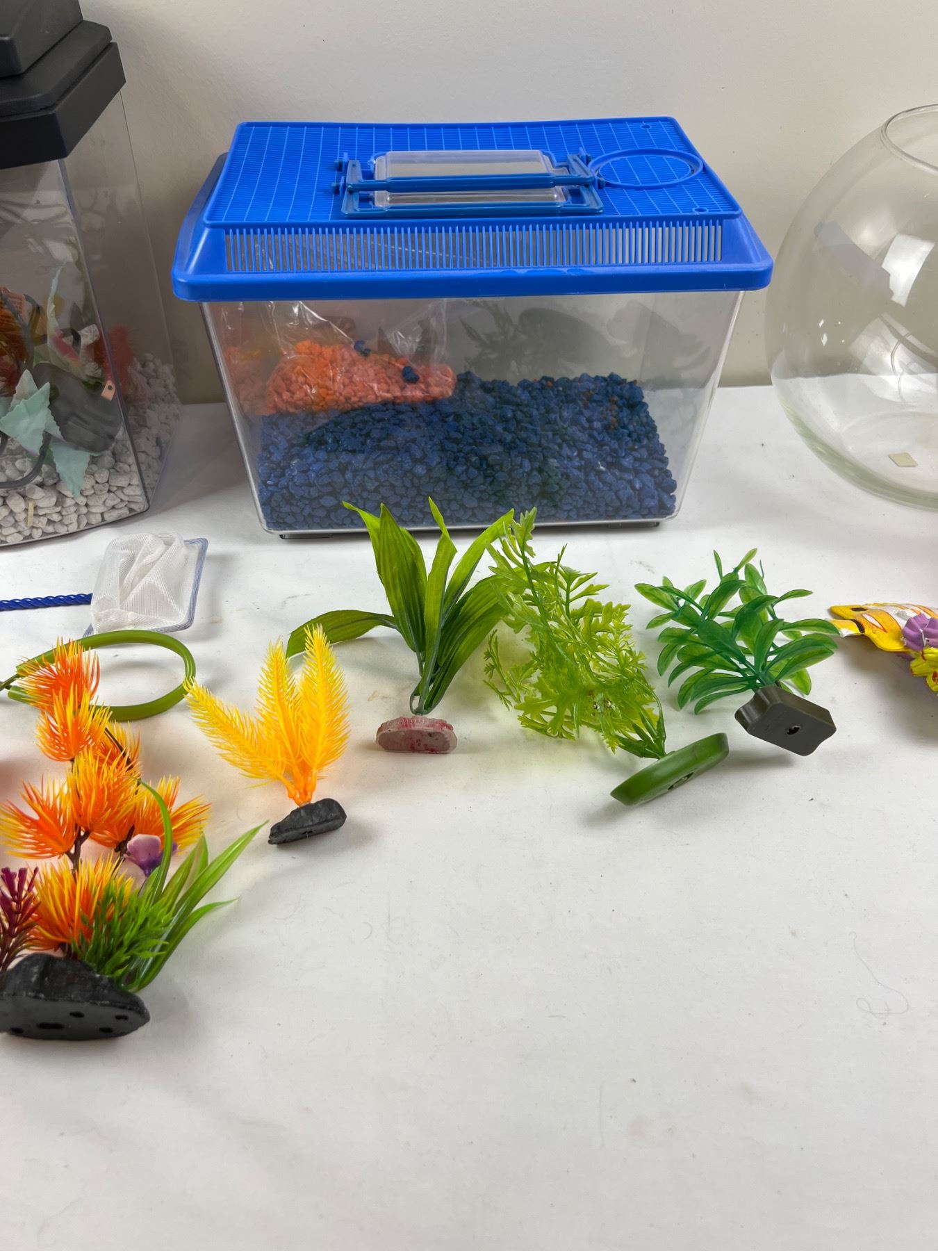 Includes an Aqueon plastic fish tank with a lighted lid (works), Glass fish bowl (10"diameter), pebbles, faux plants, and more
