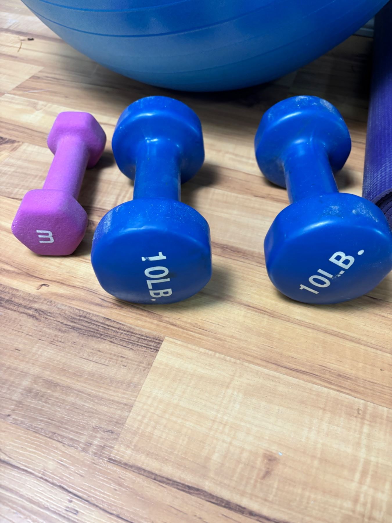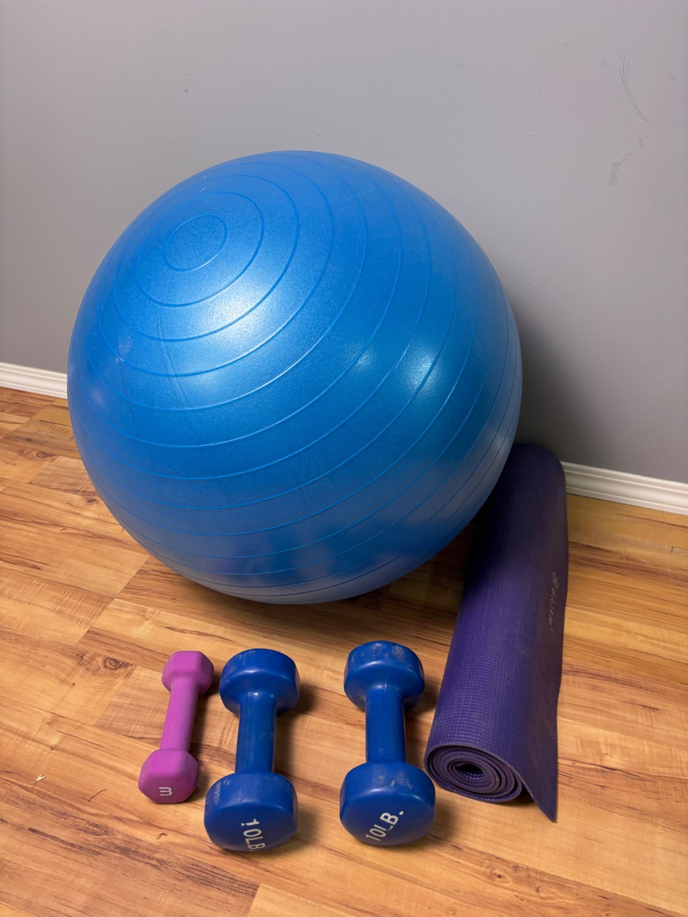 Includes, Gaiam yoga mat, two 10lb and one 3lb weight, yoga ball