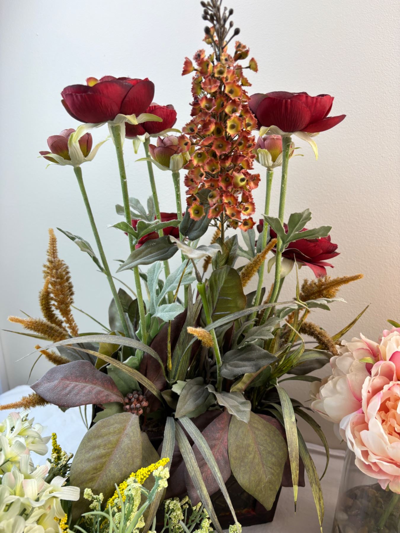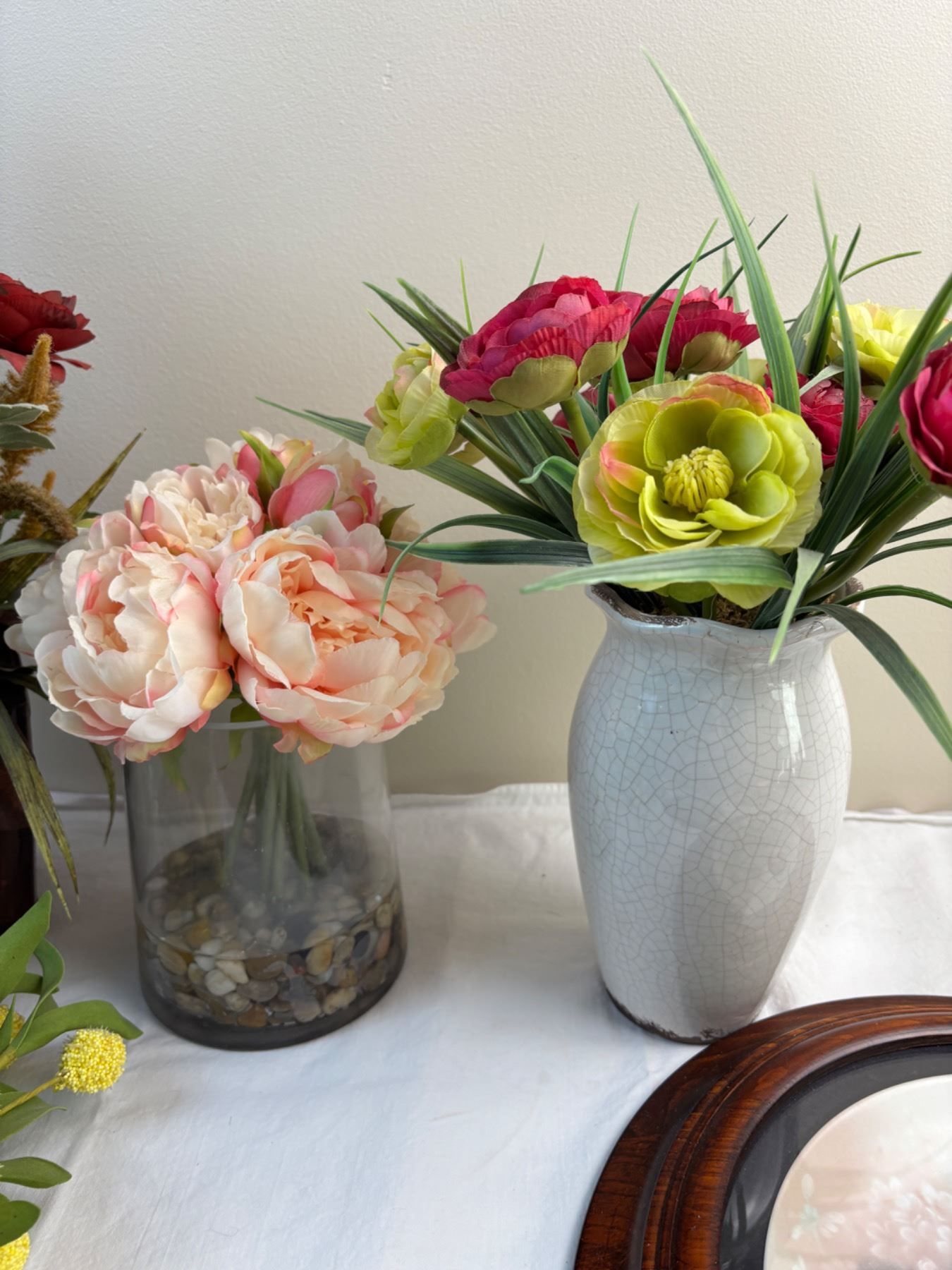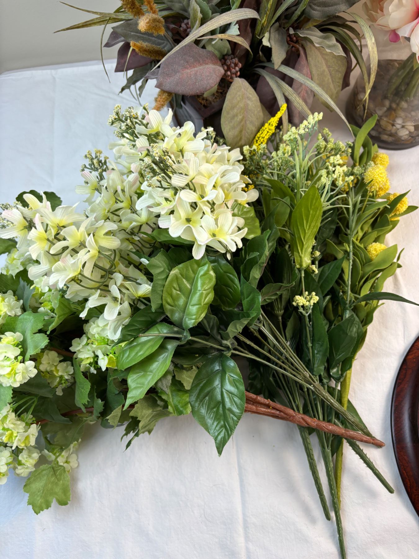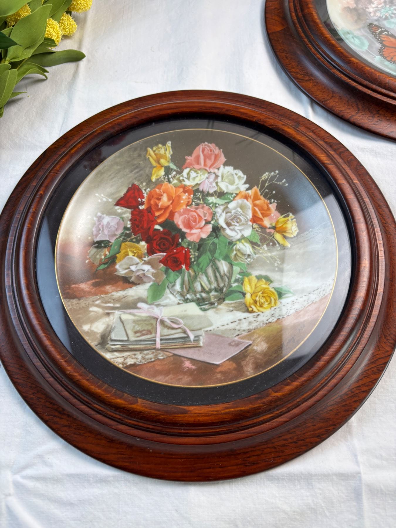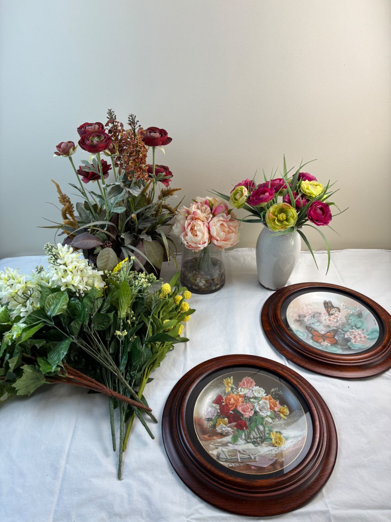 Includes a variety of faux flowers and vases, the two decorative plates in frames are 13.5"diameter