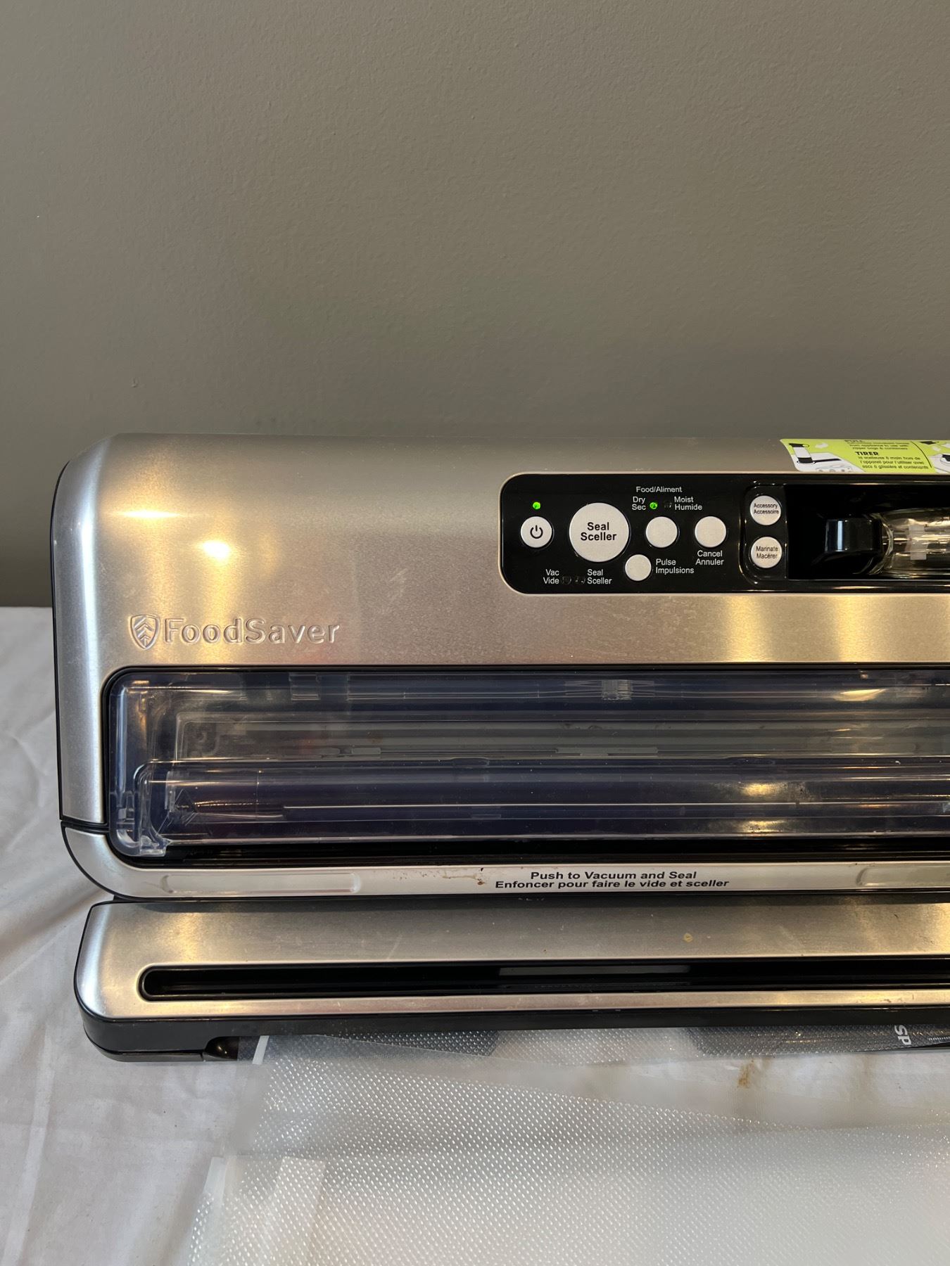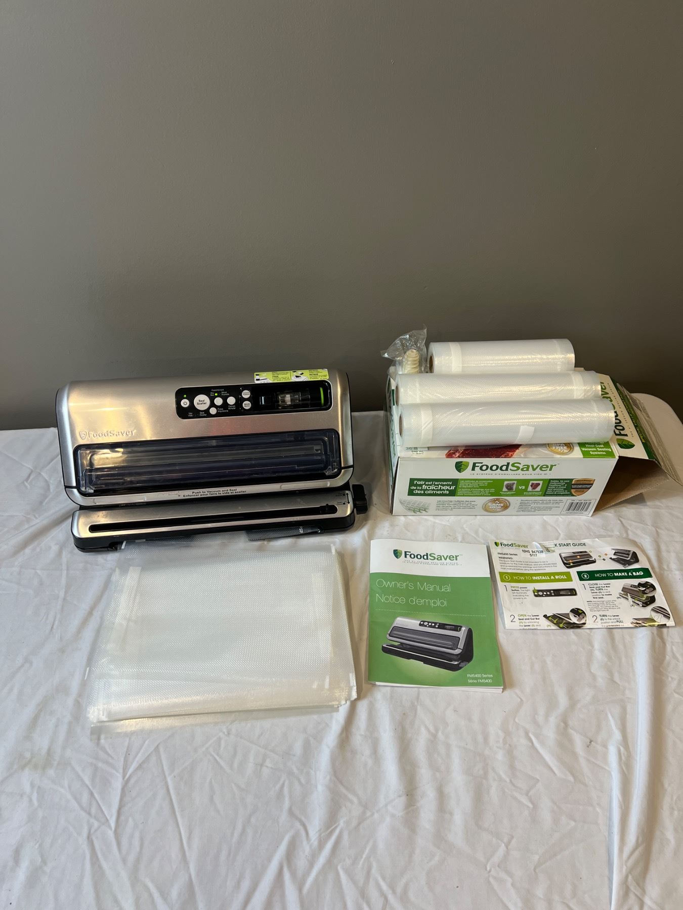 Includes spare vacuum seal bags as well as three rolls of Heat-Seal. Powers on