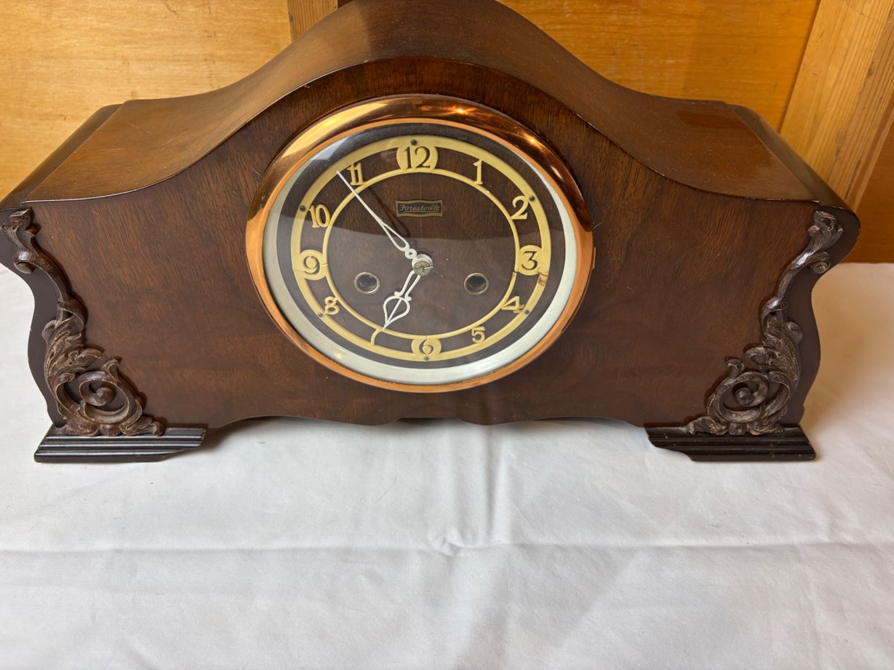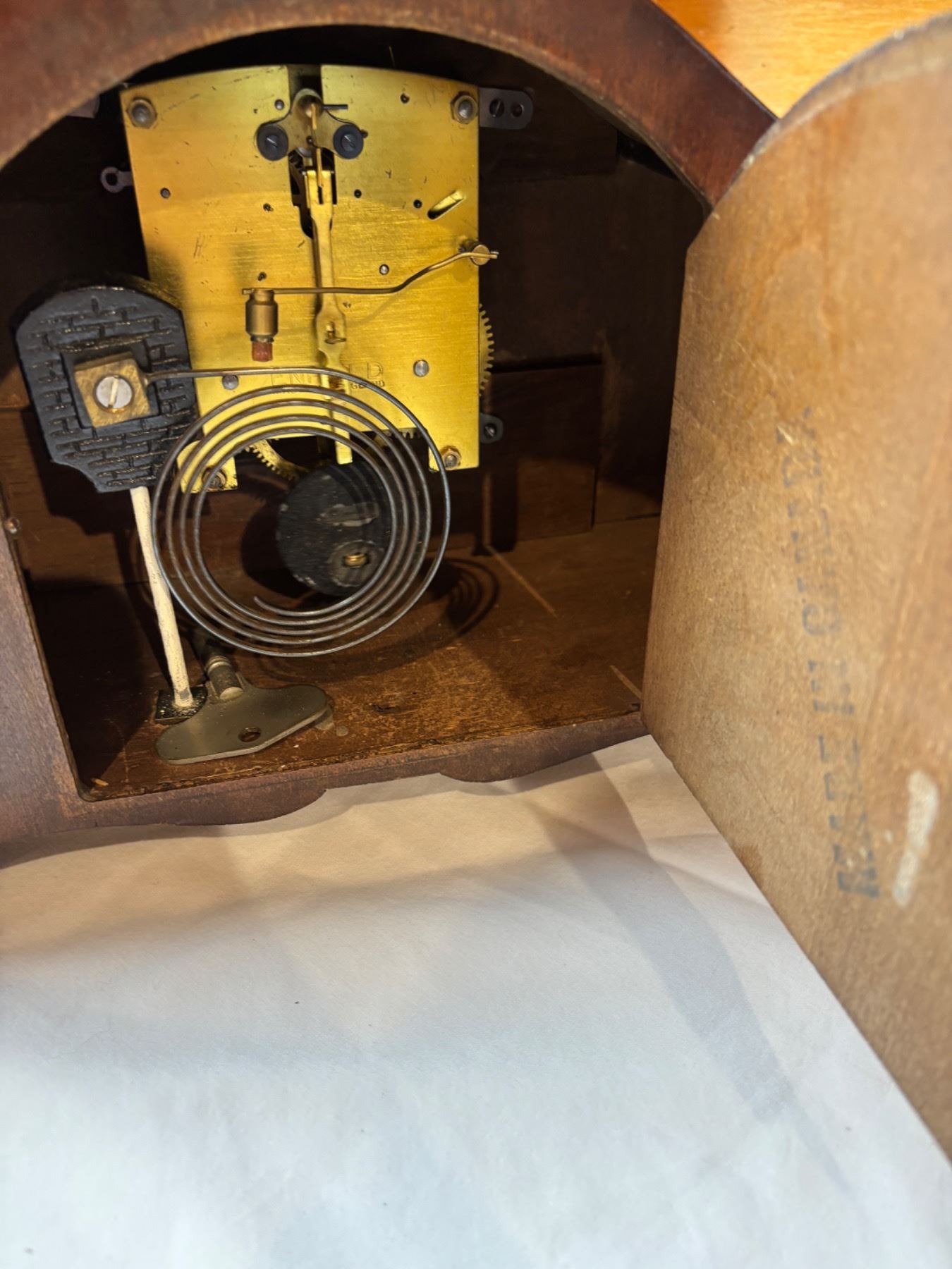 No winding key, 19"L x 6"W x 5.5"H, some chips and scuffs