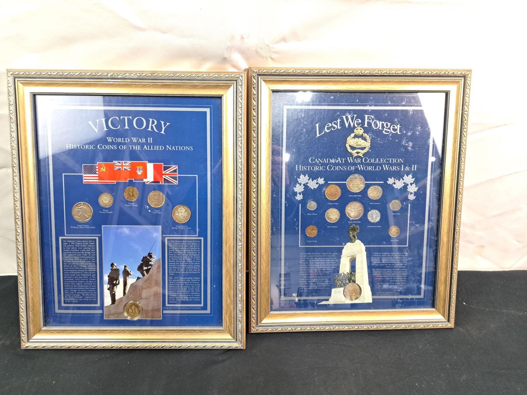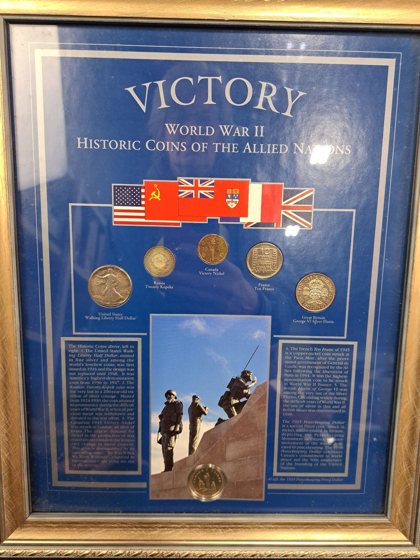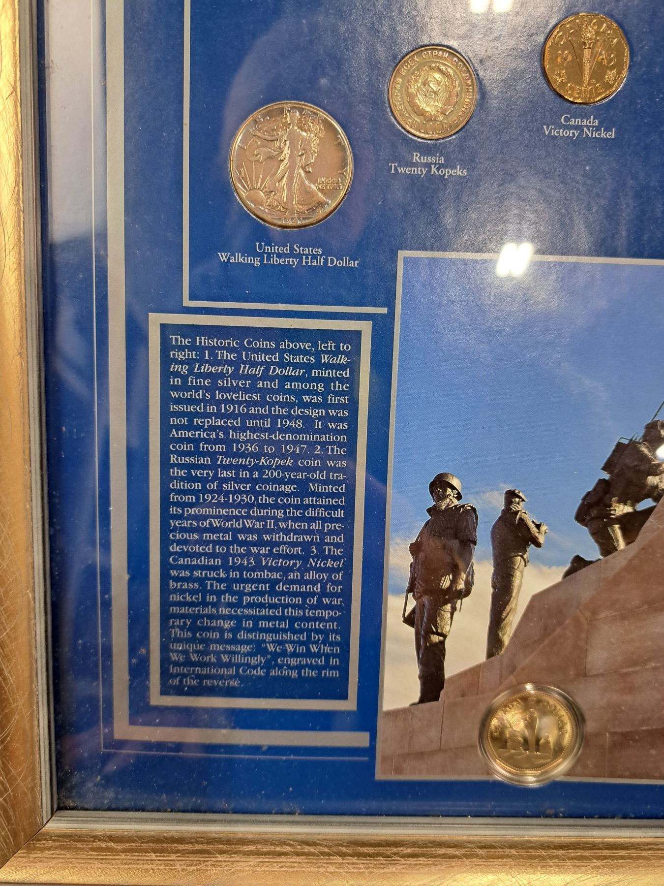 Includes, "Lest We Forget", "Victory WWII Historic Coins of the Allied Nations", inside of glass needs cleaning