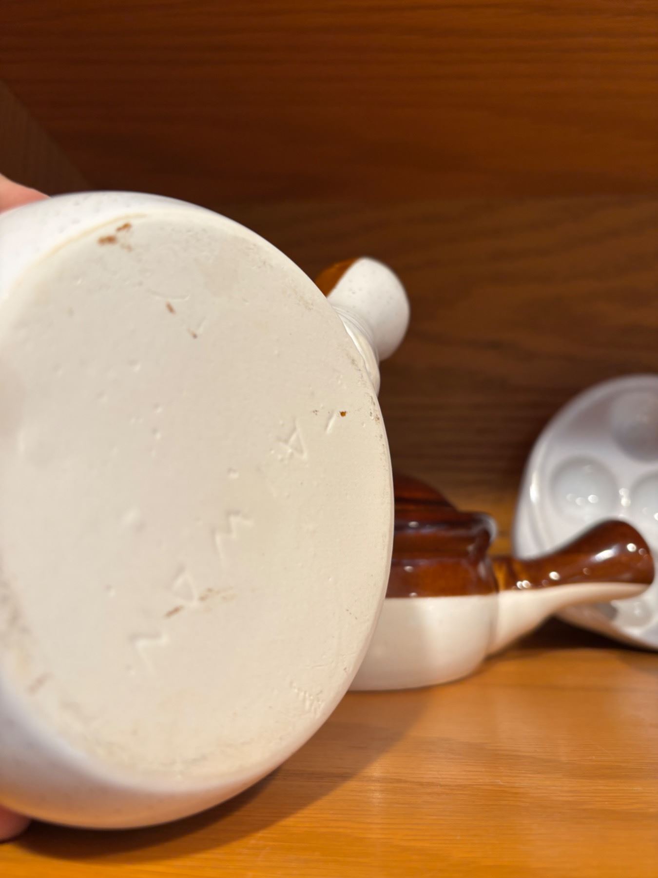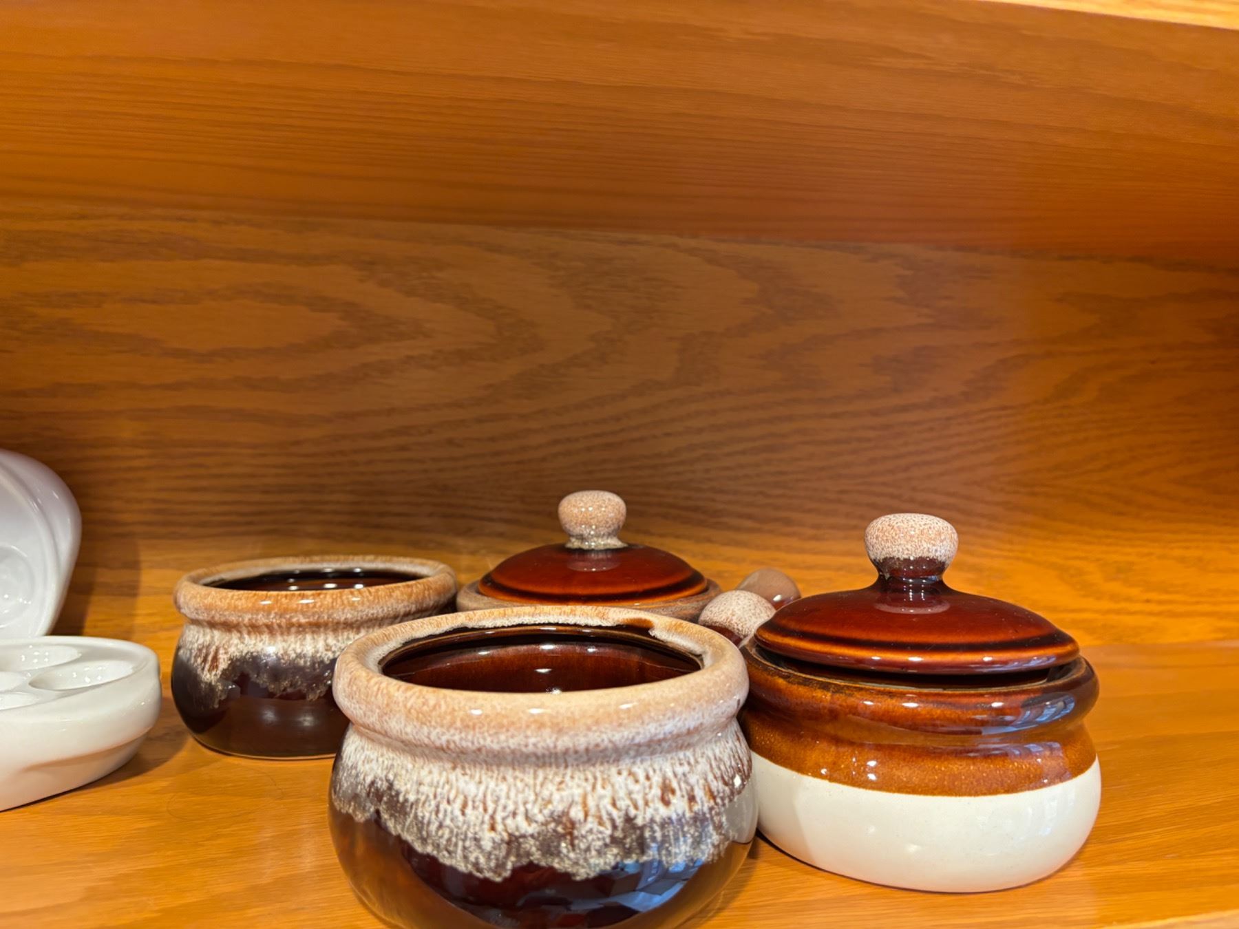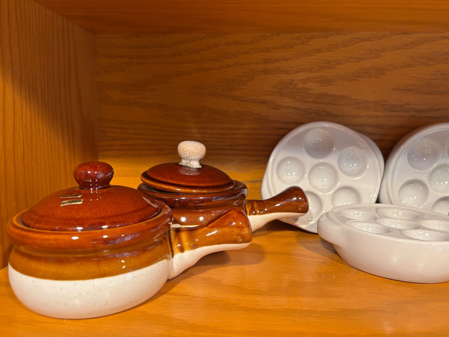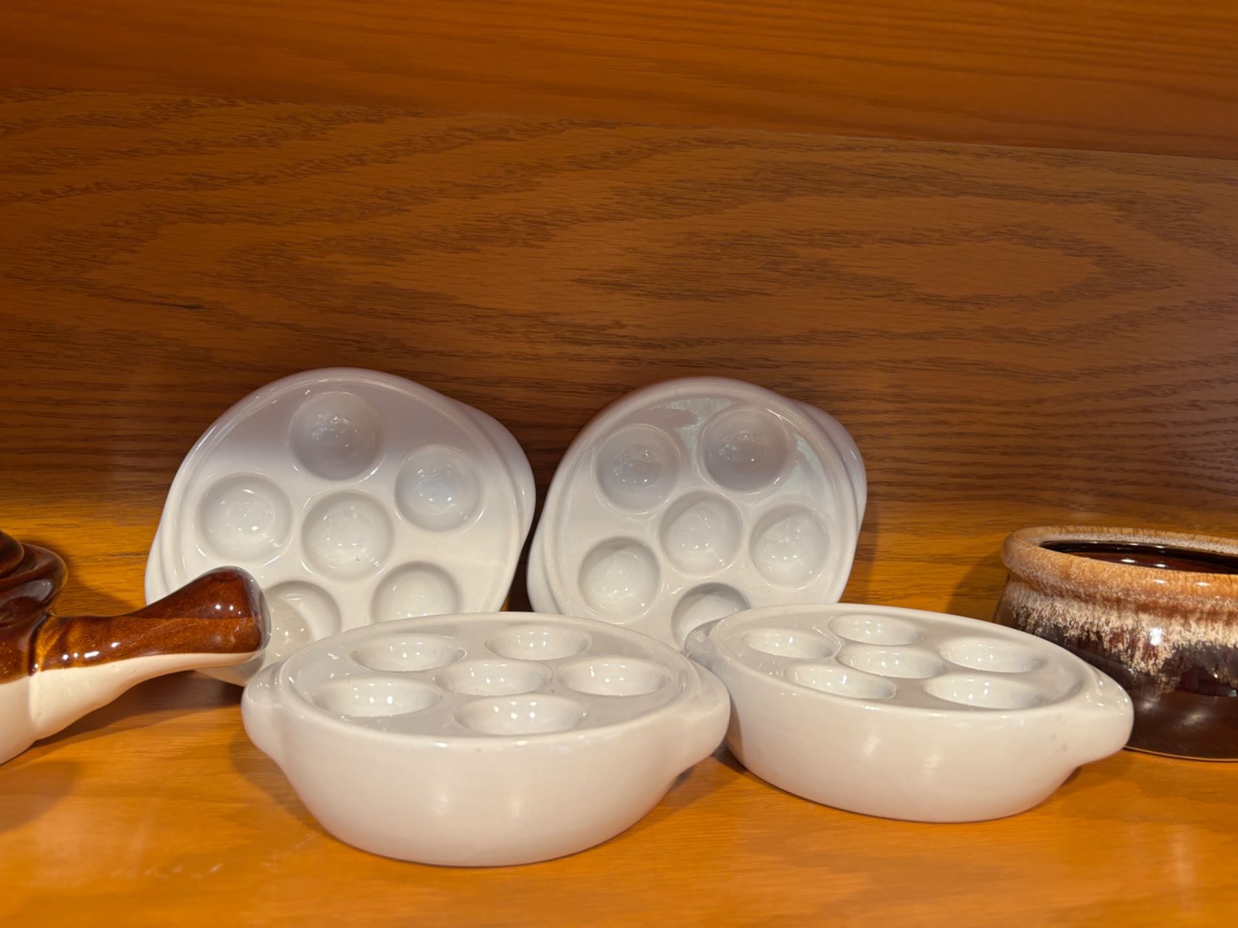 Some of the French Onion soup bowls include lids, Escargot dishes are by Gryphonware