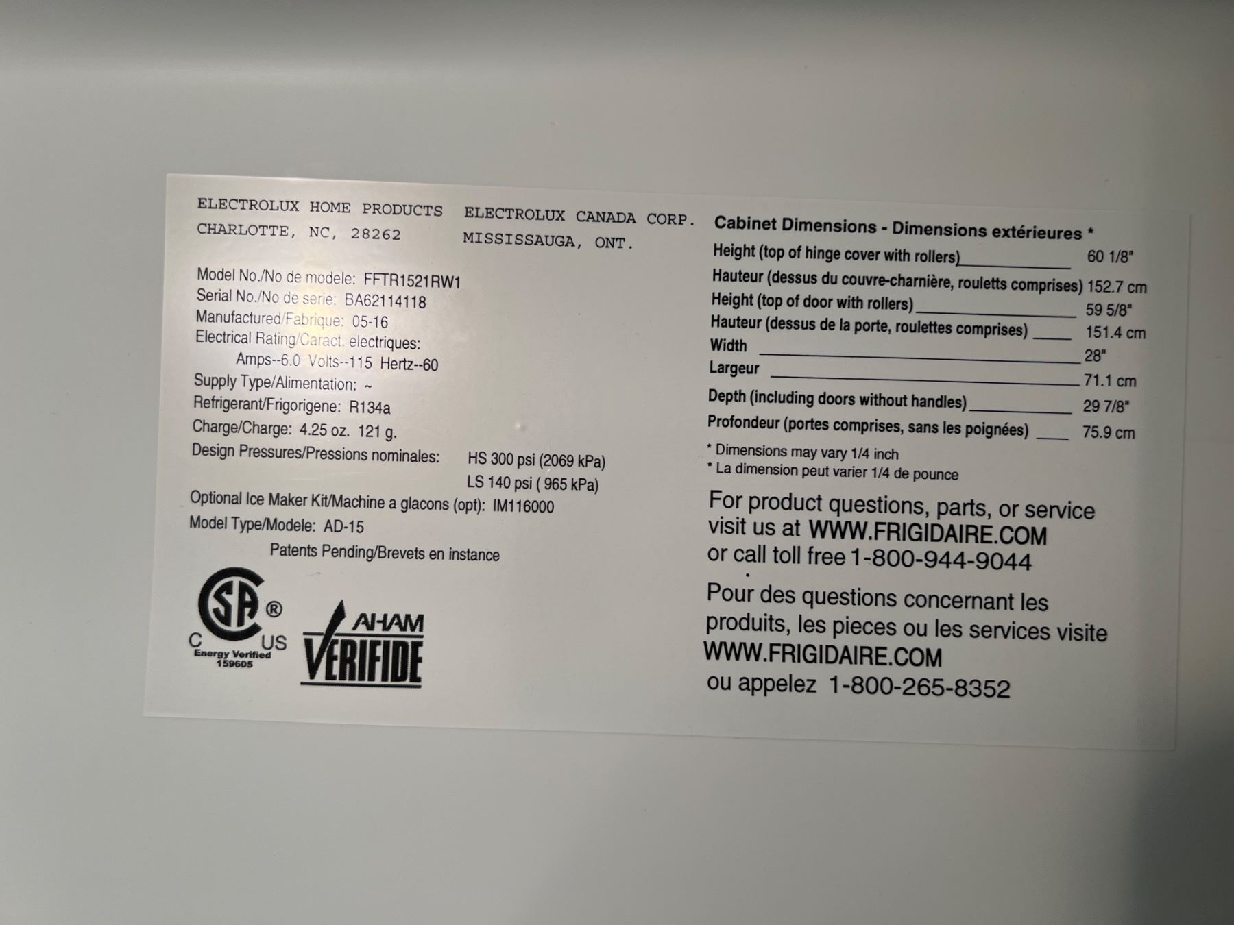 In working condition, Model No. FFTR1521RW1, 28.5"L x 30"D x 60.5"H