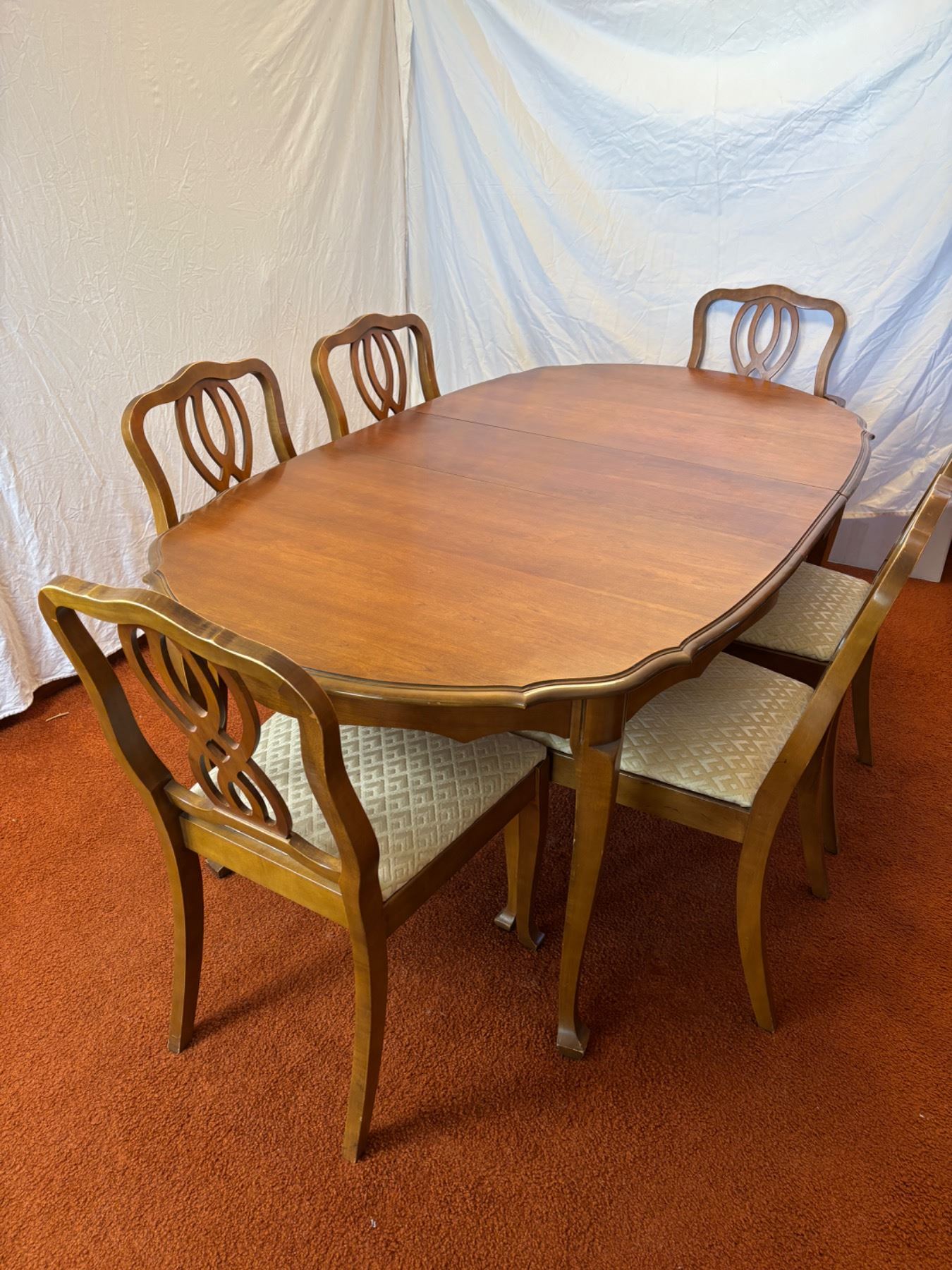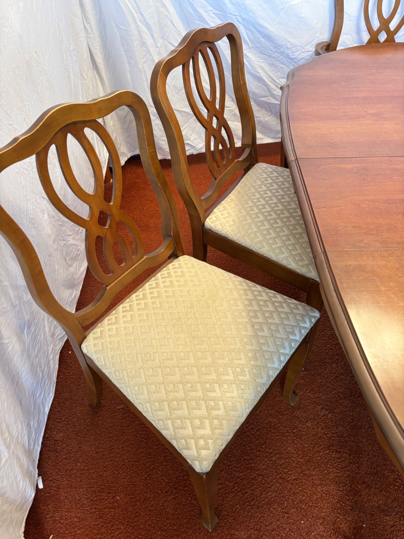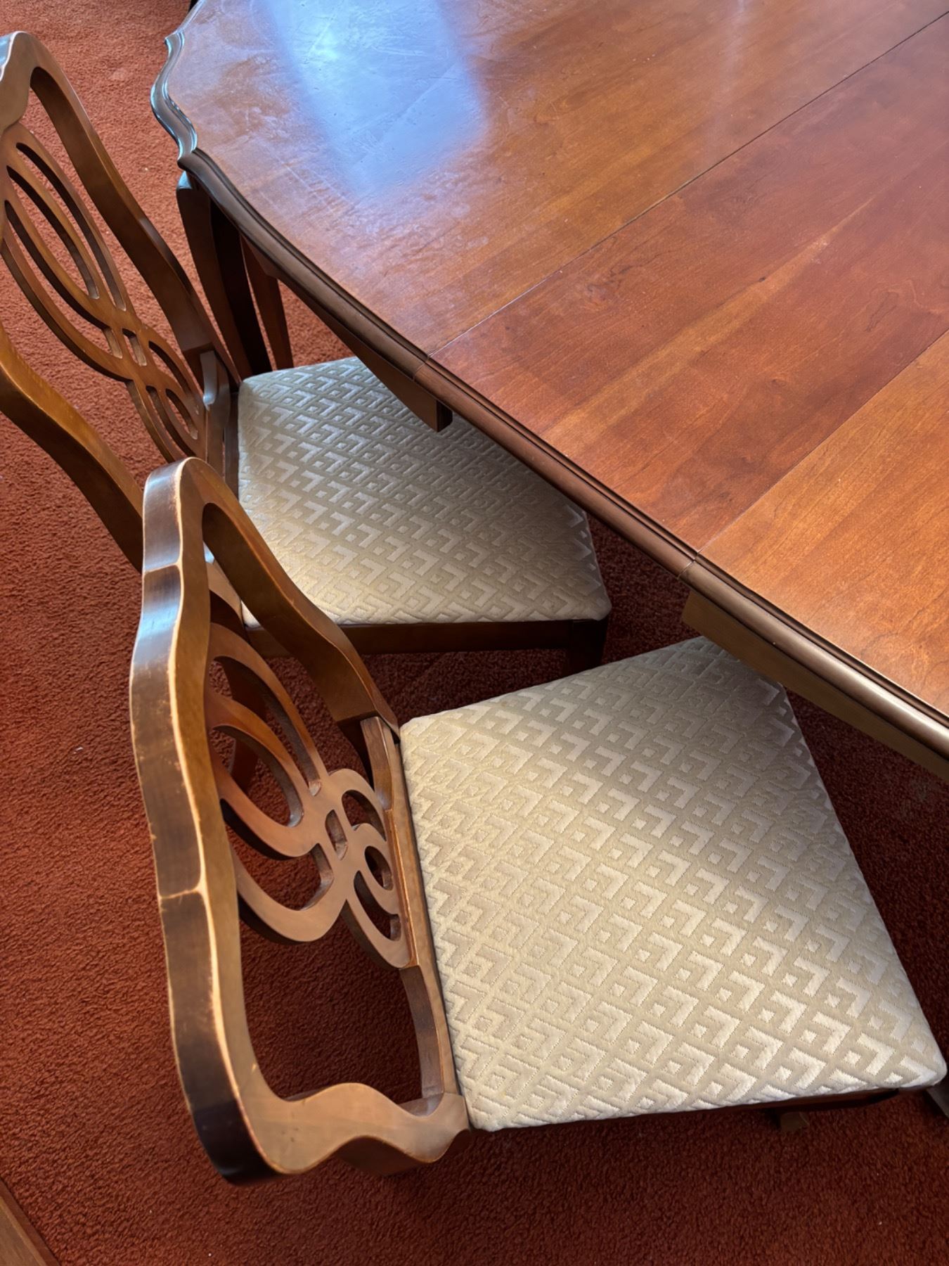 Includes two leafs (12"W each), Table measures 58.5"L x 39"W x 29"H without leafs, Chairs are 35"H seat height 18"H,