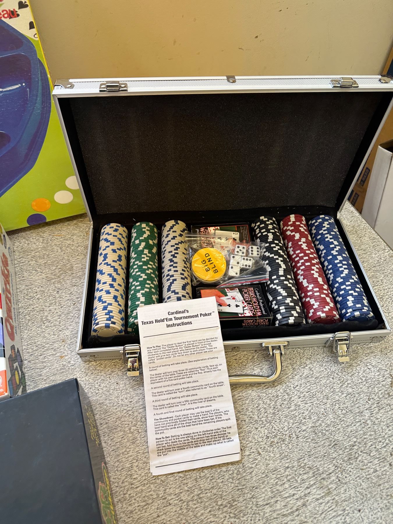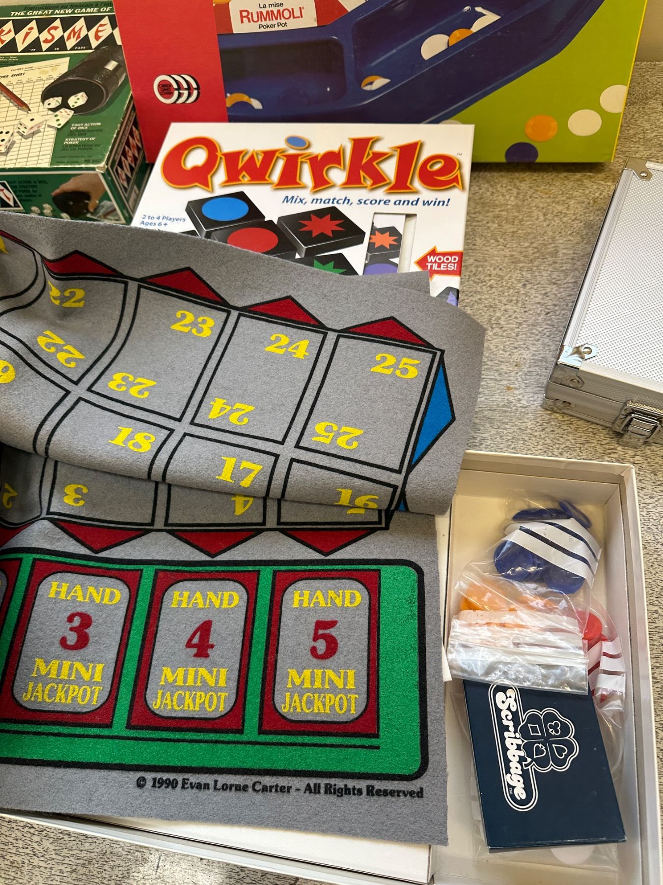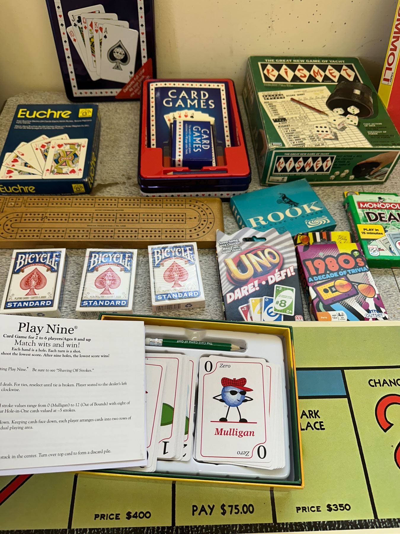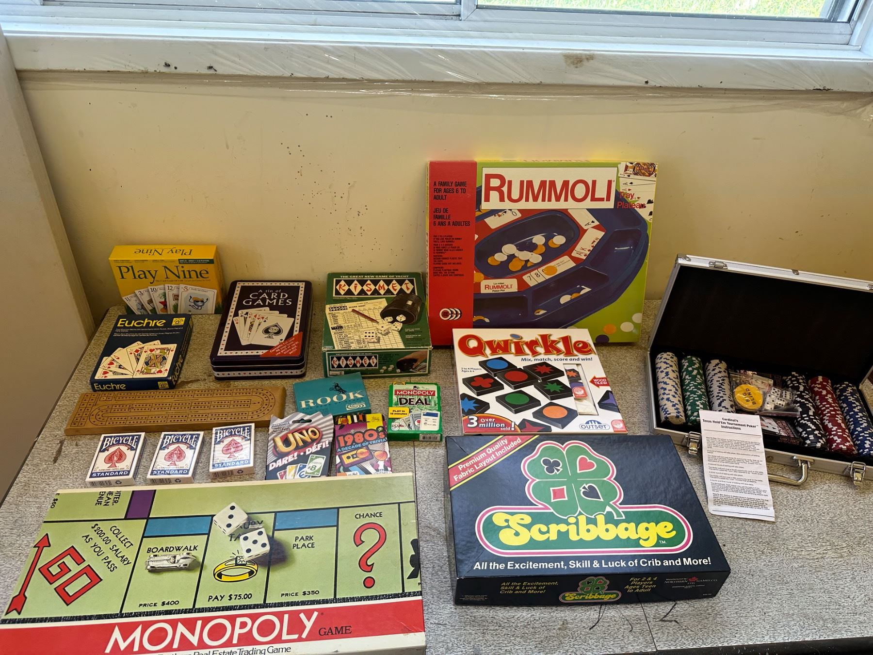 Includes brand new decks of cards, new poker set, monopoly, Qwirkle, Rummoli, Kismet, Uno, Rook, etc