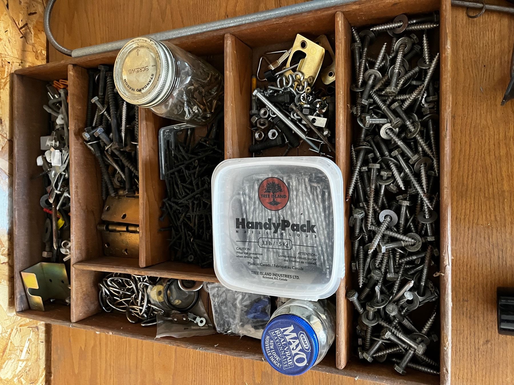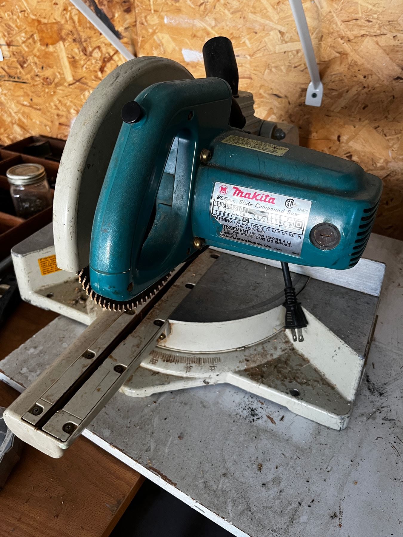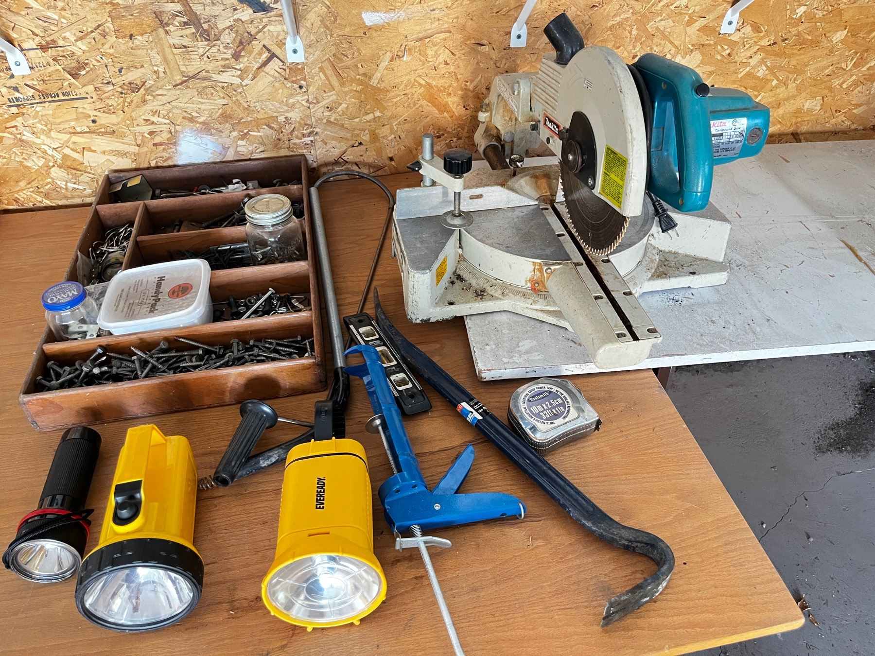 Assortment of flashlights, tools, screws and bolts - including Makita Slide Compound Saw 10" - works