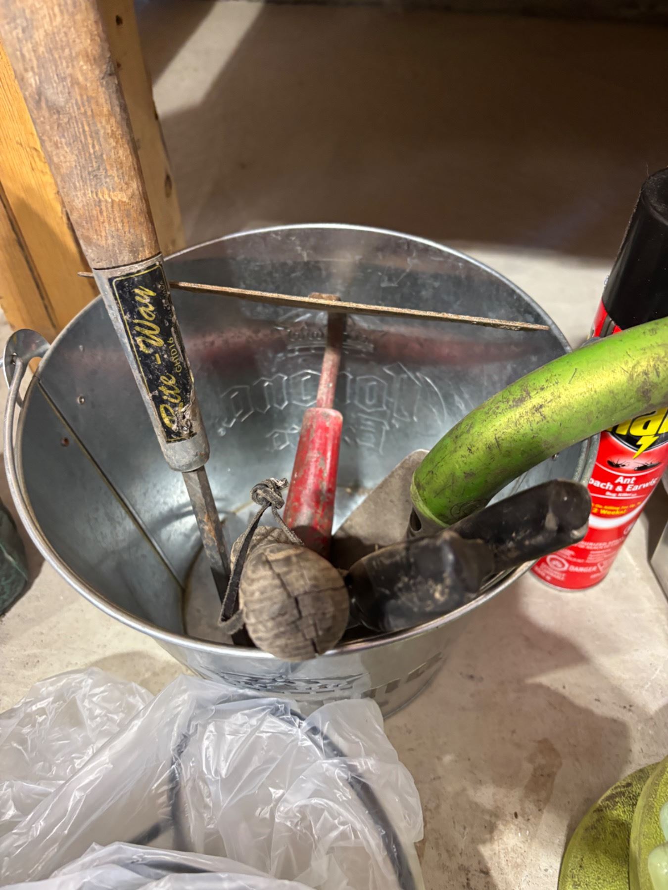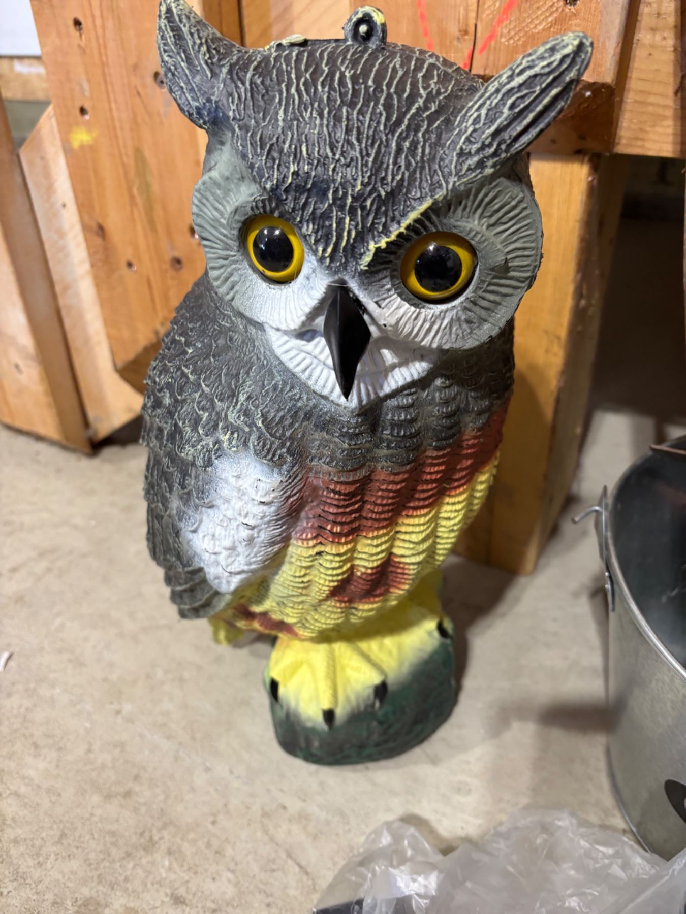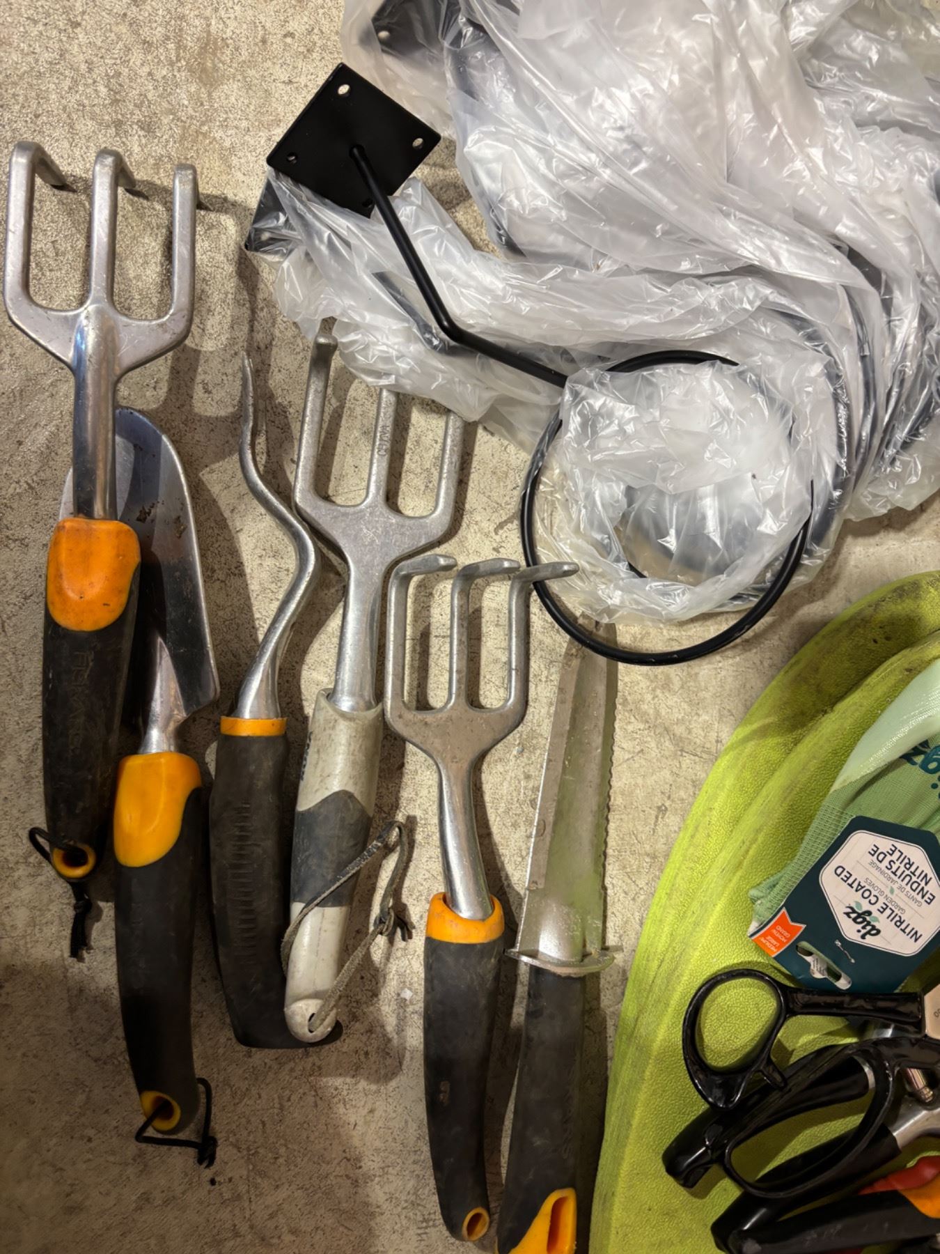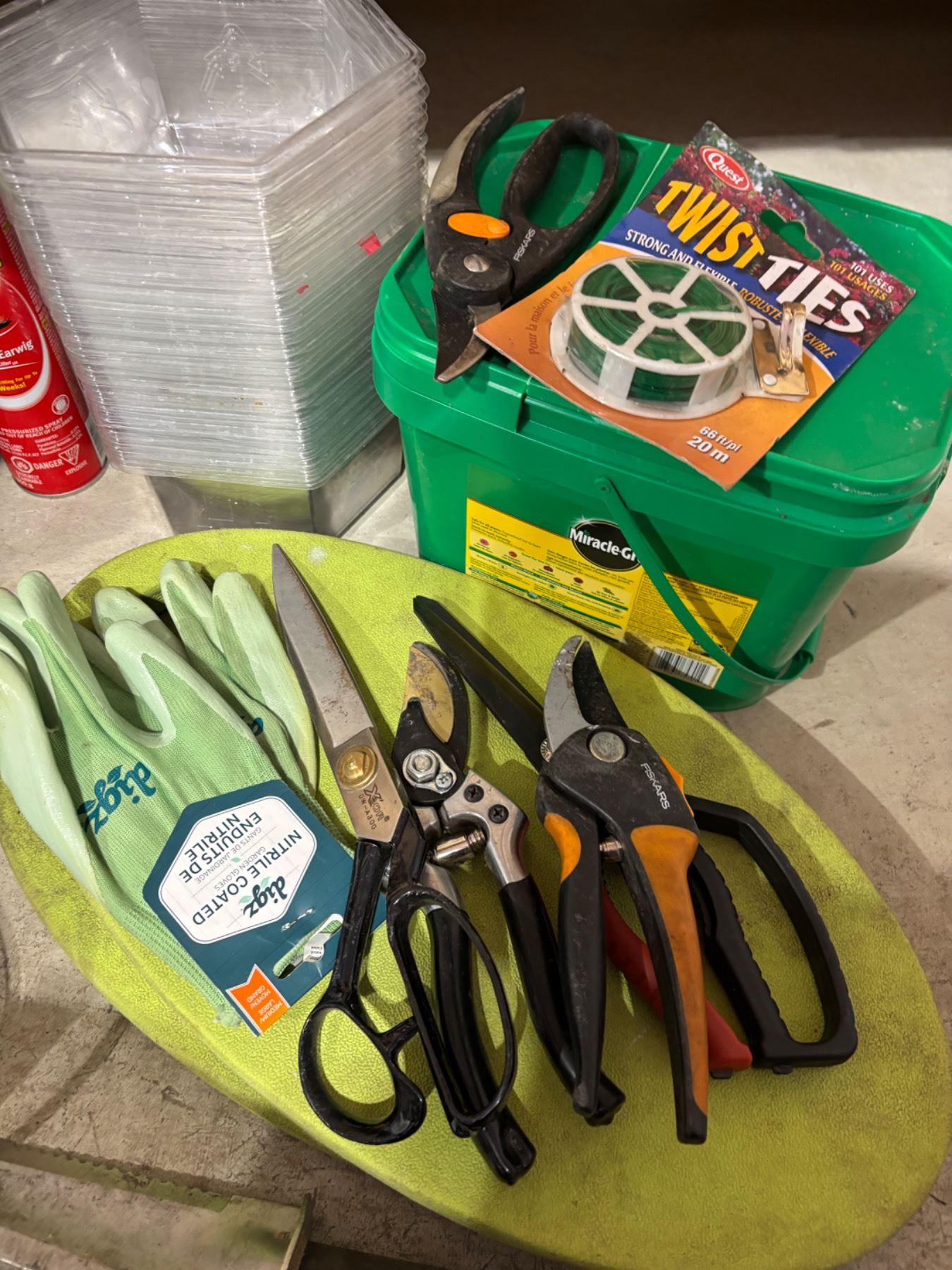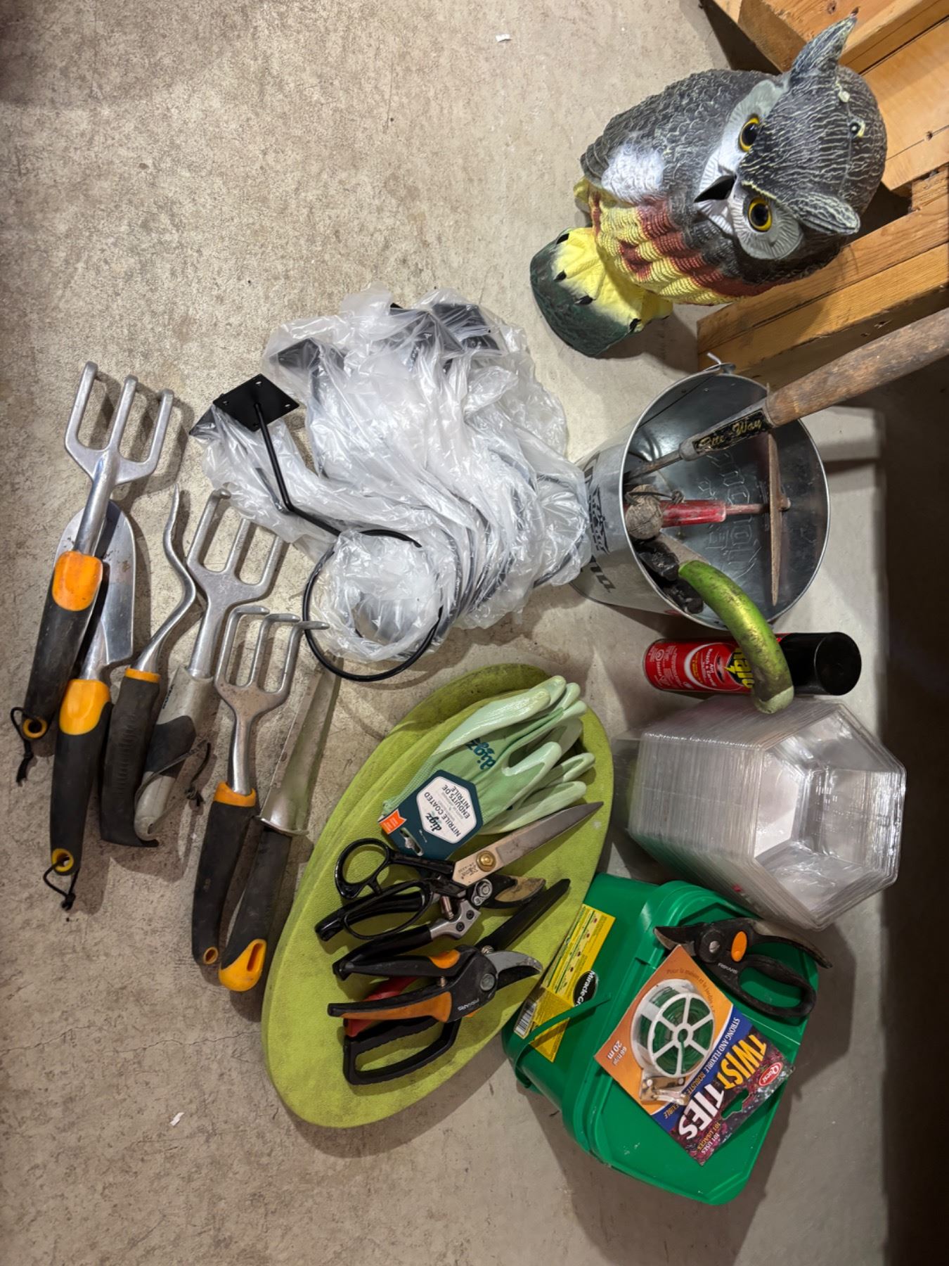 Includes a decorative plastic owl, various gardening hand tools like Fiskars, Miracle Grow, and more