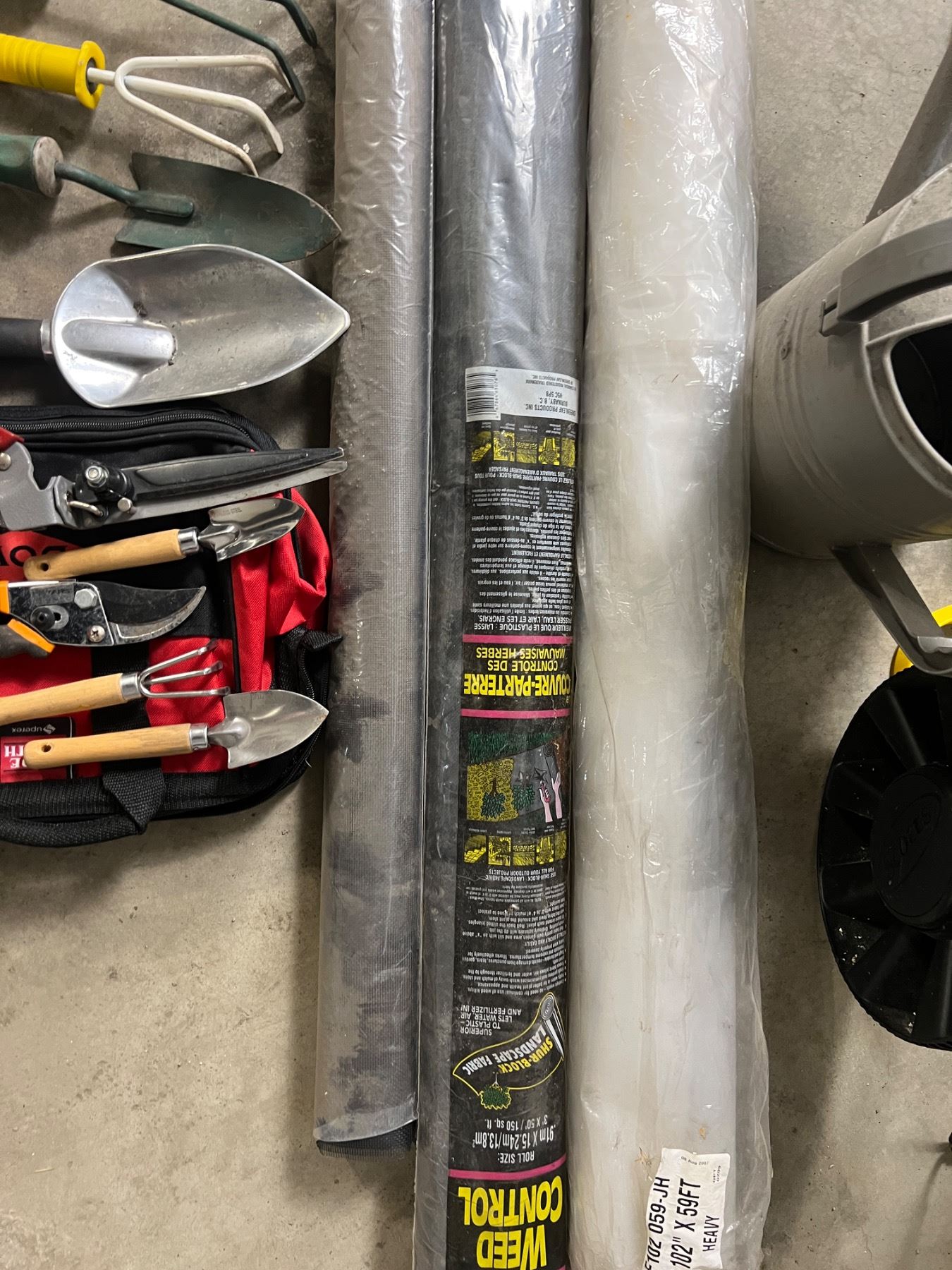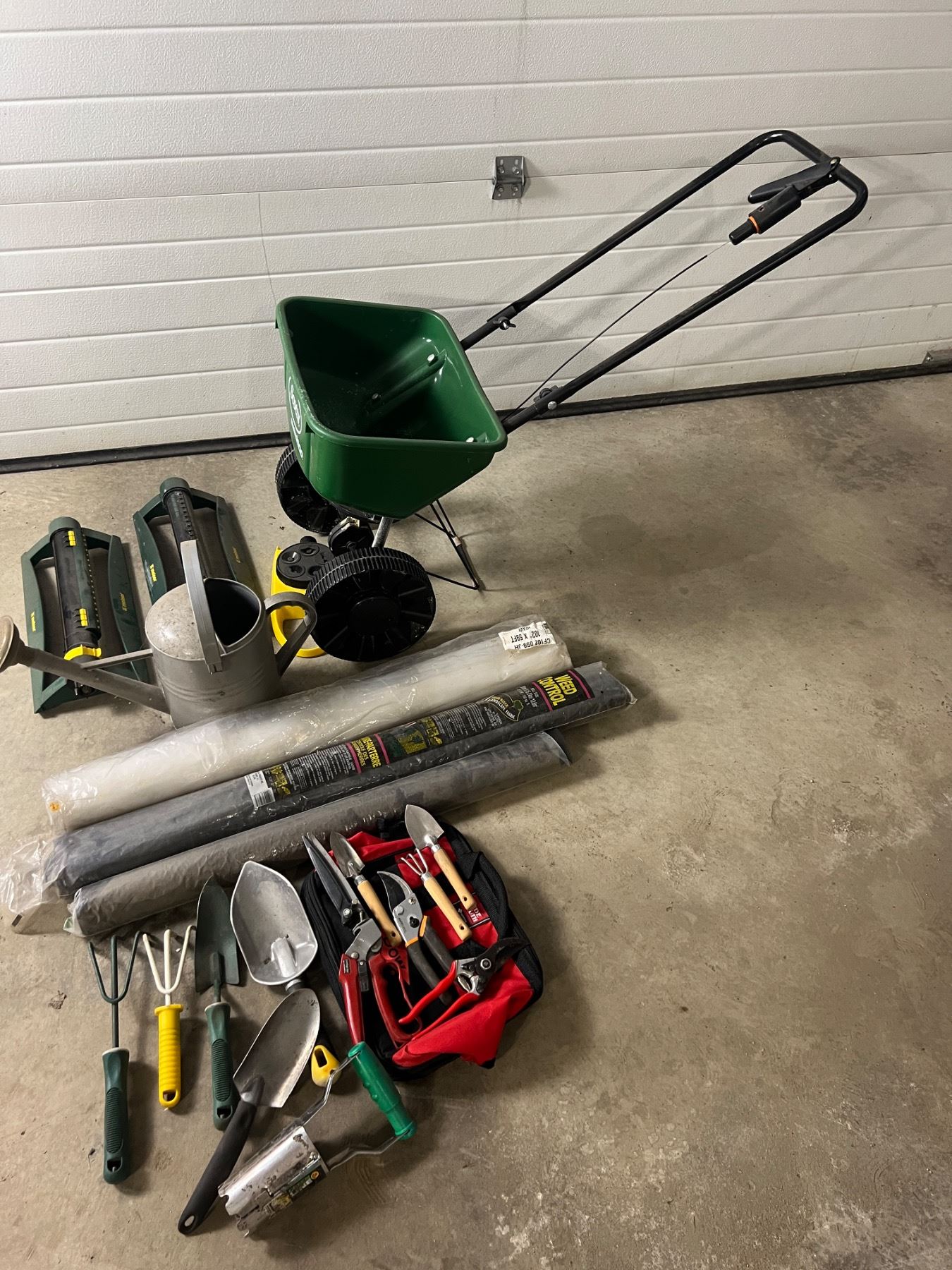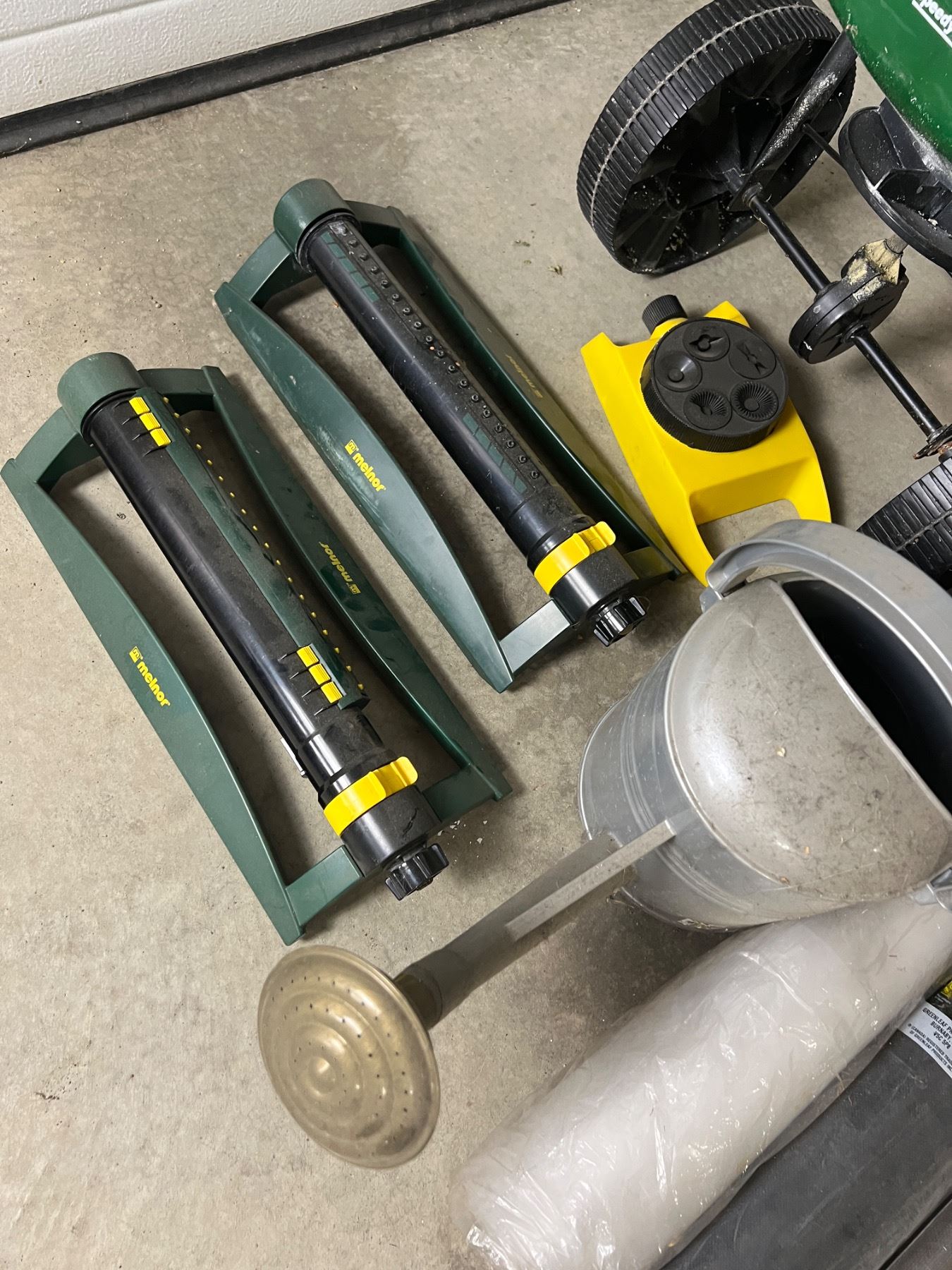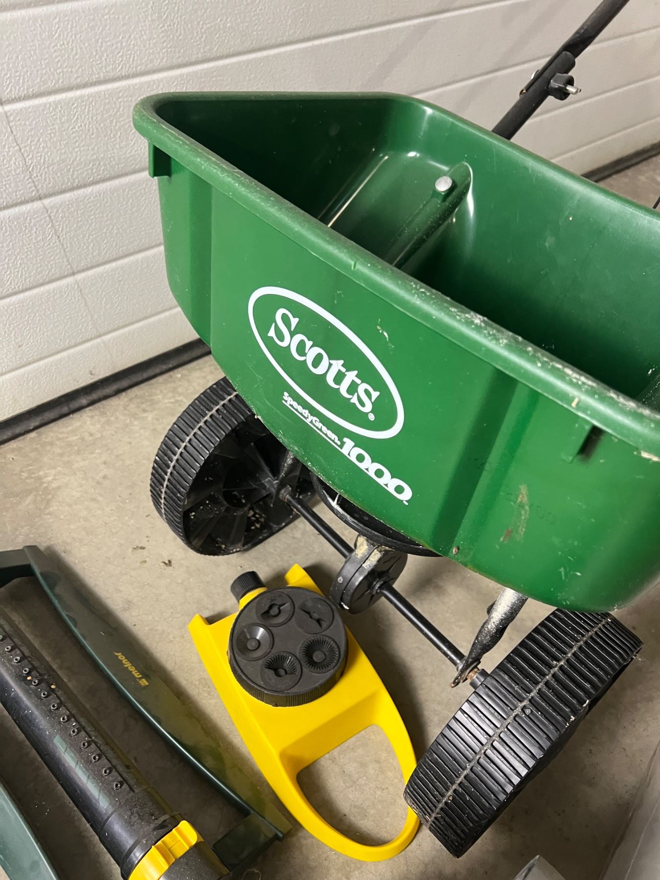 Includes a Scotts 1000 seed spreader, Melnor sprinklers, and tools, and more