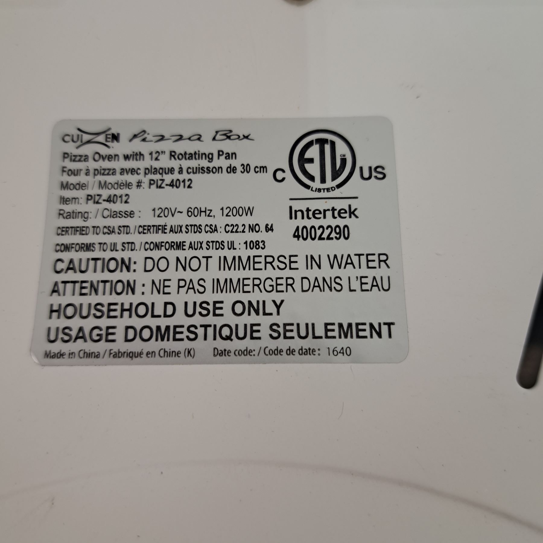 Pizza Box Oven Model # P1Z-4012