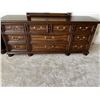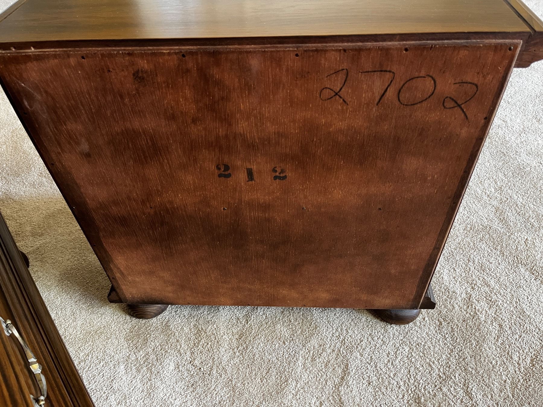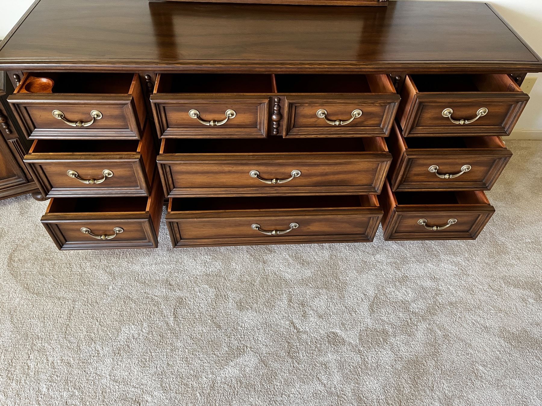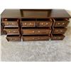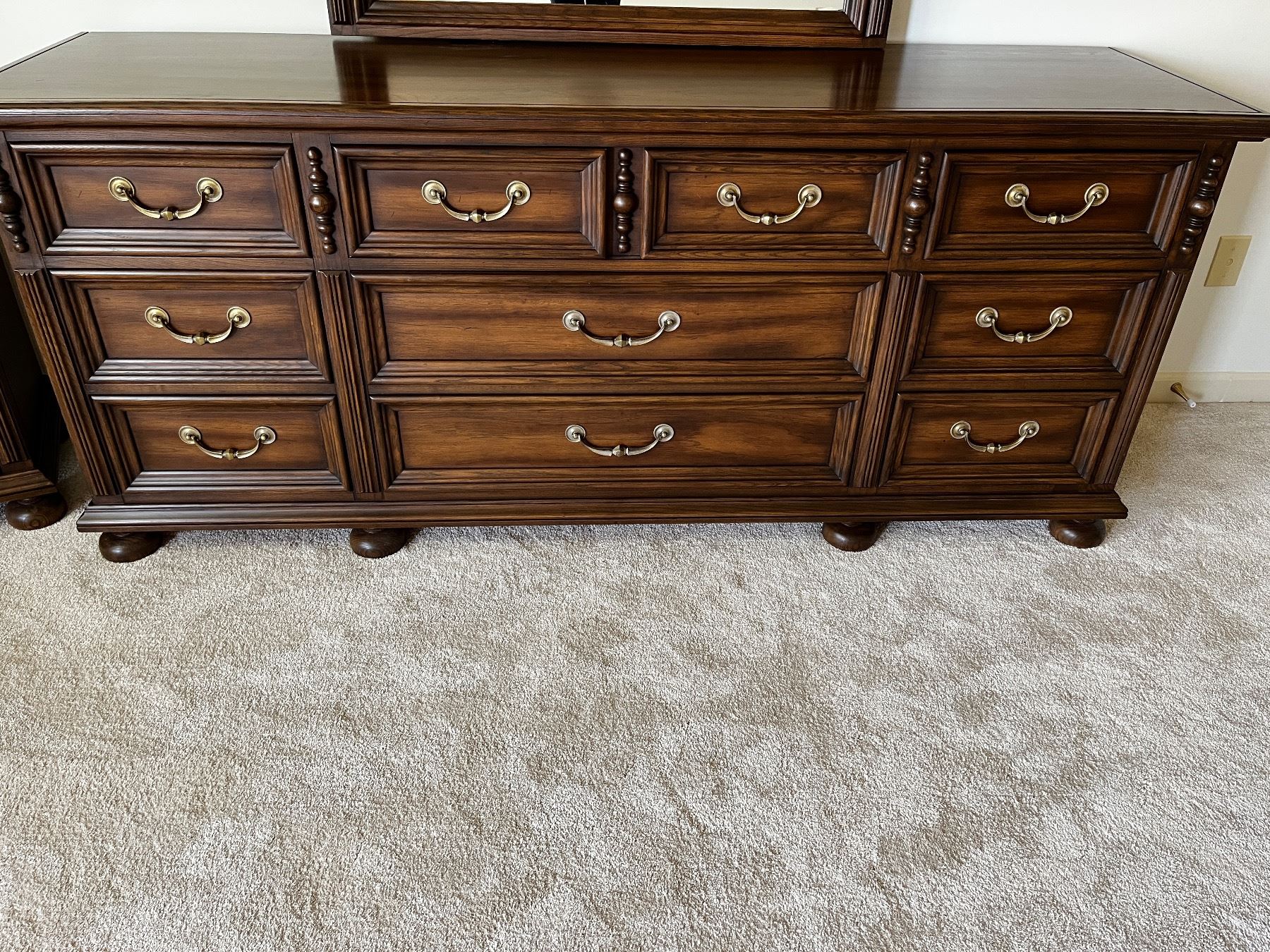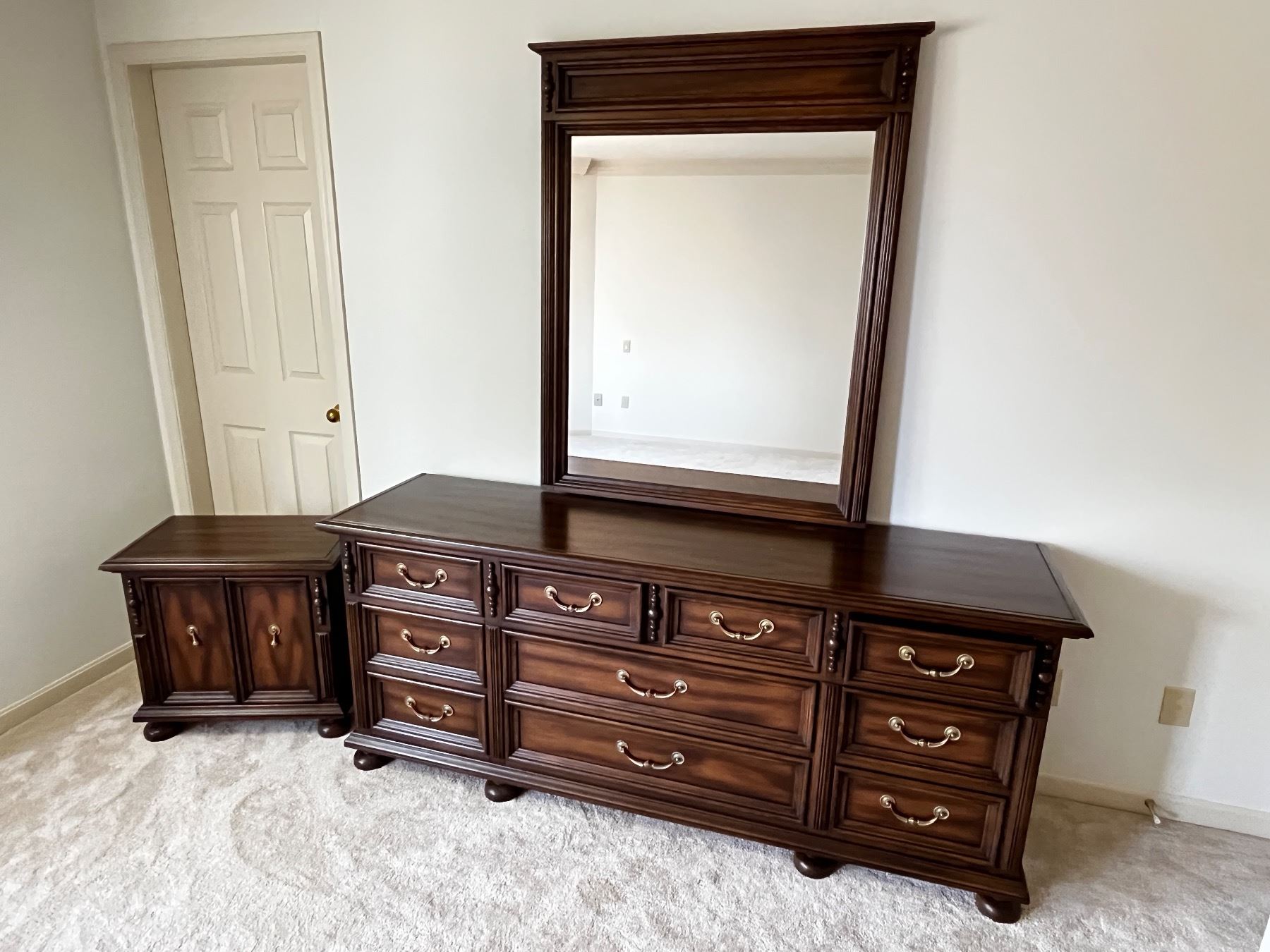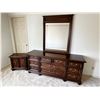 Includes dresser with mirror and end table - 9 Drawer Dresser 74" long x 20.5" wide x 31" tall - Mirror 38" long x 49" tall - End Table 26" long x 16" deep x 2' tall
