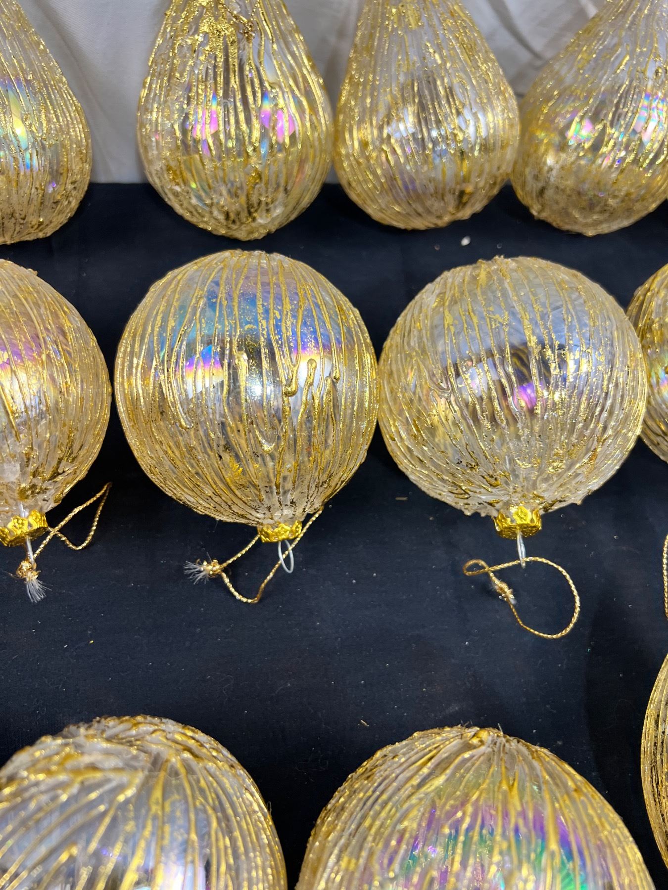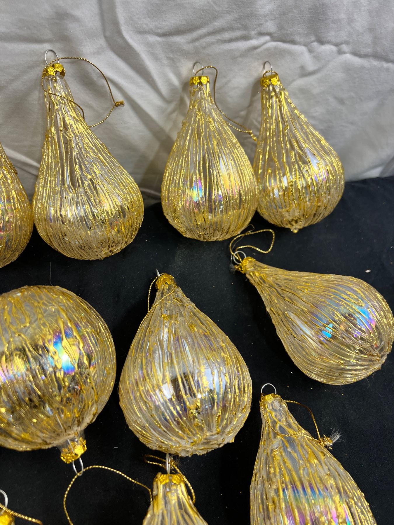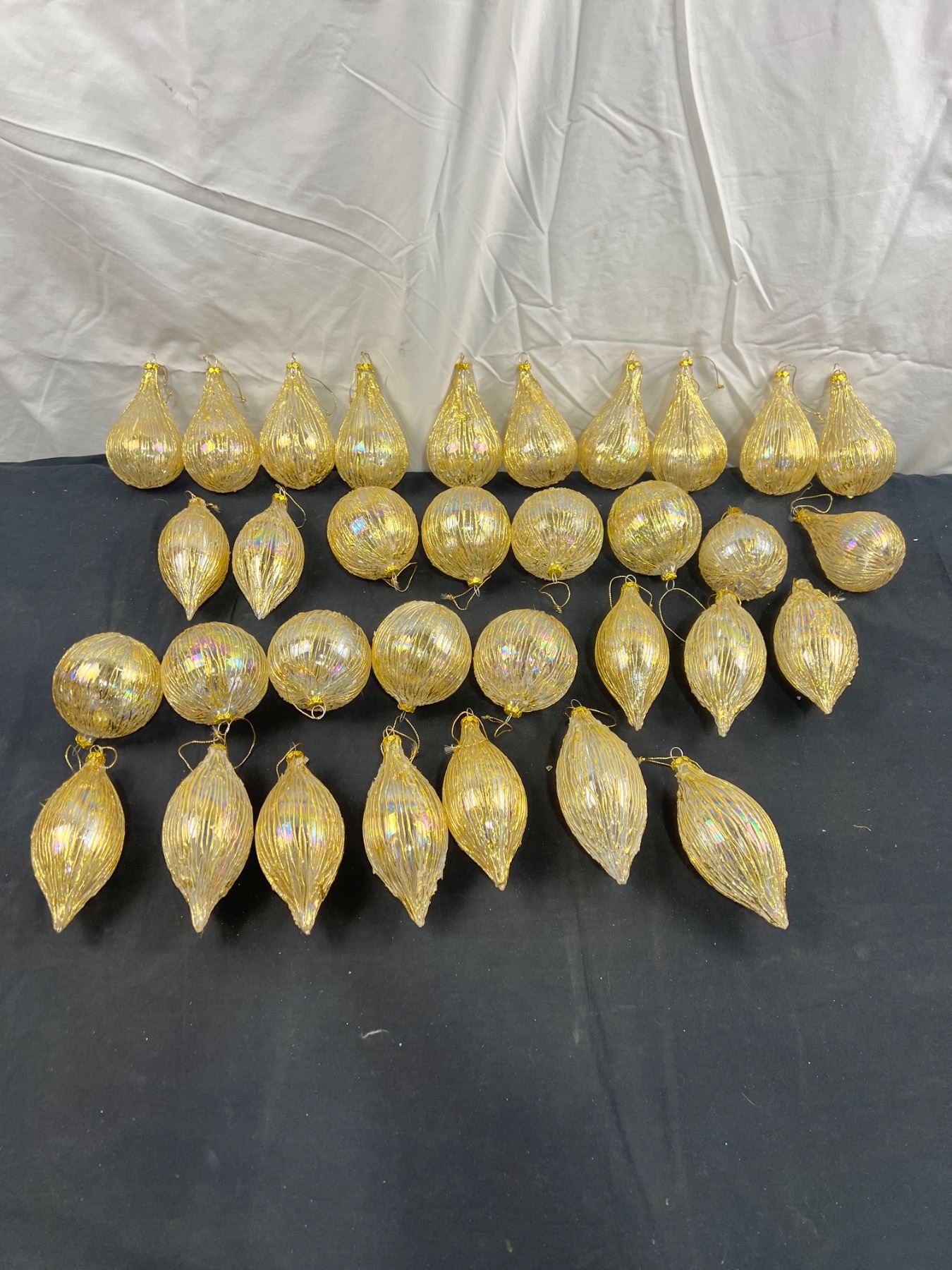 Gold ornaments with gold accents. 3 different shapes included. Approximately 3.5" long for pear shaped, teardrop shaped are 4.5". 33 pieces total. Gold accents have started to wear on some of the ornaments.