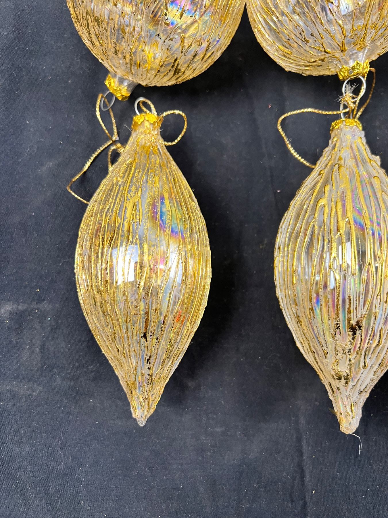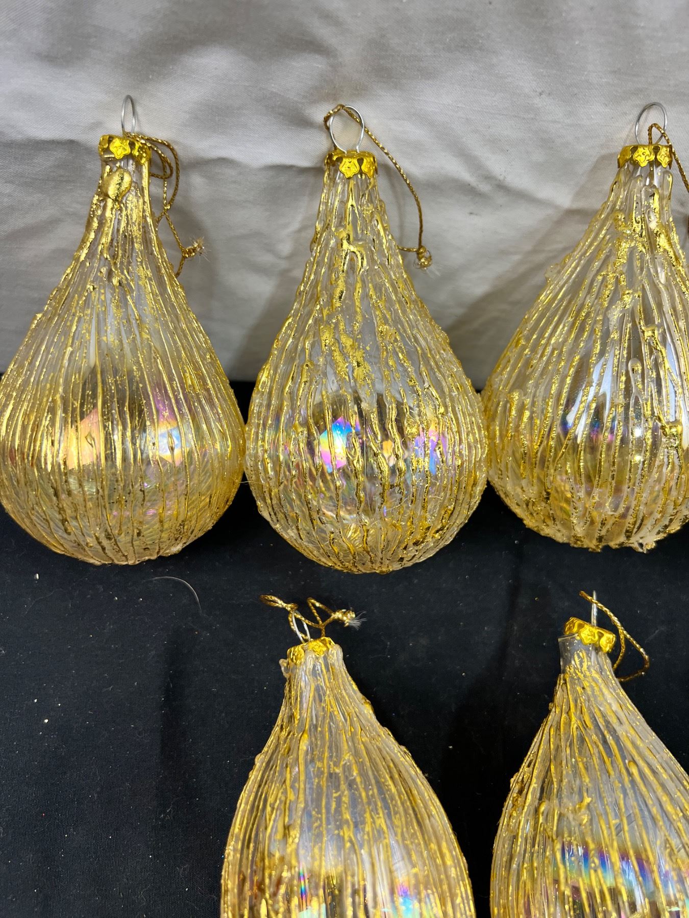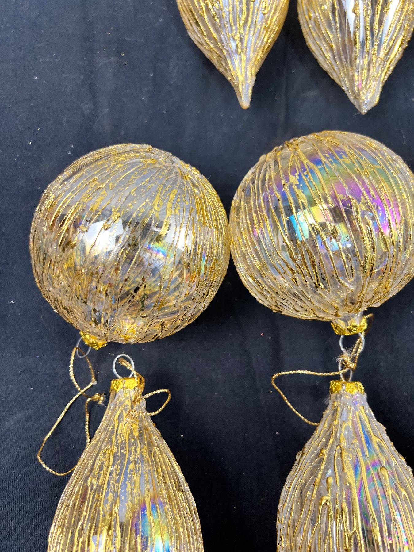 Gold ornaments with gold accents. 3 different shapes included. Approximately 3.5" long for pear shaped, teardrop shaped are 4.5". 33 pieces total. Gold accents have started to wear on some of the ornaments.