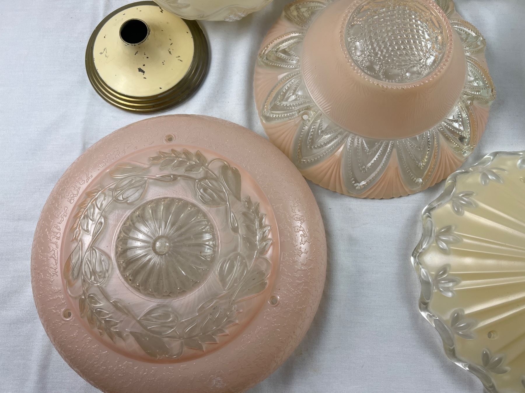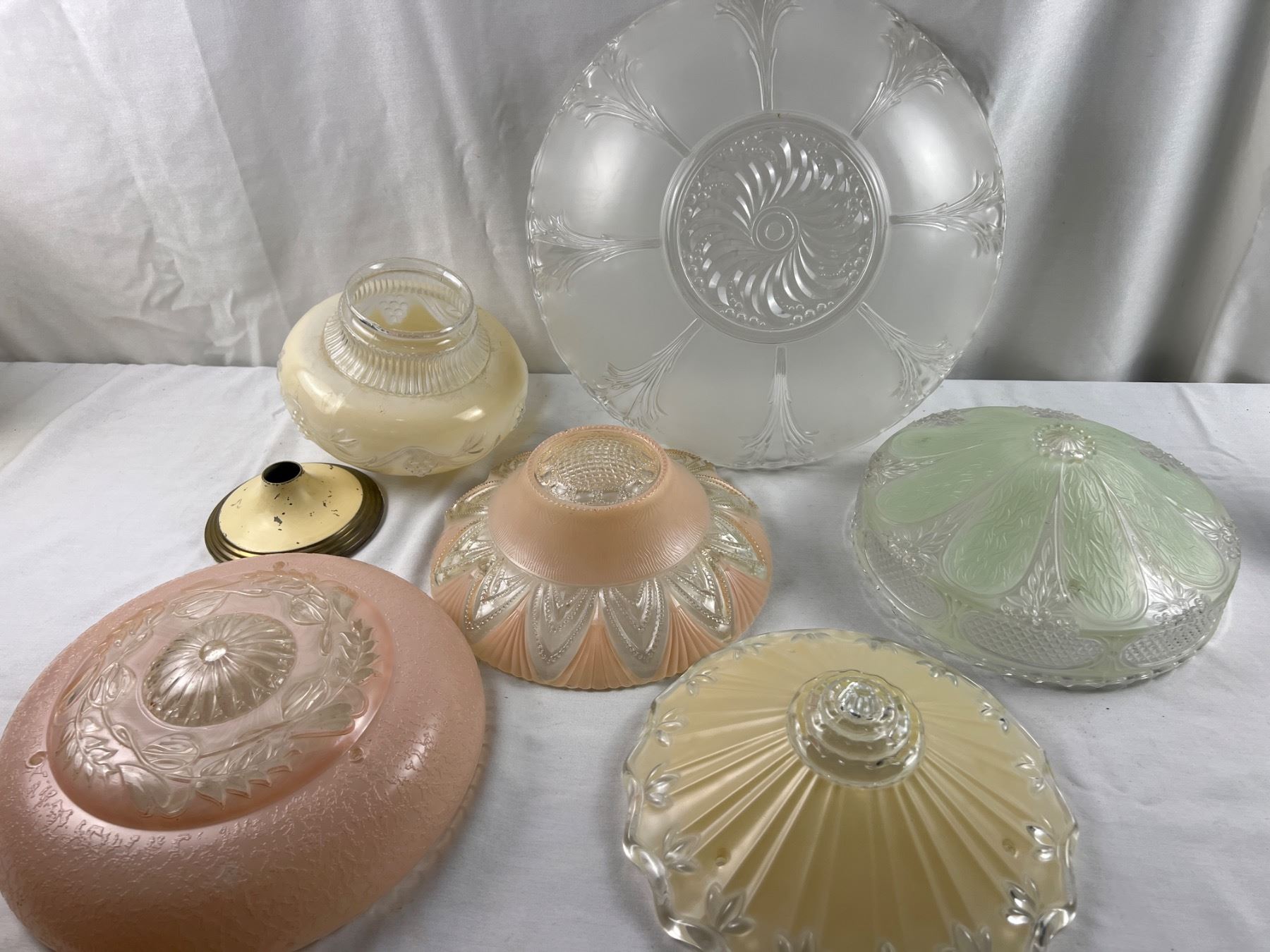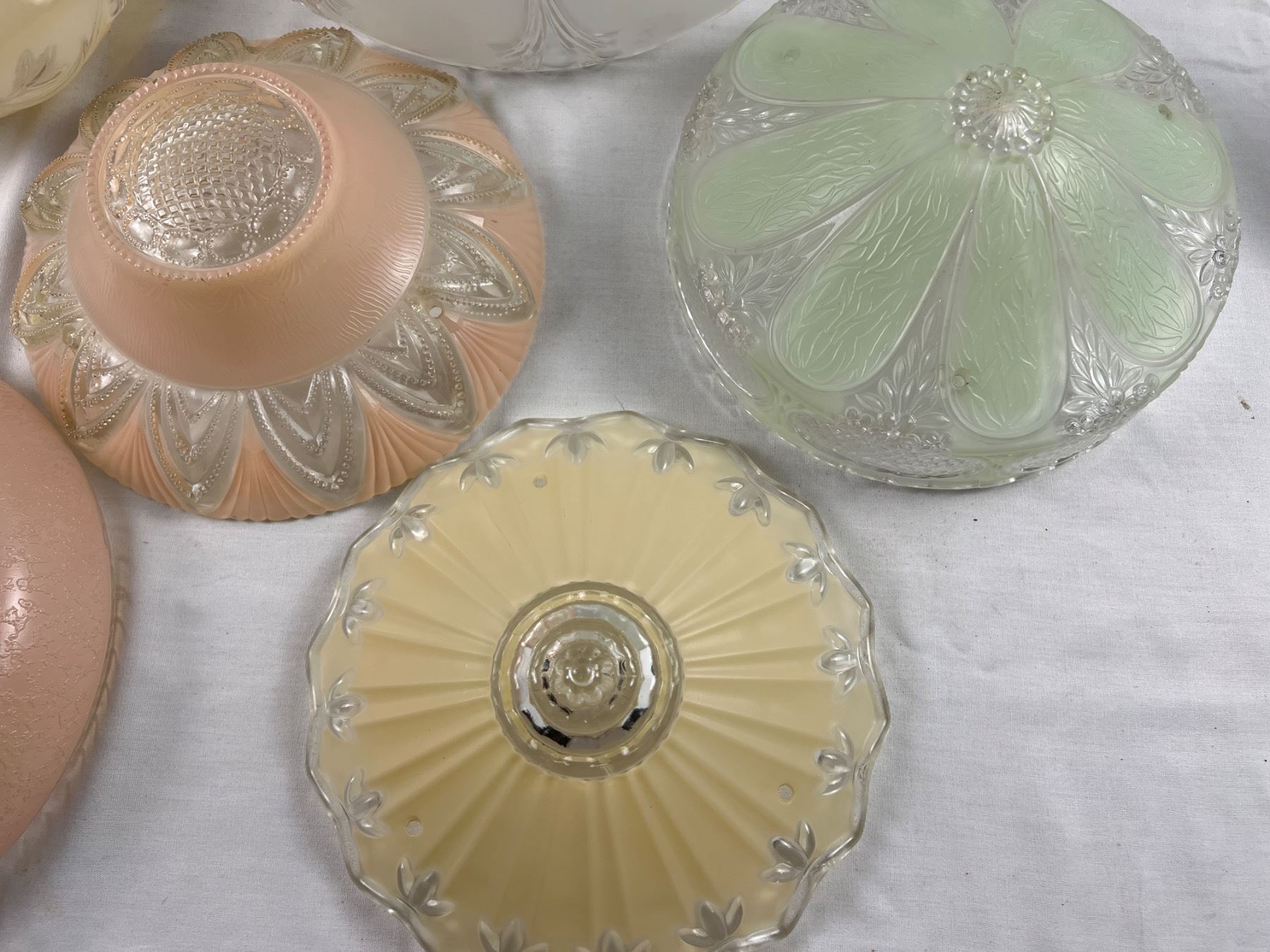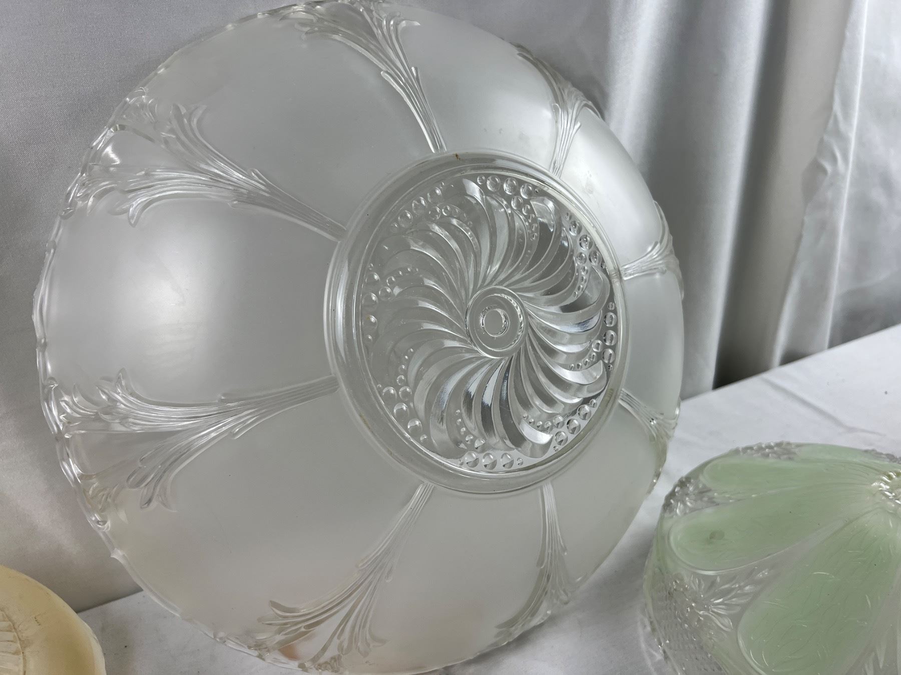 The large clear glass shade is 15"diameter, the green one is 10"diameter