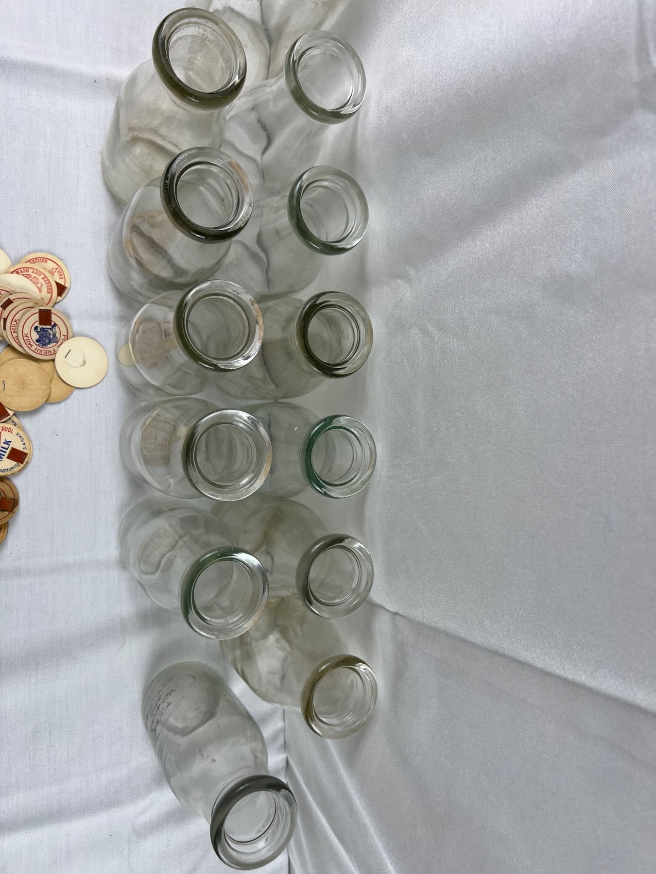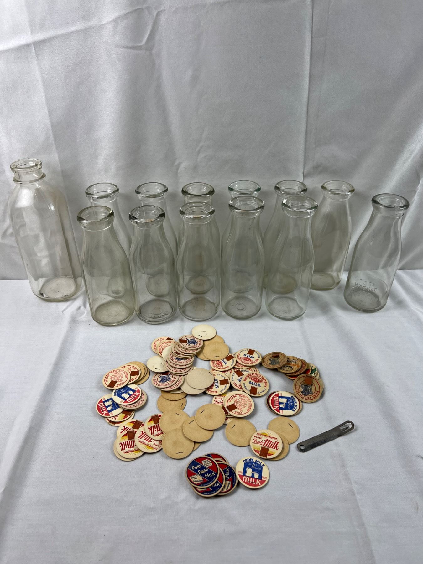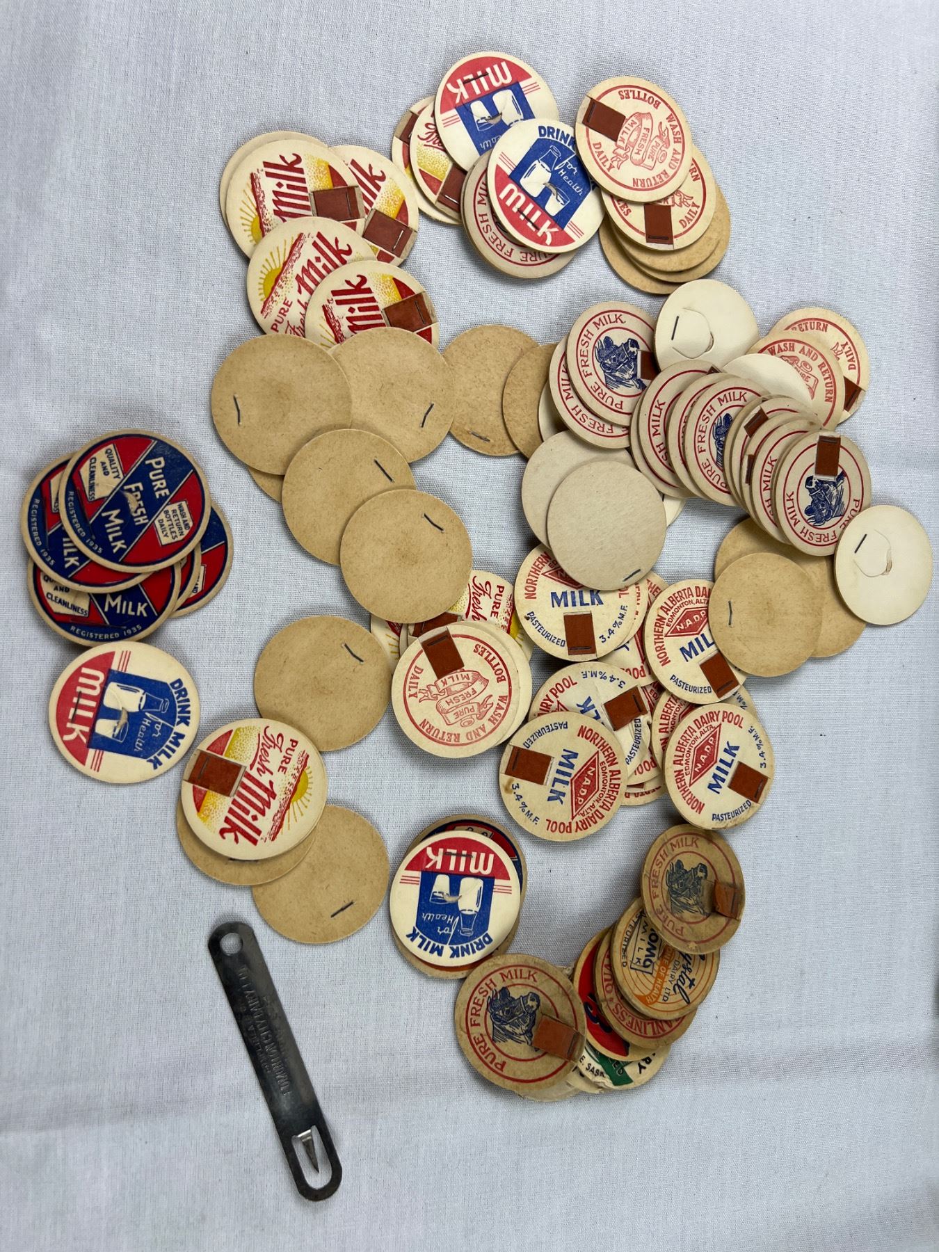 Some stains, The largest bottle is 10.5"H, includes a variety of milk bottle caps and a Edmonton City Dairy opener