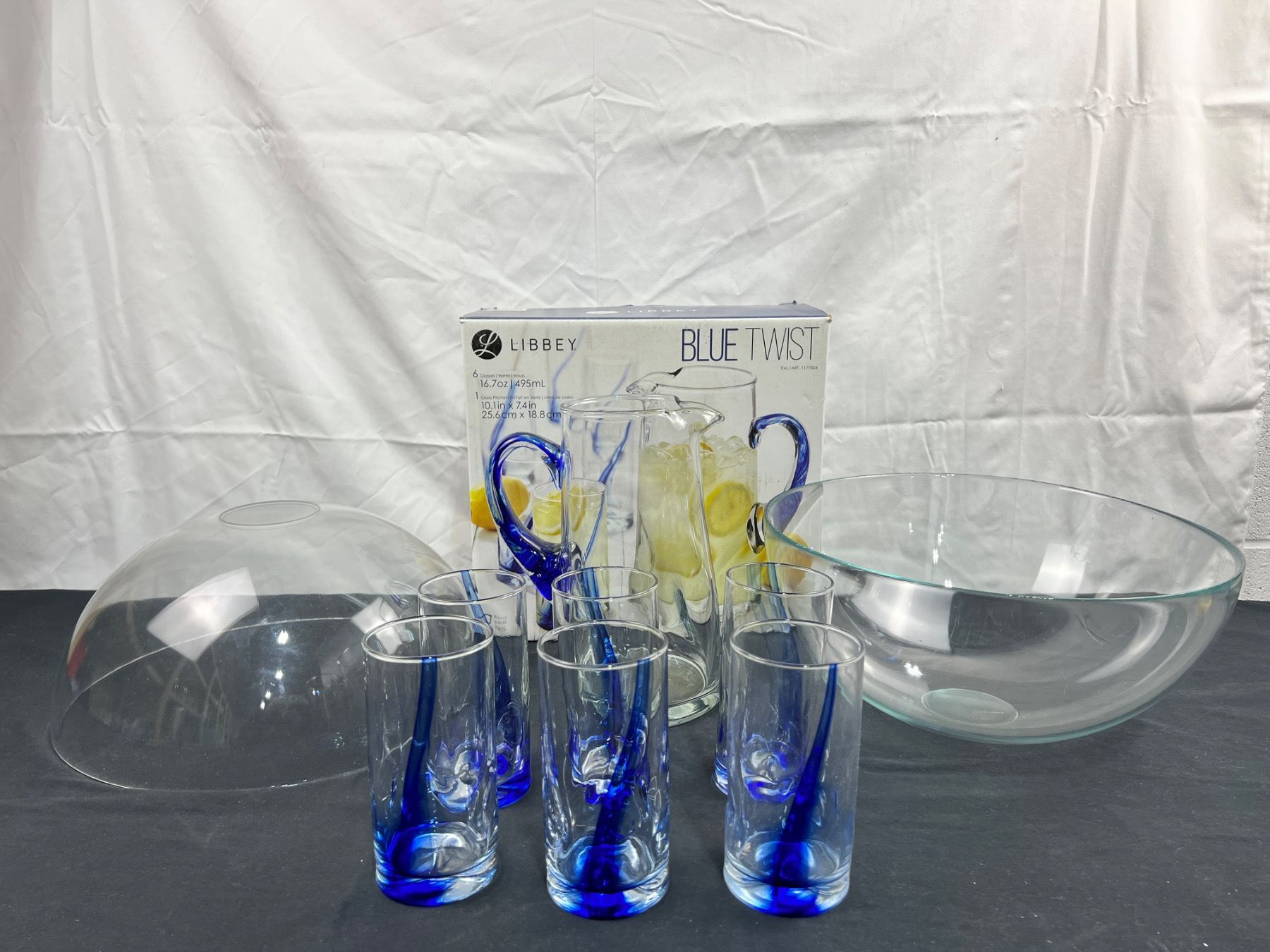 Includes Libbey Blue Twist set (open box), Two large glass serving bowls (14"diameter x 6.5"H)
