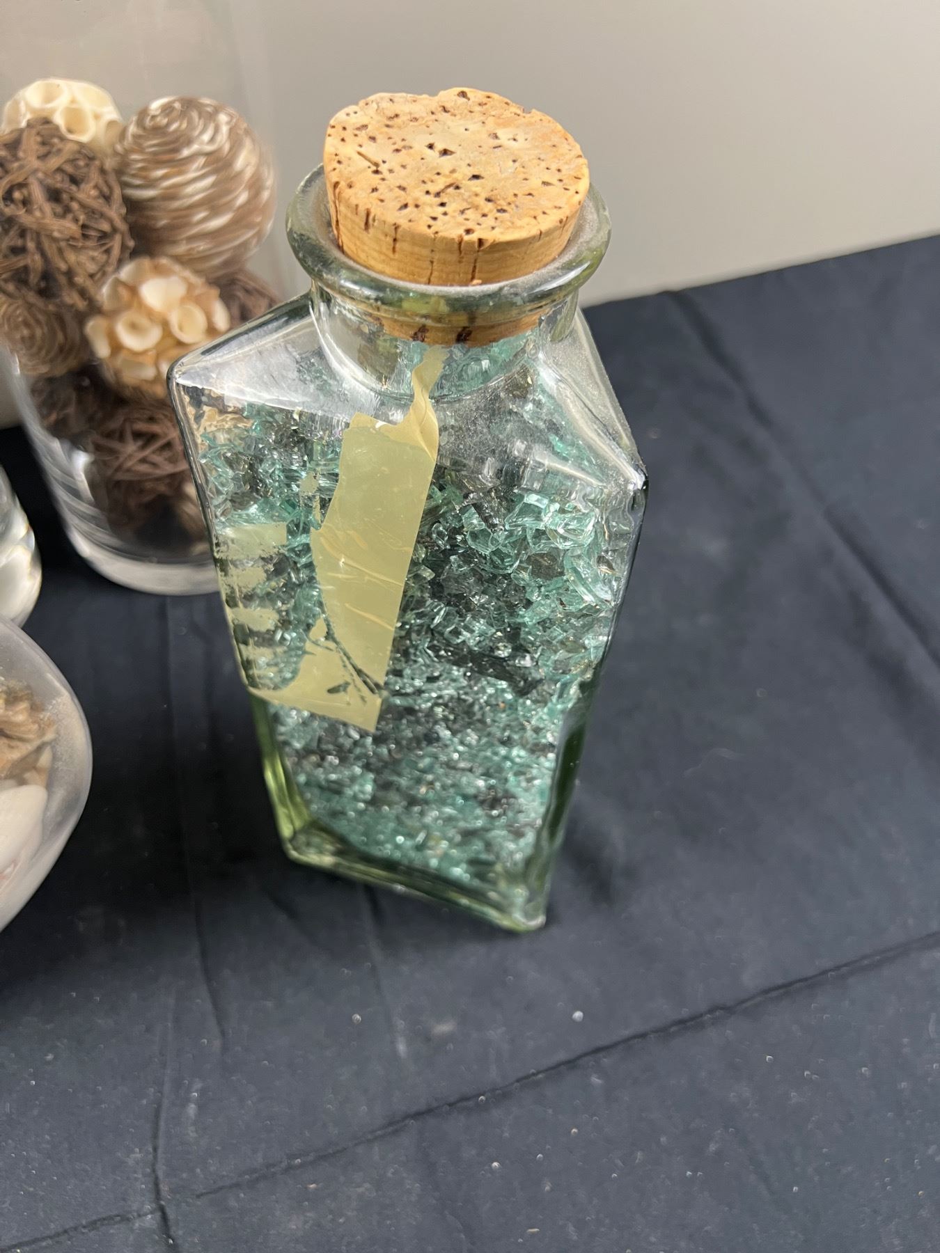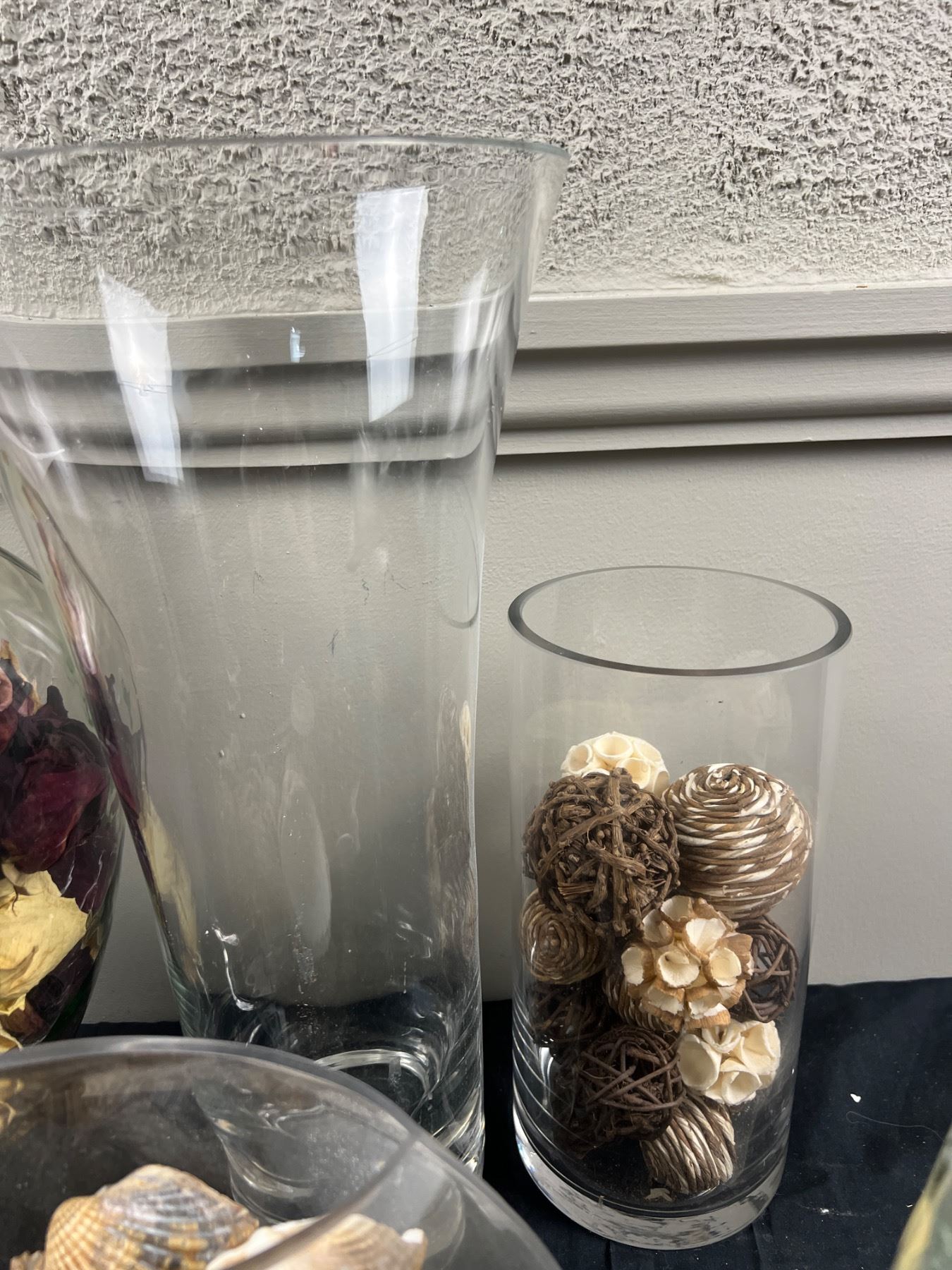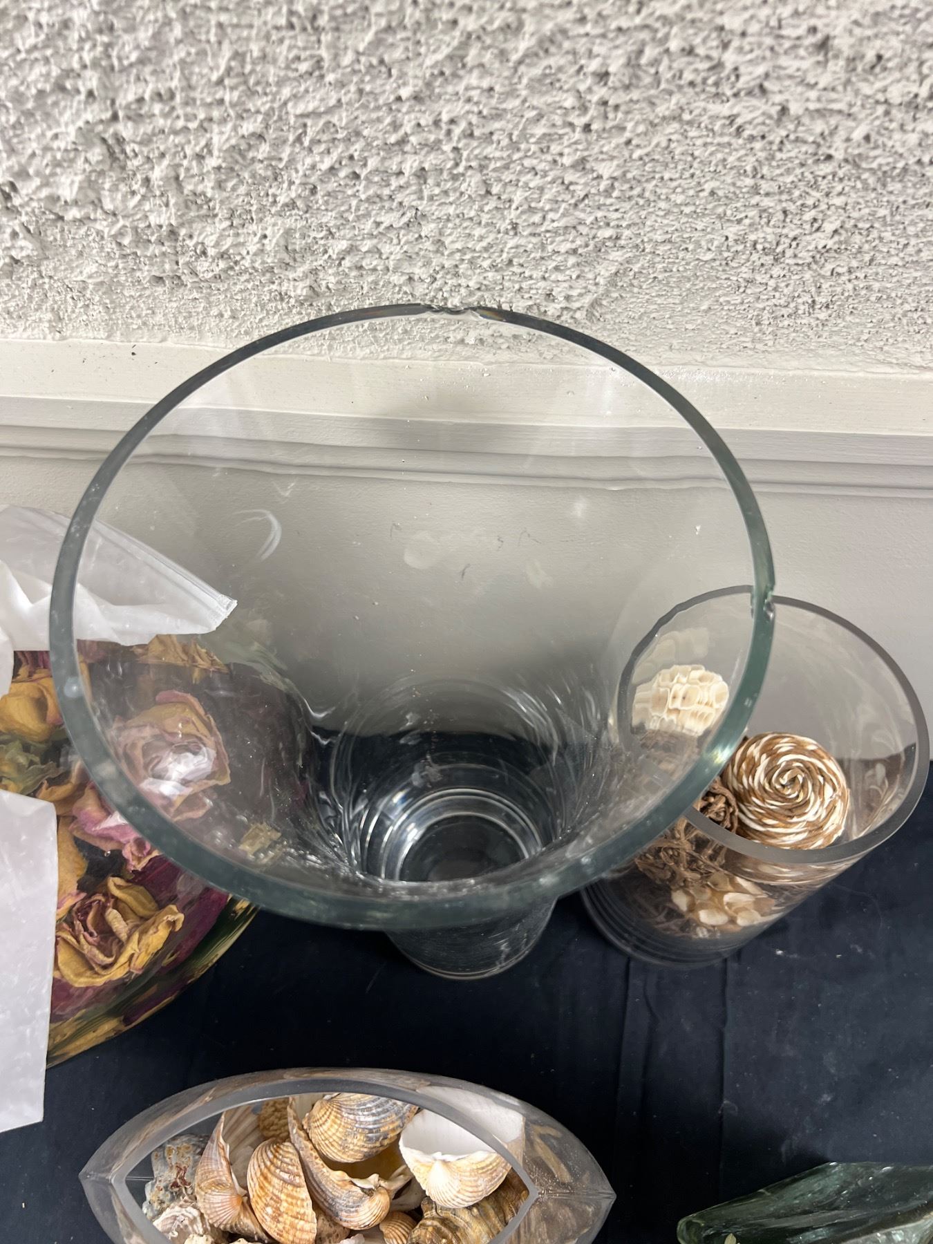 Some tape and residue stuck to bottle. Damage to large vase rim. Large vase is 16" tall